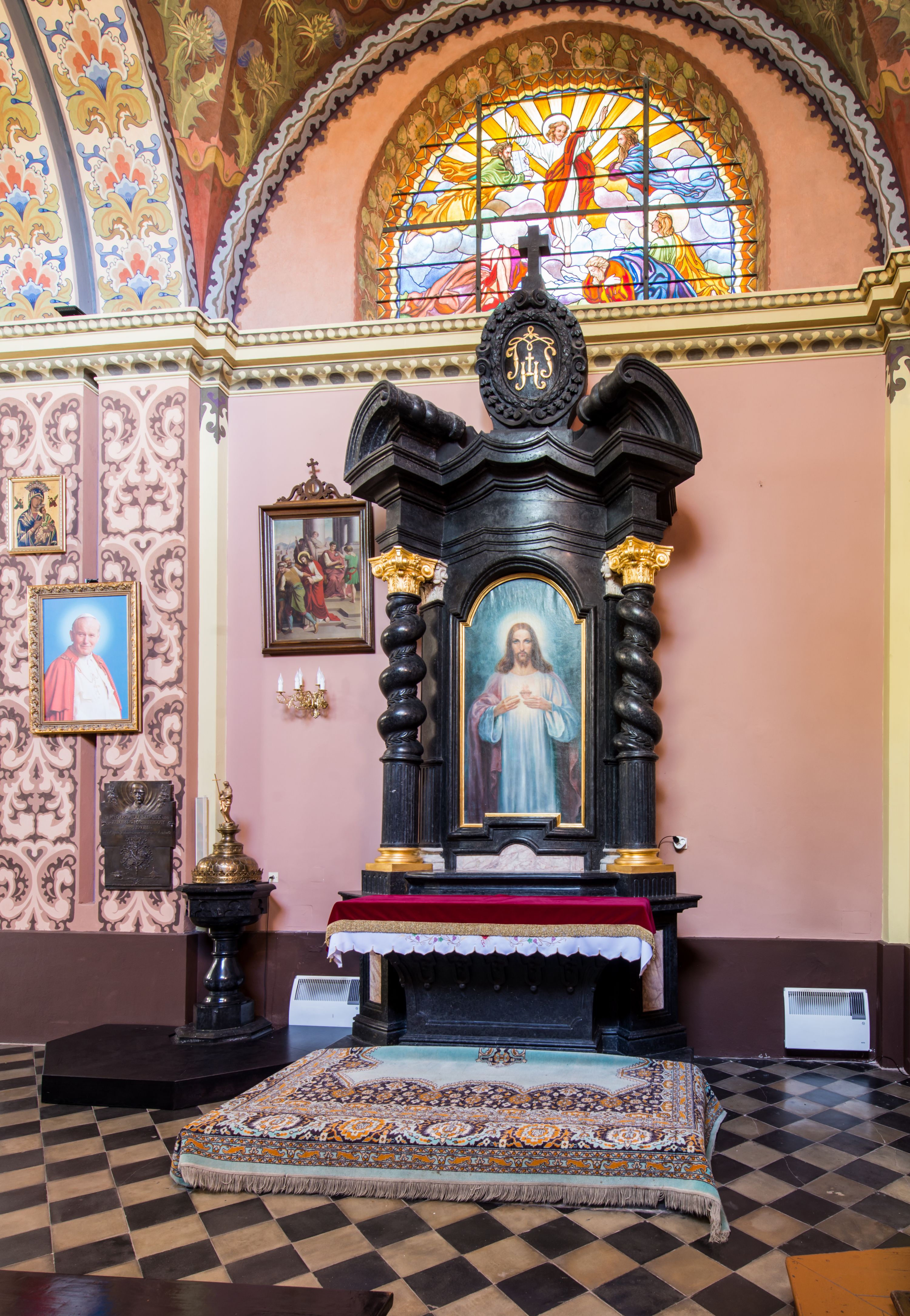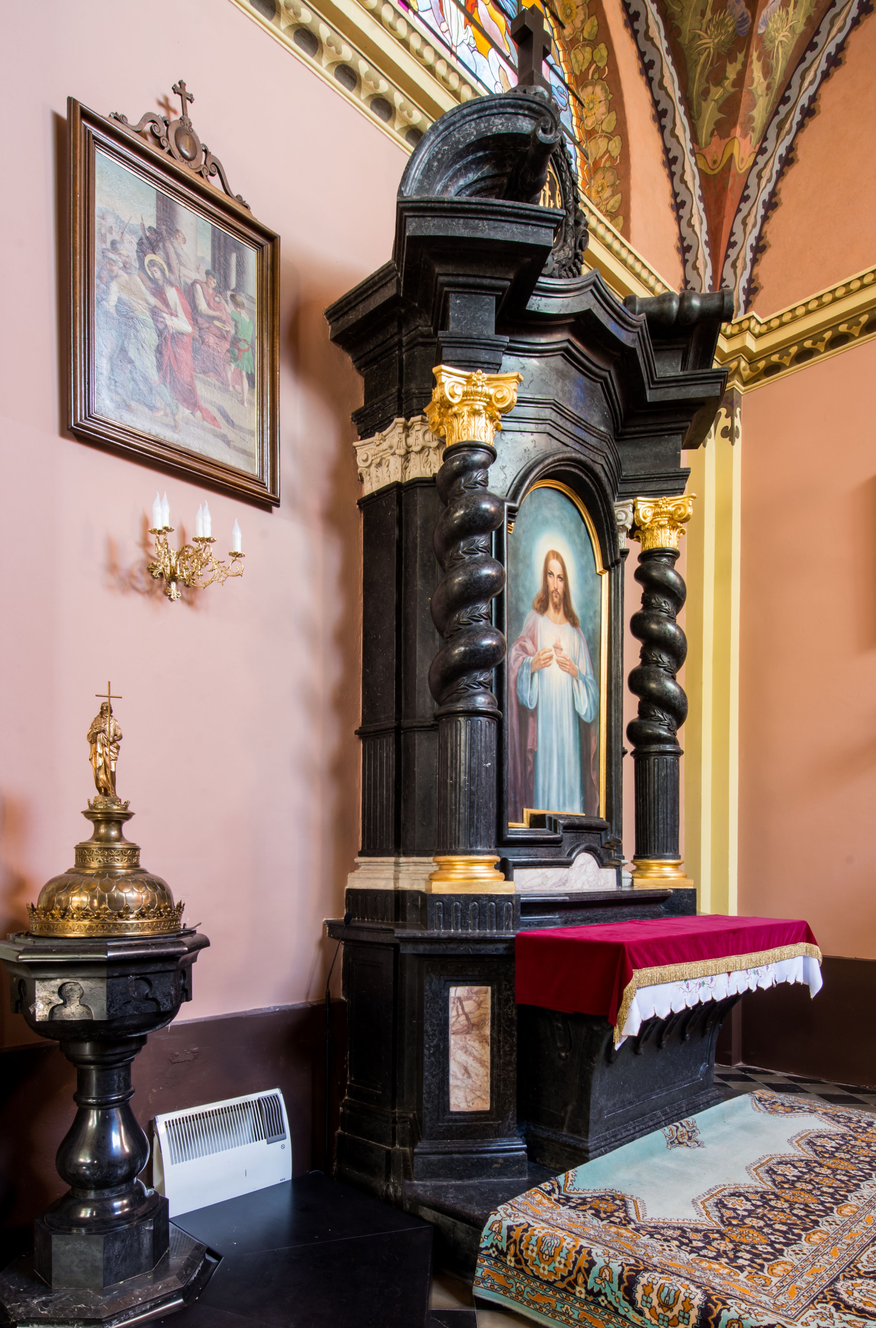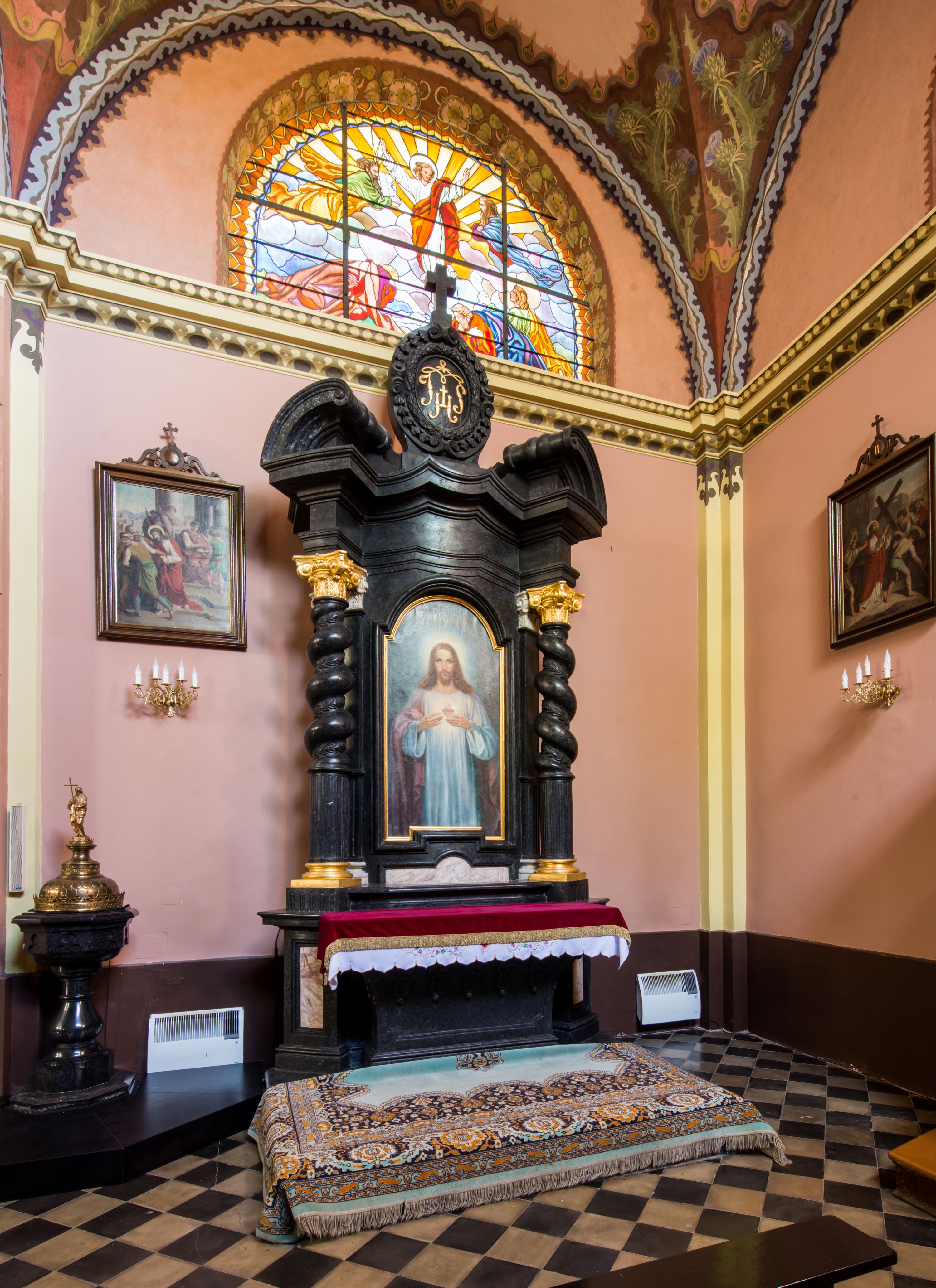 Ołtarz prostopadłościenny, w typie tumbowym, z mensą o brzegu zdobionym rzędem liści akantu naprzemian z łukami kotarowymi zwieńczonymi kulami oraz podwieszonym lambrekinem. Nastawa ołtarzowa jest architektoniczna, jednoosiowa ze zwieńczeniem, ujęta przez kolumny stojące na ukośnie dostawionych cokołach. Kolumny w jednej trzeciej kanelowane w dwóch trzecich skręcone z wplecioną wicią roślinną, ze złoconym kapitelem podtrzymują przerwany przyczółek ze ślimacznicami. Belkowanie bogato profilowane nad częścią środkową jest wyłamane trzema wklęsłymi łukami. W szczycie owalny medalion z monogramem "IHS”, w obramieniu z wieńca laurowego, ślimacznim z festonami, zakończony krzyżem. W osi środkowej prostokątna wnęka w profilowanym obramieniu, zamknięta półkolistym łukiem nadwieszonym z obrazem Najświętszego Serca Jezusowego.
