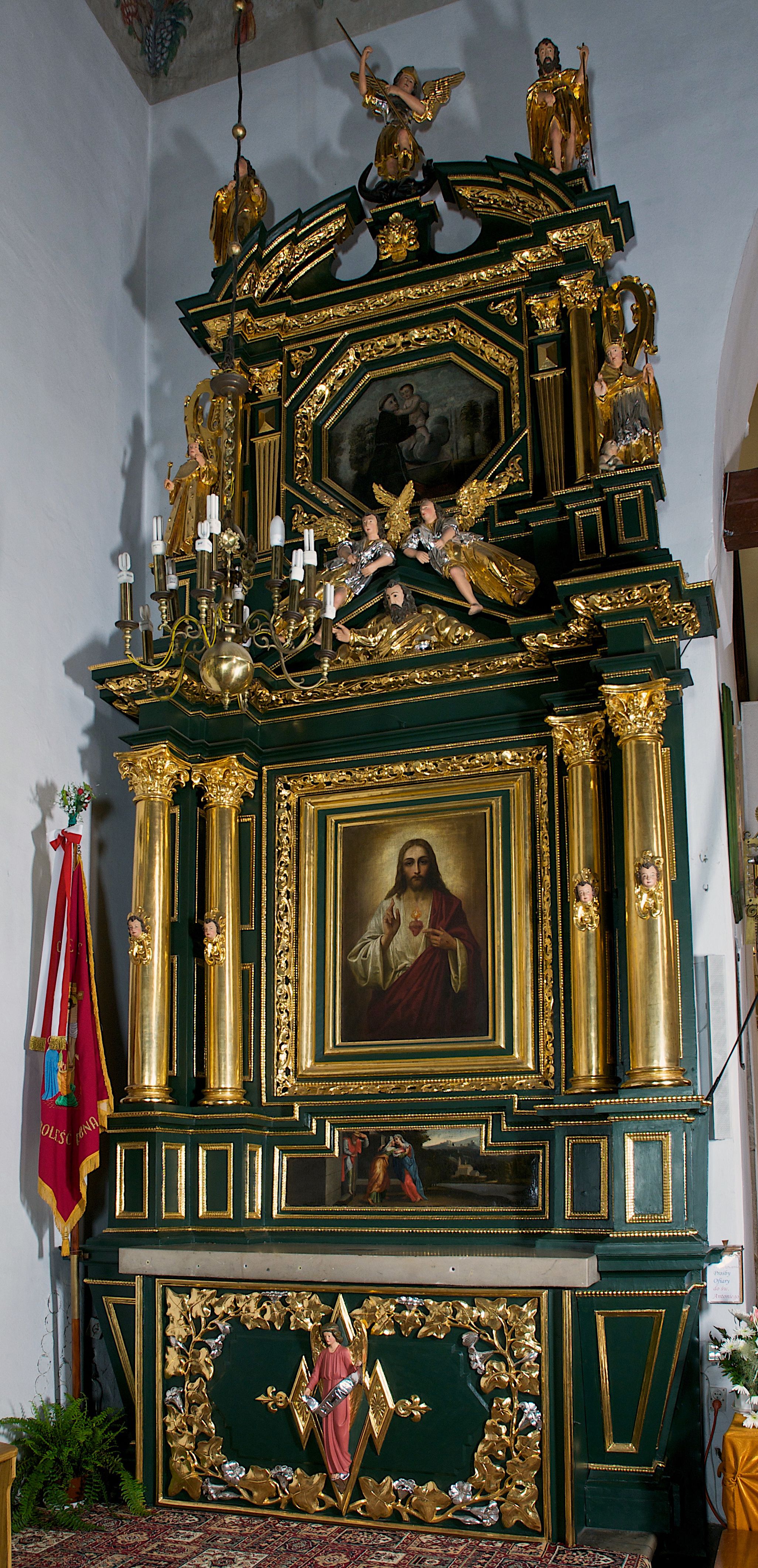 Ołtarz ustawiony na kamiennym podwyższeniu, przyścienny, architektoniczny, jednoosiowy, dwukondygnacyjny ze zwieńczeniem. Podstawa ołtarza skrzyniowa, na niej kamienna mensa z centralnie umieszczonym portatylem. Antepedium późne (secesyjne), datowane na odwrocie „1914”, ozdobione figurą anioła trzymającego wstęgę z napisem „AVE MARIA” i rzeźbionym ornamentem ze złoconych liści winogron i srebrzonych lilii. Retabulum jest flankowane dwiema parami ustawionych uskokowo i osadzonych na wysokich cokołach kolumn kompozytowych, ozdobionych główkami aniołków ujętych dekoracją małżowinową. Kolumny dźwigają belkowanie z wydatnym, przełamującym się gzymsem ozdobionym ornamentem małżowinowym. Nad belkowaniem trójkątny przyczółek z rzeźbioną figurą Boga Ojca w polu tympanonu i figurami aniołów na jego bokach. Druga kondygnacja ołtarza jest flankowana pojedynczymi kolumienkami i kanelowanymi pilasterkami korynckimi, ustawionymi na wysokich cokołach. Boki ozdobione uszami w kształcie małżowiny. Na zewnątrz kolumn, na osiach kolumn zewnętrznych niższej kondygnacji, ustawione na impostach figury: św. Kazimierza po lewej stronie, św. Stanisława po prawej. Kolumny podpierają belkowanie z przełamującym się gzymsem ozdobionym ornamentem małżowinowym, ponad którym zwieńczenie w formie przyczółka odcinkowego przerwanego. Łuk przyczółka profilowany z uskokami, dekorowany ornamentem małżowinowym. Pośrodku zwieńczenia, w przerwanym przyczółku rzeźba św. Michała Archanioła, ustawiona na wysokim cokole z dekoracją w formie bukietu granatów otoczonych liśćmi akantu. Po bokach, na osiach kolumn rzeźbione figury: św. Barbary po lewej stronie i św. Jana Chrzciciela po stronie prawej. Pomiędzy impostami kolumn, w predelli profilowana płycina w kształcie leżącego prostokąta z wyciętymi uskokowo górnymi narożnikami. W niej obraz olejny na płótnie (przyklejony do struktury) ze sceną Nawiedzenia św. Elżbiety. W polu środkowym pierwszej kondygnacji obraz z przedstawieniem Najświętszego Serca Pana Jezusa w profilowanej ramie w kształcie stojącego prostokąta, ozdobionej ornamentem małżowinowym. W drugiej kondygnacji pole środkowe w kształcie prostokąta leżącego (zbliżonego do kwadratu), obwiedzione frezowaną ramką, z wpisaną w nią ramą o kształcie oktagonalnym, profilowaną i ozdobioną ornamentem małżowinowym, z obrazem przedstawiającym św. Antoniego. Strukturę retabulum, a także prostokątne płyciny zdobiące cokoły i tło kolumn, podkreślają frezowane ramki. Kolumny, pilastry, kapitele, ornamenty, obramienia płycin i belkowania, frezowane ramki złocone. Ramy obrazów złocone i polichromowane. Rzeźby złocone, srebrzone i polichromowane.