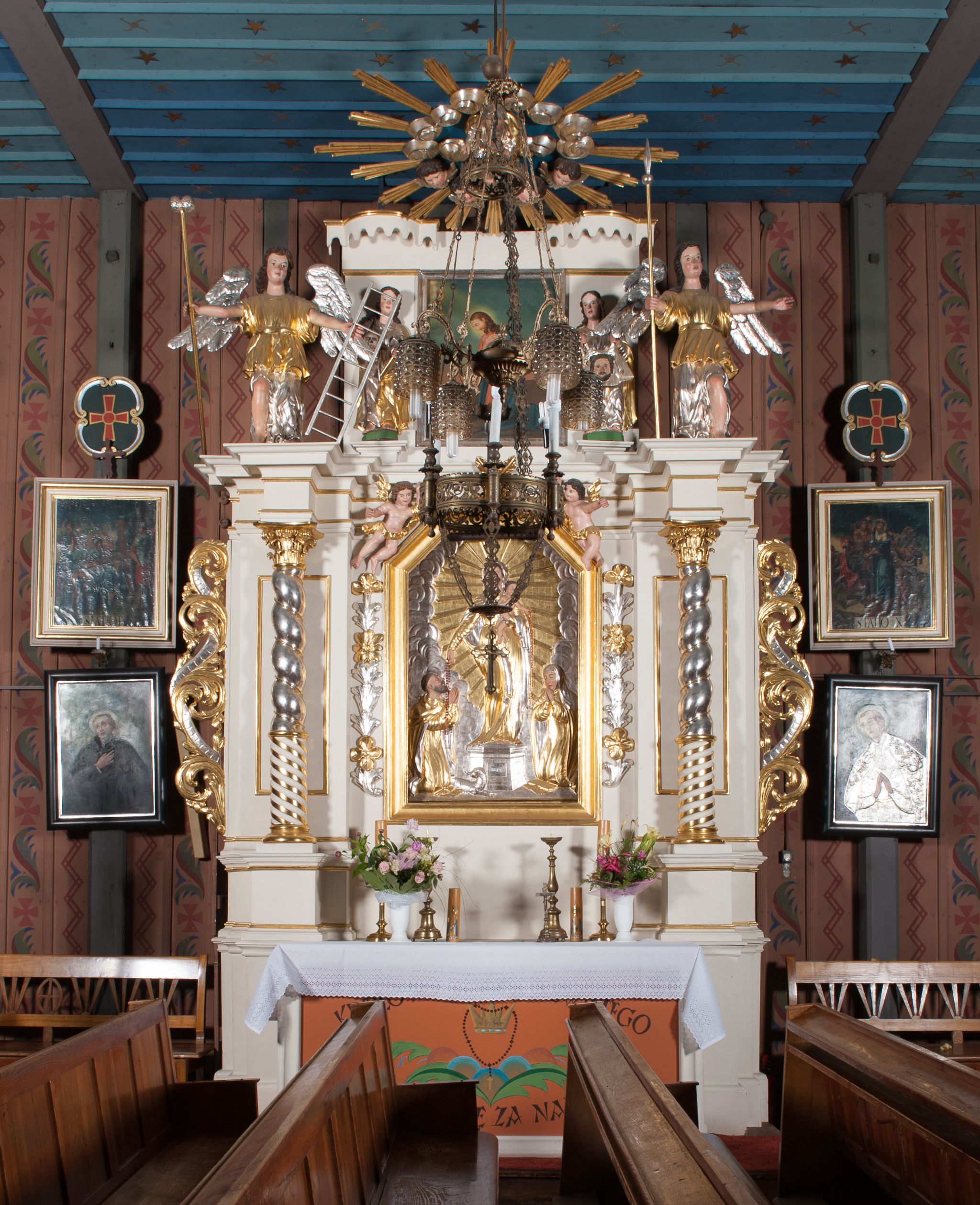 Nastawa architektoniczna, jednokondygnacyjna ze zwieńczeniem, ustawiona na dwustrefowym cokole, w górnej strefie z wyłamanymi, zdwojonymi prostopadłościanami. Ołtarz drewniany, prostopadłościenny, z drewnianą mensą. Antepedium ujęte profilowaną ramą, w polu na pomarańczowym tle namalowana korona otwarta z różańcem nad symetrycznie umieszczonymi liśćmi, z napisem „Królowo różańca świętego módl się za nami”. Nastawa ujęta parą kolumn o skręconych trzonach podzielonych na dwie strefy i kapitelach kompozytowych, ustawionych na tle wyłamanych ścianek bocznych nastawy. Podpory dźwigają pełne belkowanie, częściowo przerwane nad polem środkowym, wyłamane na ich osi. Na belkowaniu ustawione figury aniołów z arma Christi. Pole centralne wypełnione wnęką w formie stojącego prostokąta o ściętych górnych narożach, ujęte profilowaną ramą, z płaskorzeźbą Matki Boskiej Różańcowej. Wnęka flankowana ornamentem roślinnym, w przyłuczach dwa putta. Kondygnacja ujęta uszami utworzonymi z akantu i wstęgi. Zwieńczenie w formie leżącego prostokąta. W polu obraz Chrystusa w Ogrójcu o kształcie zbliżonym do kwadratu, ujęty profilowaną ramą. Obraz flankują figury św. Marii Magdaleny i św. Weroniki, nad którymi znajdują się baldachimy ze stylizowanym lambrekinem. Całość zwieńczona płaskorzeźbą tronującego Boga Ojca pośród obłoków i uskrzydlonych główek anielskich, w glorii promienistej. Struktura polichromowana w kolorze białym, profile złocone, kolumny, ornamentyka złocone i srebrzone.