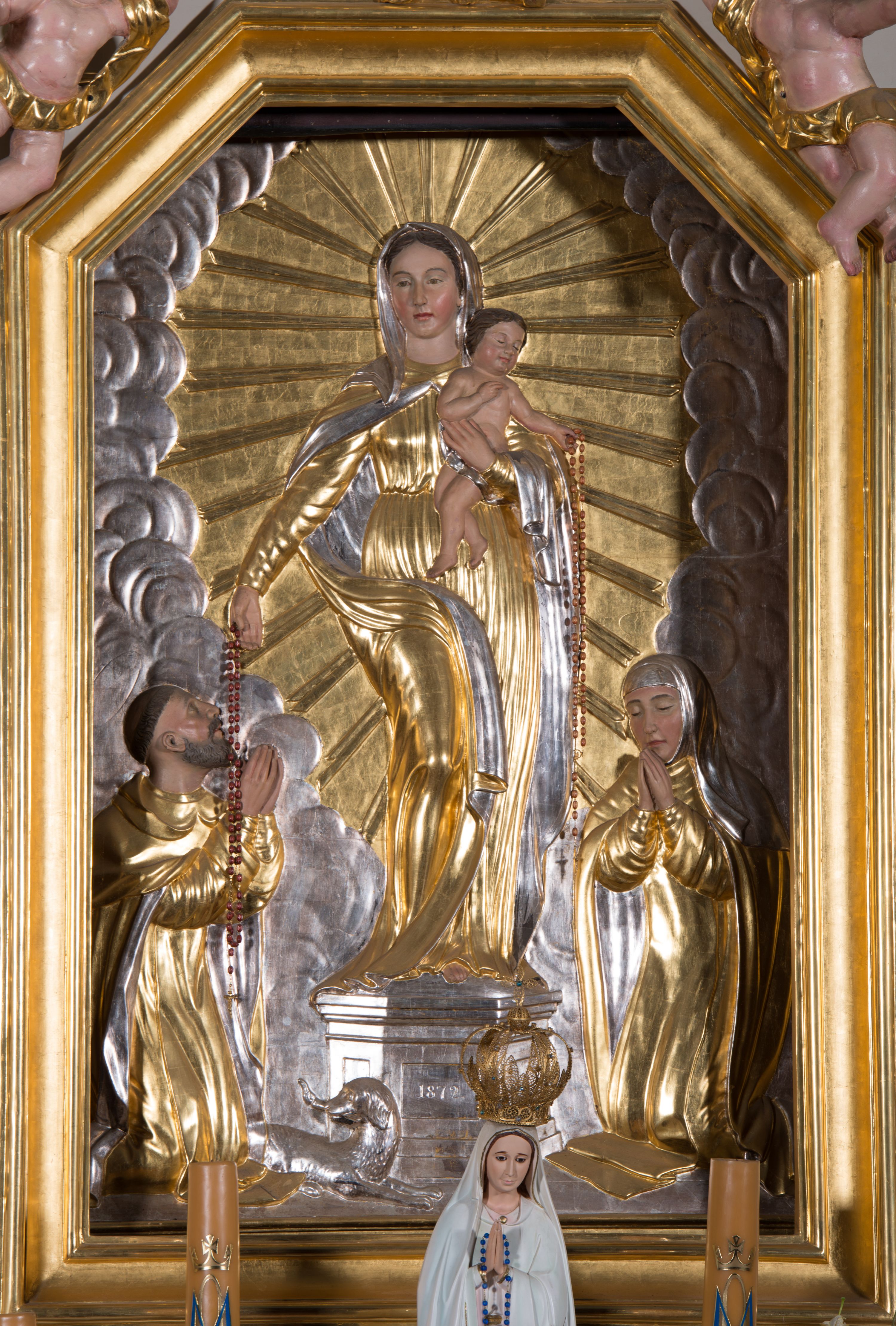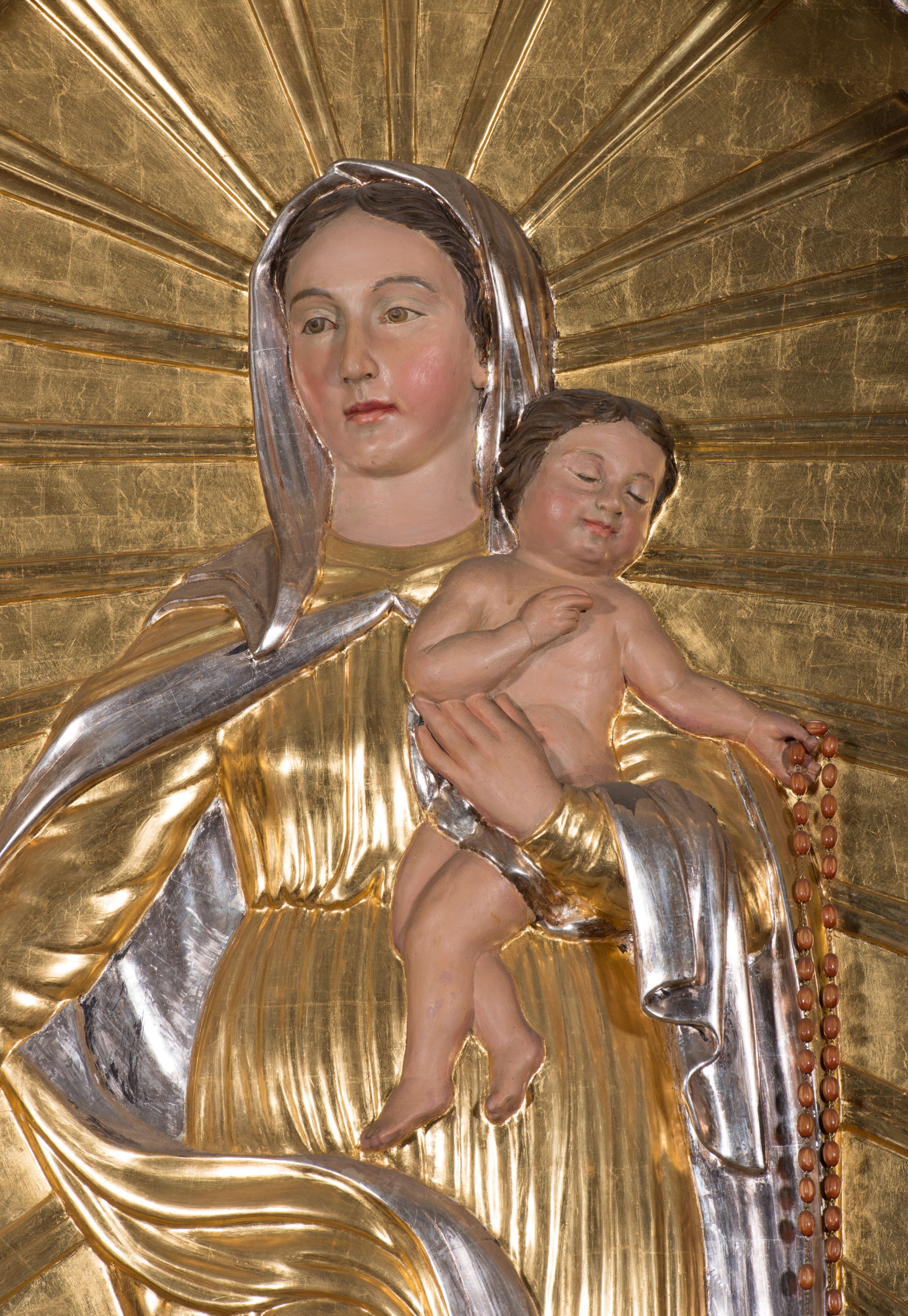 Struktura pierwszej kondygnacji nastawy jest bardzo zbliżona do ołtarzy powstających w Małopolsce na przełomie XVII i XVIII wieku. Jest to szczególnie widoczne w jej płaskim licu, wyłamanym jedynie na osi podpór oraz dzięki kręconym trzonom kolumn, które były szczególnie popularne w pierwszej połowie XVIII wieku. Dekoracja rzeźbiarska i ornamentalna nastawy (akant, wstęga) również nosi cechy pozwalające ją datować na pierwszą połowę XVIII wieku. Najprawdopodobniej w drugiej połowie XIX wieku struktura nastawy była przebudowana, o czym świadczy zupełnie bezstylowe zwieńczenie, w które zostały wmontowane dawne figury i nowy obraz Chrystusa w Ogrójcu. Dekoracja rzeźbiarska ołtarza z postaciami św. Marii Magdaleny, św. Weroniki oraz aniołami z arma Christi może wskazywać na to, że nastawa pierwotnie miała ikonografię pasyjną, a więc mogła być pod wezwaniem Ukrzyżowania lub Zdjęcia z krzyża itp. Natomiast wtórnie została przystosowana do funkcji ołtarza Matki Boskiej Różańcowej, poprzez wmontowanie w jej pole główne płaskorzeźby Marii ze świętymi.