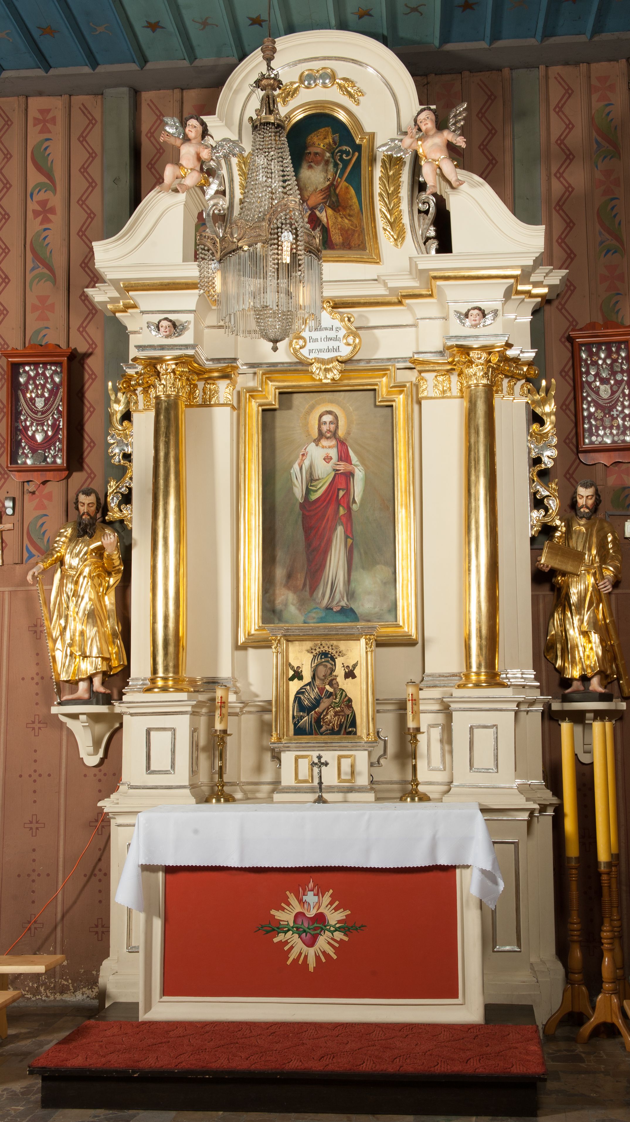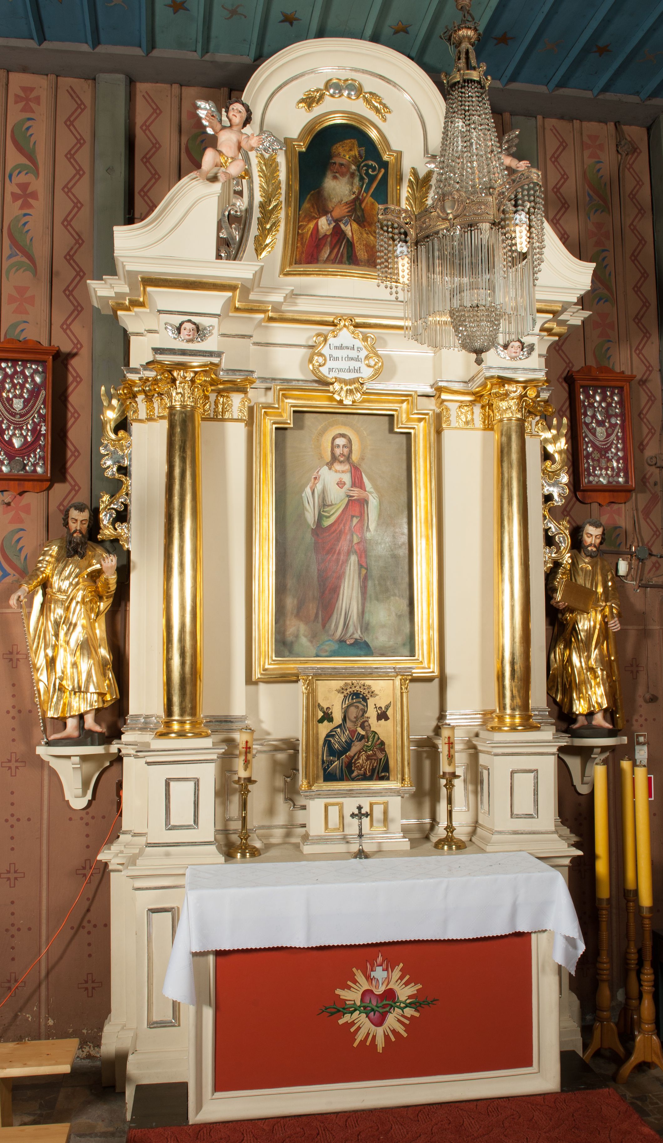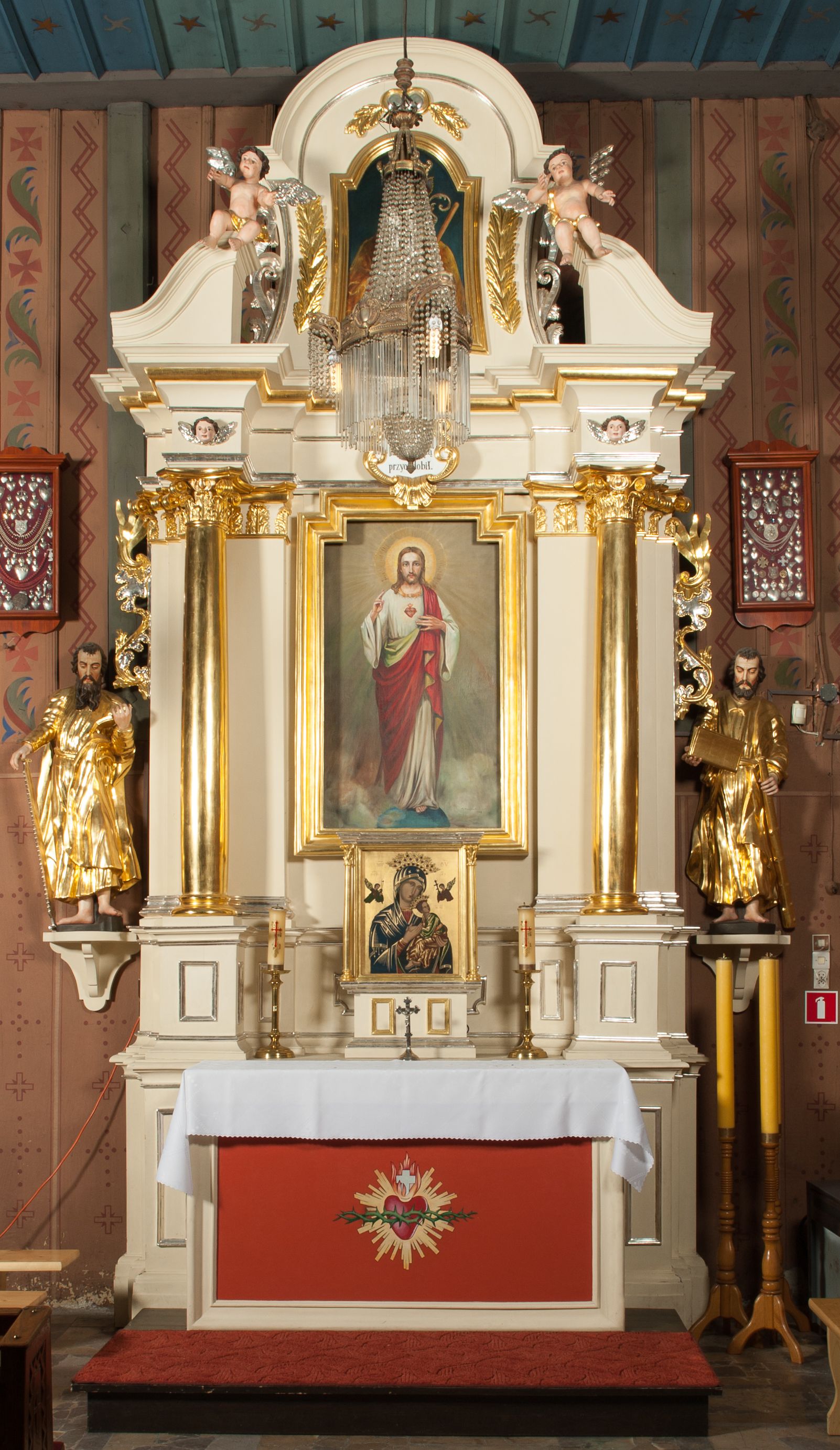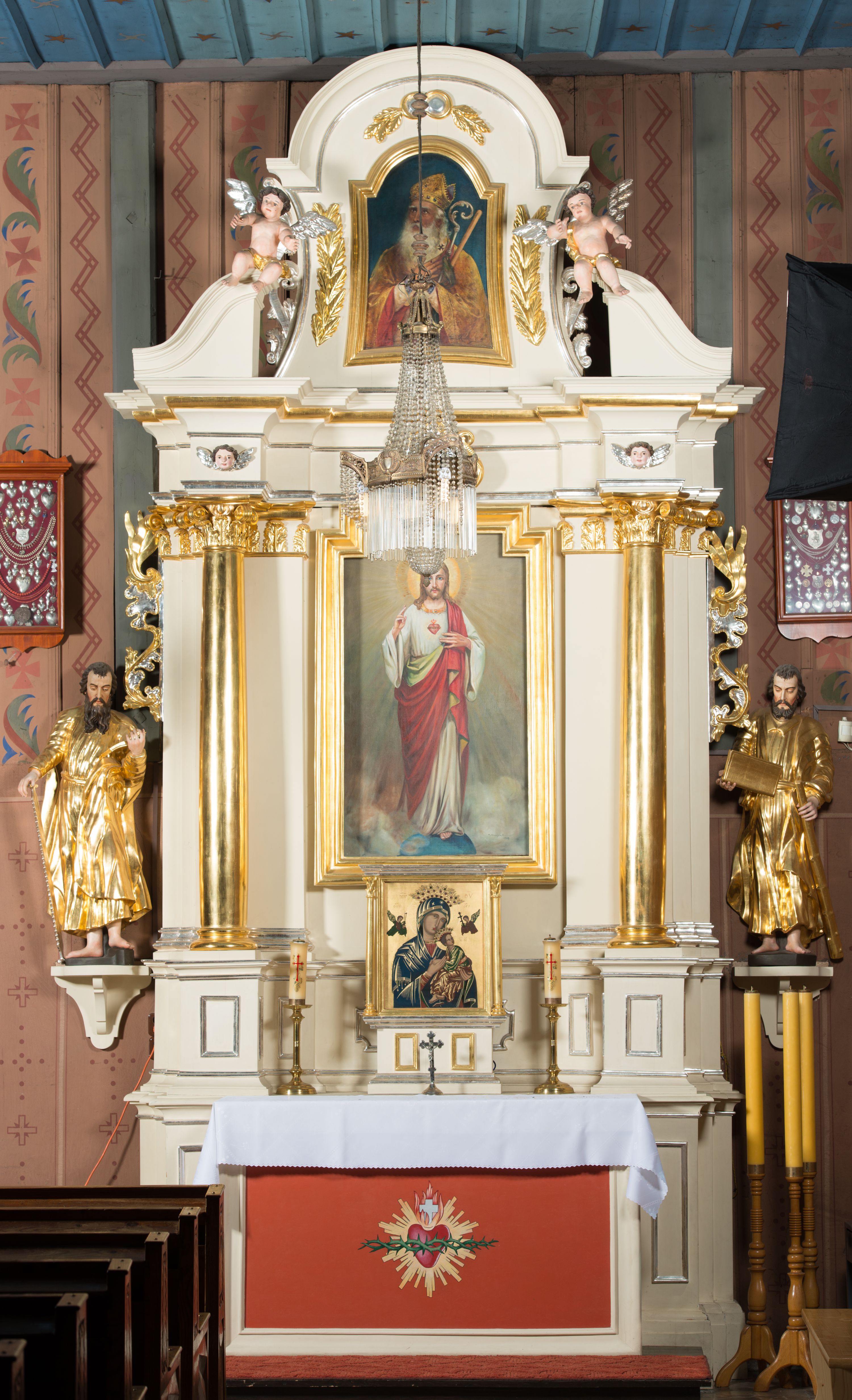 Nastawa architektoniczna, jednoosiowa, jednokondygnacyjna ze zwieńczeniem, ustawiona na dwustrefowym cokole, w górnej strefie z wyodrębnionymi dwoma prostopadłościanami. Ołtarz drewniany, prostopadłościenny, z drewnianą mensą. Antepedium ujęte profilowaną ramą z przedstawieniem gorejącego serca na czerwonym tle. Nastawa flankowana parą kolumn o kapitelach kompozytowych stojących na tle zwielokrotnionych pilastrów. Kolumny wspierają belkowanie wyłamane na ich osi oraz fragmenty falistego, przerwanego przyczółka z siedzącymi puttami. Pośrodku belkowania kartusz ujęty wieńcem laurowym z napisem „Umiłował go / Pan i chwałą / przyozdobił”. Całe pole główne wypełnione wnęką w formie stojącego prostokąta o wciętych górnych narożach, ujętego profilowaną ramą, z obrazem Najświętszego Serca Jezusa. Kondygnacja flankowana niewielkimi uszami utworzonymi ze stylizowanego akantu i wstęgi. Zwieńczenie w formie zbliżonej do kwadratu, o wklęsłych bokach dekorowanych ornamentem roślinnym, zamkniętego fragmentem gzymsu o kształcie łuku półkolistego nadwieszonego. W polu obraz św. Wojciecha o tej samej formie, w profilowanej ramie. Obraz ujęty z trzech stron ornamentem roślinnym. Nastawa flankowana figurami św. Szymona i św. Judy Tadeusza ustawionymi na wspornikach przy ścianie. Struktura polichromowana w kolorze białym, kolumny, profile złocone; ornamentyka złocona i srebrzona.