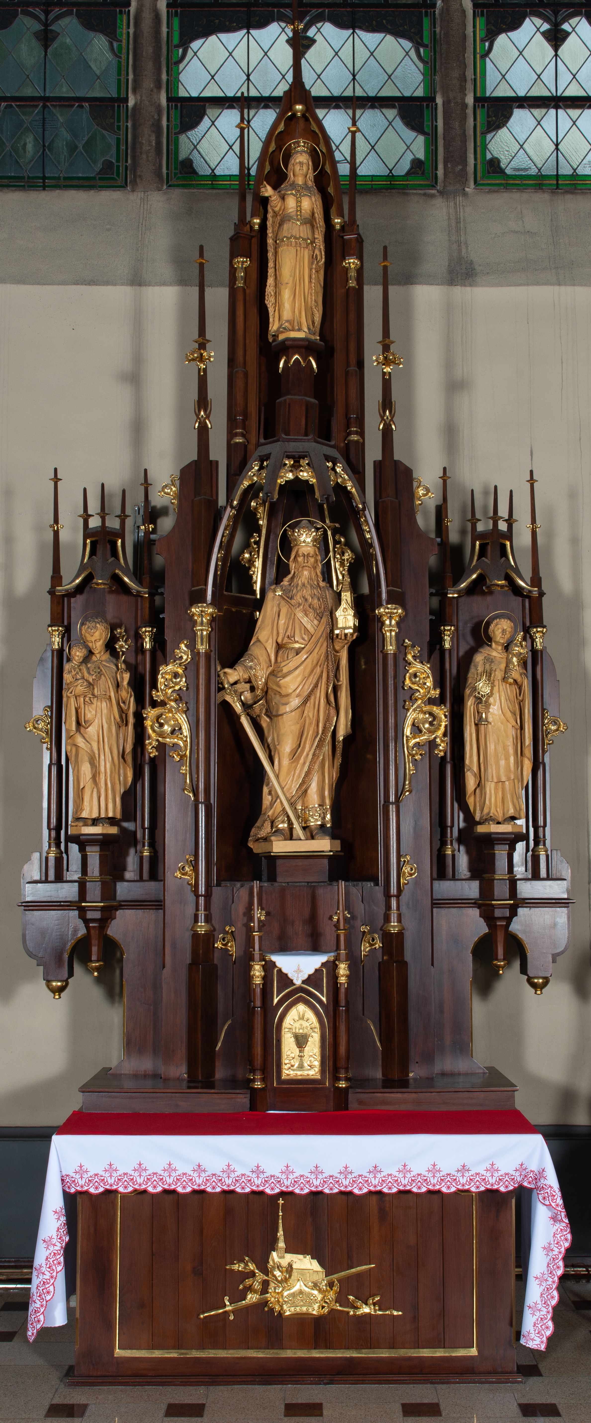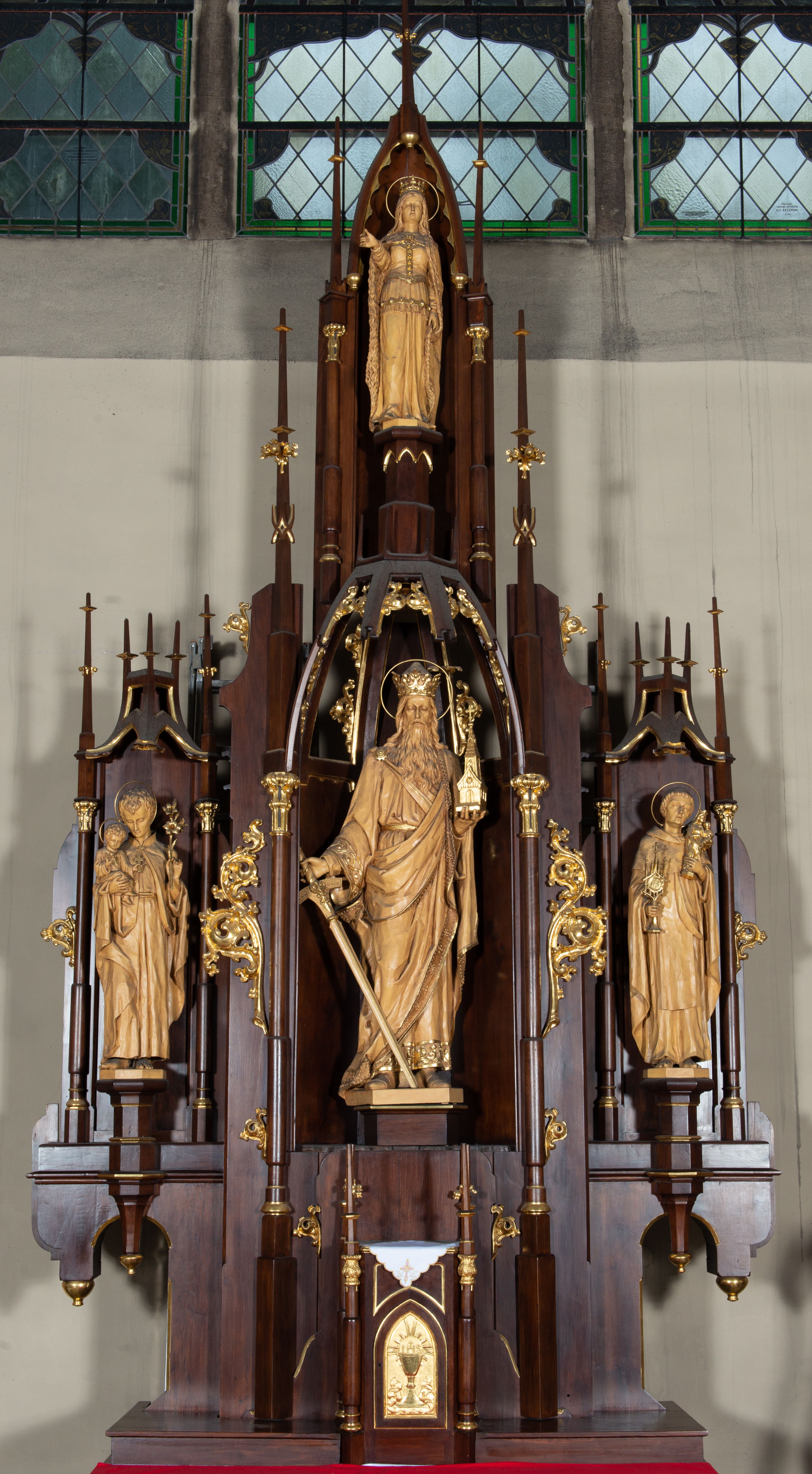 Nastawa architektoniczna, trójosiowa, jednokondygnacyjna ze zwieńczeniem, z predellą. Ołtarz drewniany, prostopadłościenny z drewnianą mensą i kamiennym portatylem. Antepedium ujęte ramą, w polu płaskorzeźbiona korona zamknięta ze skrzyżowanym mieczem i gałązką oliwną, na tle budynku kościoła. Na ołtarzu ustawione tabernakulum w formie drewnianej skrzynki ujętej kolumienkami z pinaklami. Drzwiczki w kształcie stojącego prostokąta zamkniętego łukiem ostrym z przedstawieniem kielicha z hostią w glorii. Nastawa w postaci trzech nisz, flankowanych kolumnami z pinaklami, zwieńczonych baldachimami. Środkowa największa, z figurą św. Zygmunta na cokole, w bocznych figury św. Stanisława Kostki i św. Jacka na wysokich, ośmiobocznych cokołach. Pomiędzy niszami gałązki astwerku. Zwieńczenie w formie niszy zamkniętej łukiem ostrym, ujętej stylizowanymi kolumienkami dźwigającymi pinakle. W niej ustawiona figura św. Jadwigi, na wysokim ośmiobocznym cokole.