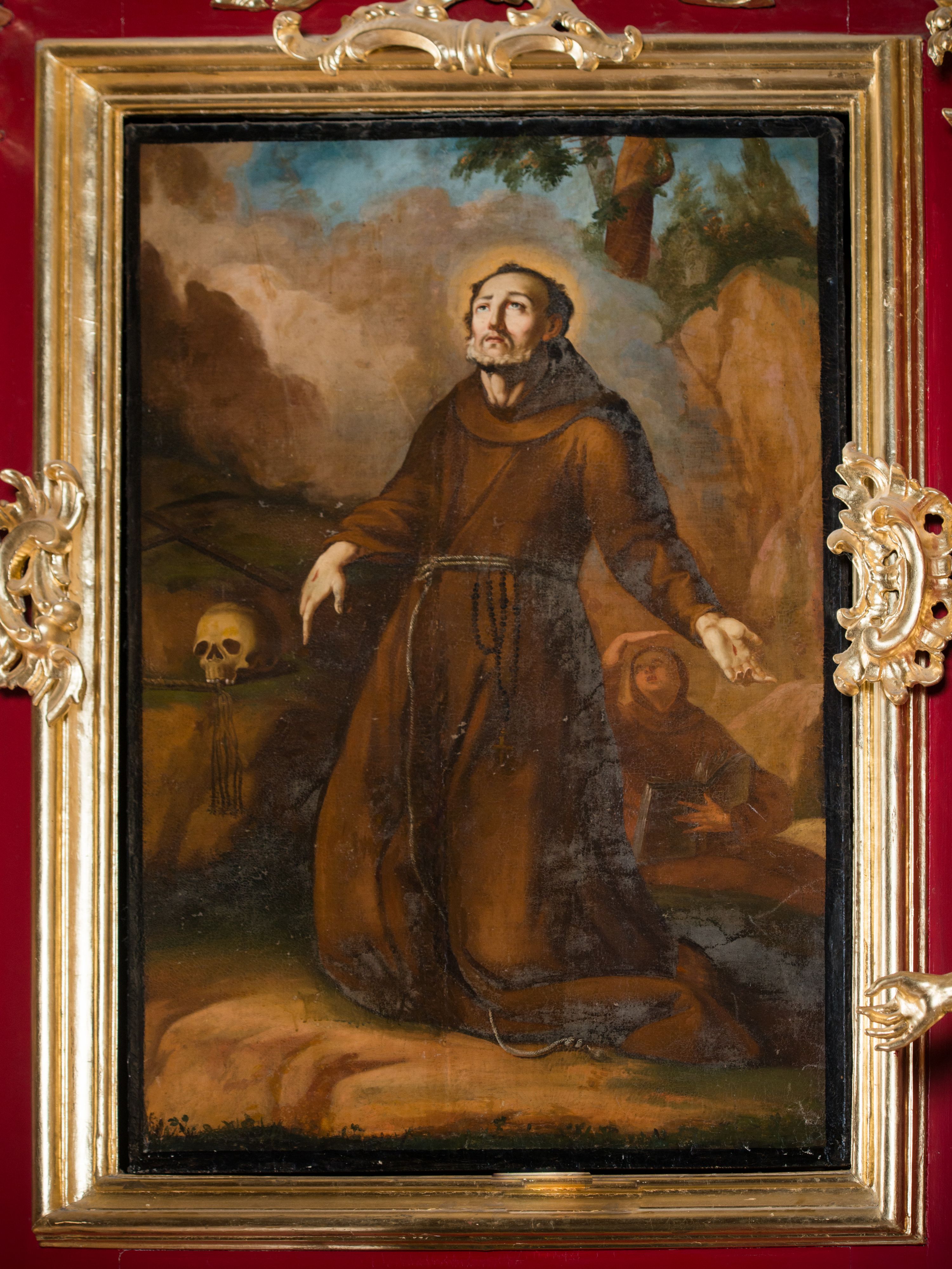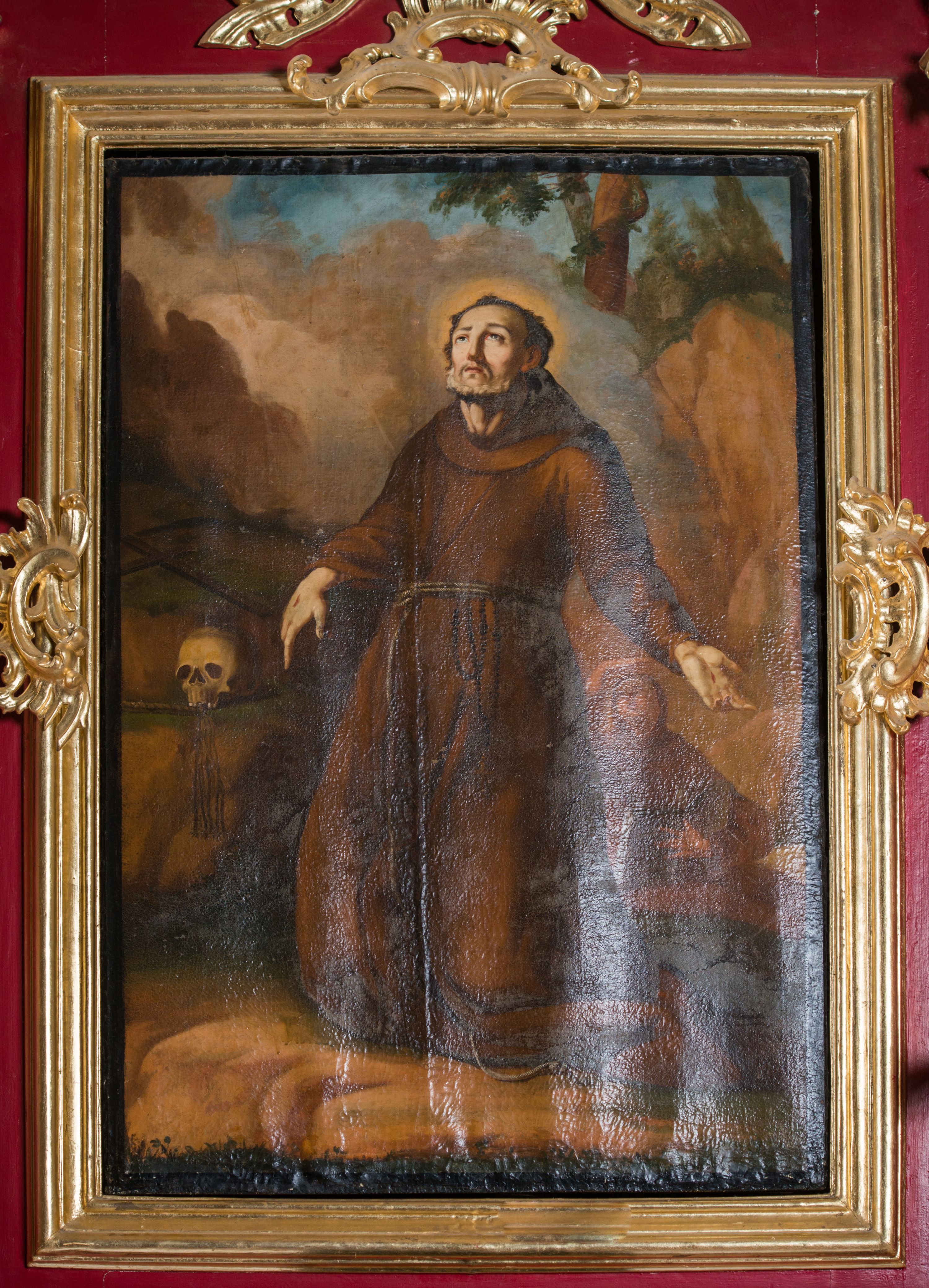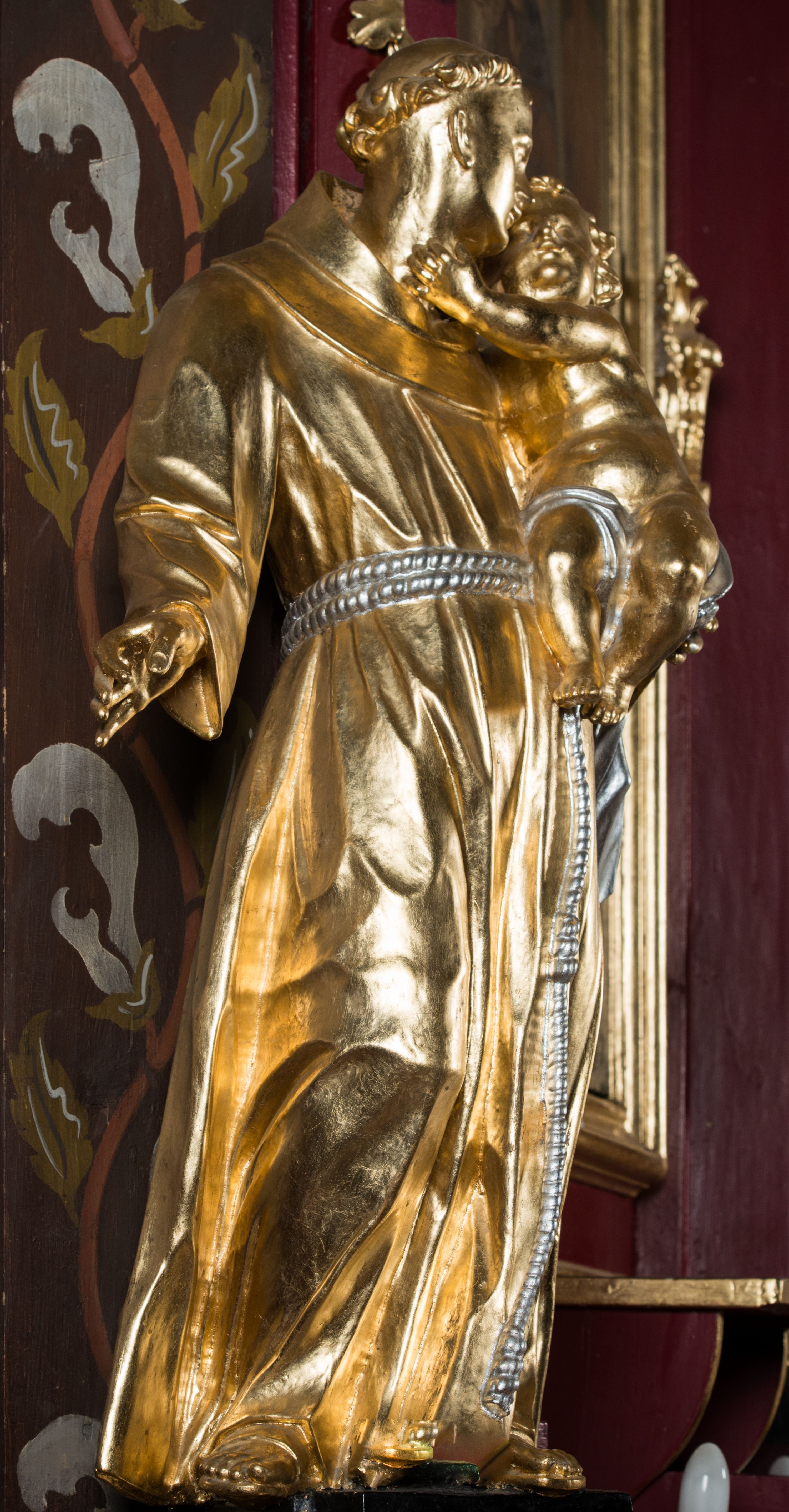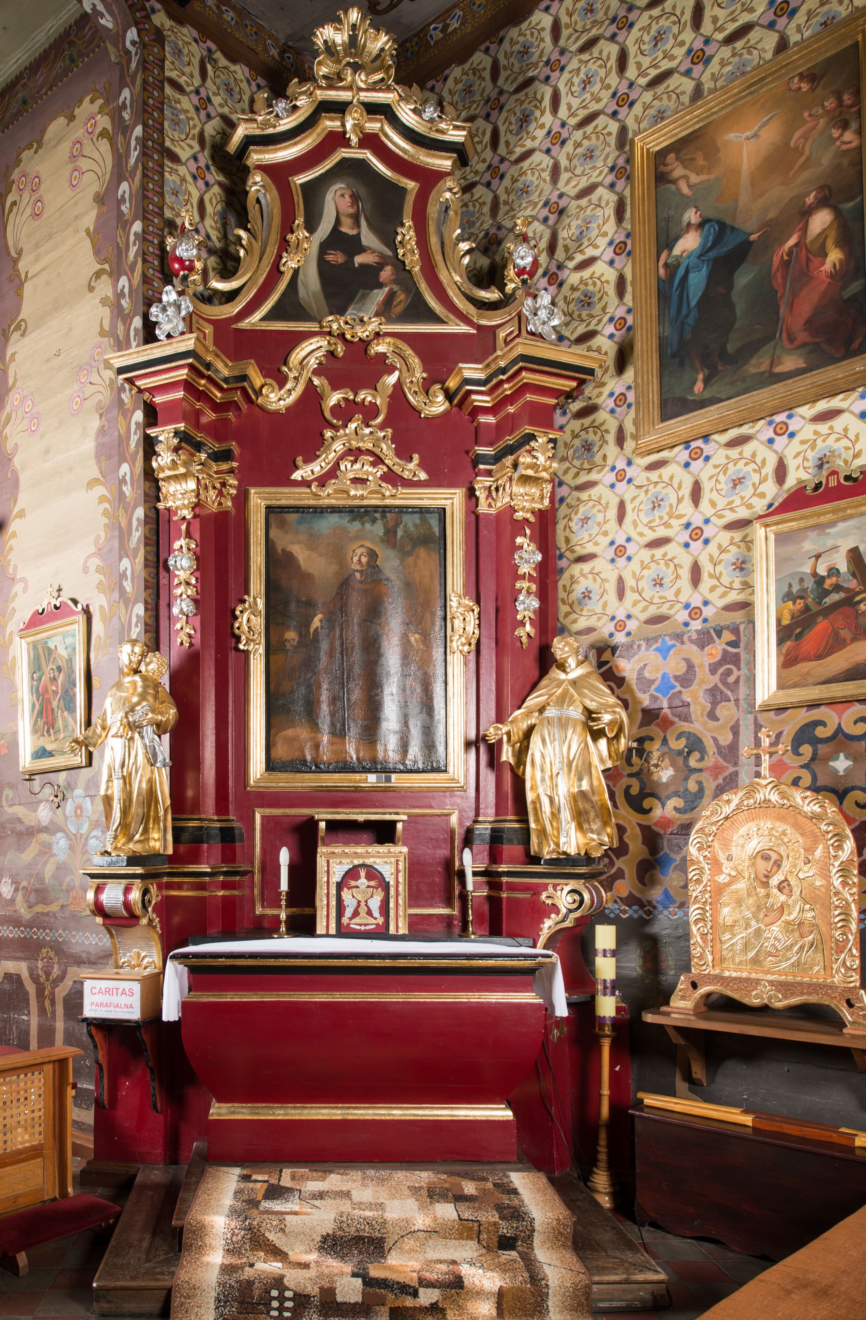 Nastawa architektoniczna, jednoosiowa, jednokondygnacyjna ze zwieńczeniem, na wysokim cokole z wyodrębnionymi konsolami. Ołtarz drewniany, sarkofagowy, na cokole, zwężający się ku dołowi z drewnianą mensą i kamiennym portatylem. Na mensie ustawione tabernakulum w formie prostopadłościennej skrzynki. Ścianka frontowa ujęta ornamentalnymi listewkami; drzwiczki w kształcie stojącego prostokąta w ornamentalnej ramie z płaskorzeźbionym przedstawieniem kielicha z hostią i winnym gronem. Nastawa ujęta parą zdwojonych pilastrów zwróconych pod kątem na zewnątrz, dekorowanych zwisami kwiatowymi, dźwigających silnie wysunięte imposty podtrzymywane przez konsole. Na tle pilastrów figury św. Antoniego Padewskiego i św. Franciszka ustawione na konsolach. W polu środkowym obraz św. Franciszka w formie stojącego prostokąta ujęty profilowaną ramą zdobioną rocaille'em. Powyżej wolutowe fragmenty rocaille'u, pod nim płycina. Zwieńczenie w formie trapezu ujętego spływami wolutowymi, dekorowanymi liśćmi palmowymi, ze ślimacznicami w kształcie meandru, spływającymi na belkowanie, na których stoją wazony. Całość zamknięta fragmentem wyłamanego trójbocznie gzymsu, zwieńczonego rokokowym szczytem z kwiatowymi gałązkami. W polu obraz św. Franciszki Rzymskiej w formie zbliżonej do zwieńczenia, ujęty ramą dekorowaną rocaille'em. Struktura polichromowana w kolorze głębokiej czerwieni, z czarnymi profilami oraz złoconymi ramami, profilami i ornamentyką.