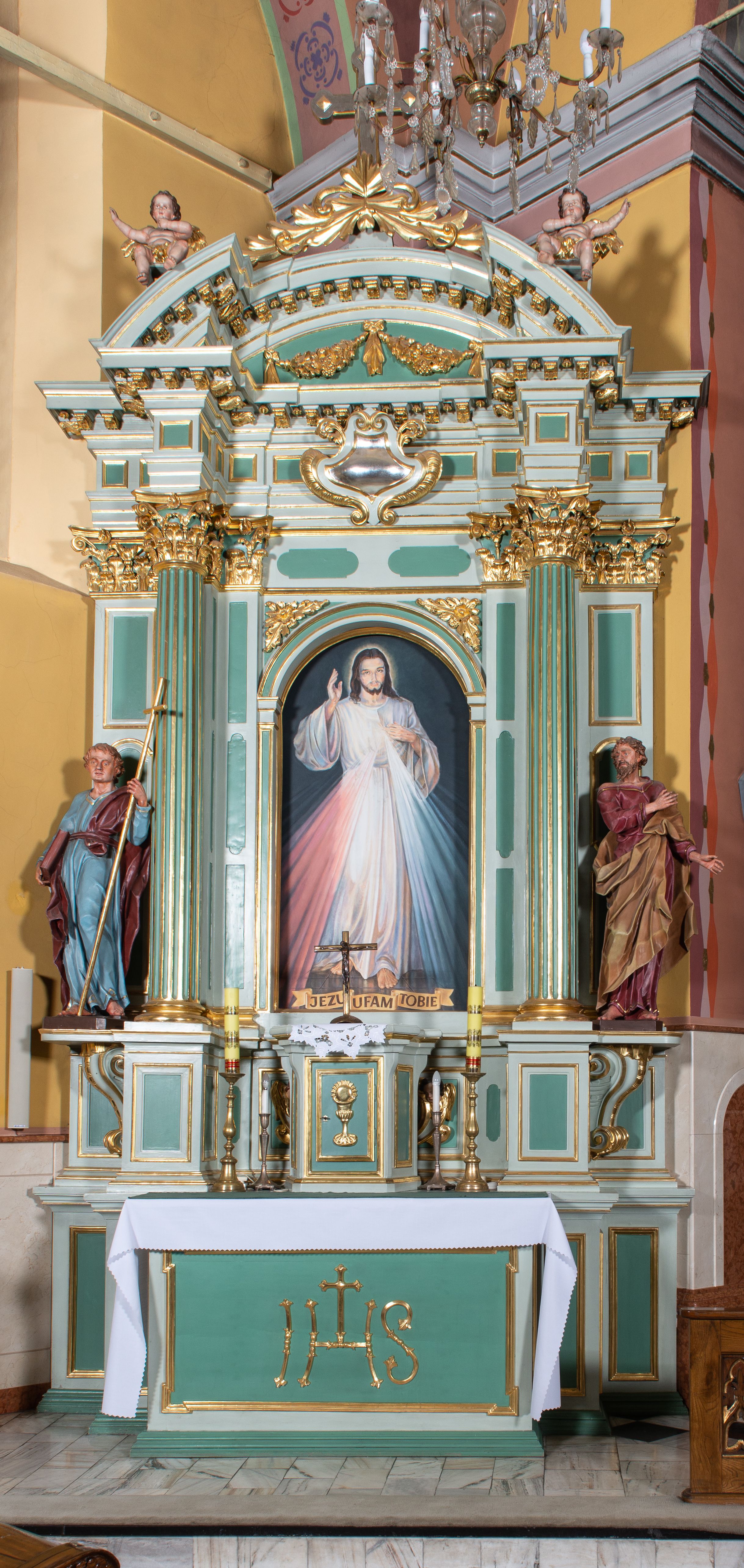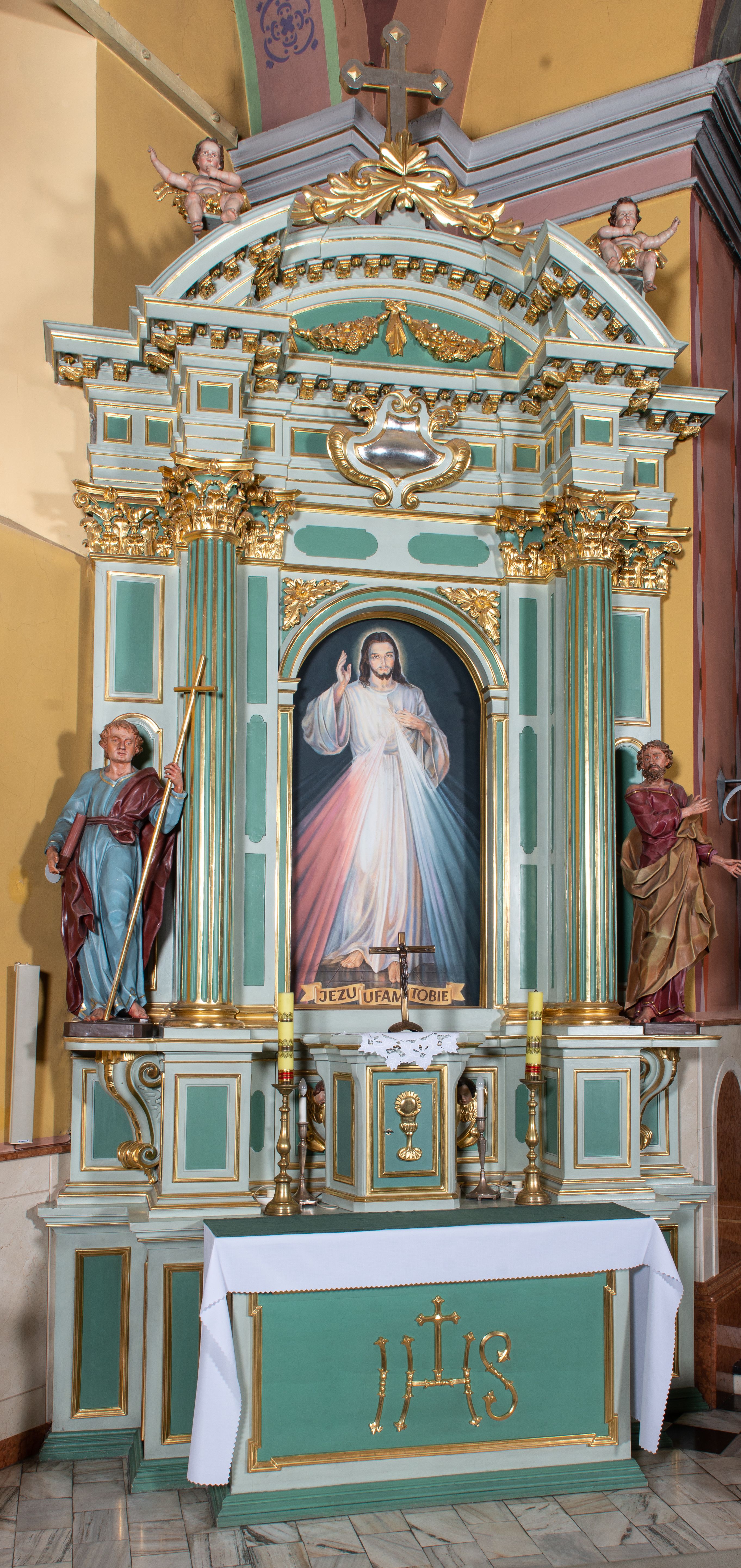 Ołtarz przyścienny, prostopadłościenny, z antepedium, na którym umieszczone są rzeźbione litery IHS; mensa drewniana z kamiennym portatylem. Na mensie znajduje się tabernakulum o kształcie graniastosłupa, z drzwiczkami ozdobionymi rzeźbionym kielichem z hostią. Nastawa ołtarzowa jest architektoniczna, jednoosiowa, jednokondygnacyjna ze zwieńczeniem. Osadzona na podwójnym postumencie, flankowana pilastrami o kompozytowych kapitelach i kanelowanymi kolumnami o kompozytowych kapitelach, które podtrzymują belkowanie. Ponad belkowaniem znajduje się przełamany przyczółek w formie łuku półkolistego, bogato profilowany, ozdobiony ulistnionymi konsolkami i rozetami oraz girlandami z owoców. W partii fryzu kartusz o fantazyjnym wykroju, ujęty wolutami i listkami akantu. Na belkowaniu siedzą po bokach nagie putta, odziane w opaski na biodrach, a pośrodku znajduje się krzyż osadzony na postumencie z liśćmi. Po obu stronach ołtarza na konsolach o krawędziach ozdobionych ornamentem małżowinowym stoją figury trudnych do identyfikacji świętych, być może apostołów. W centralnej części ołtarza wnęka prostokątna, zamknięta łukiem półkolistym. W niej obraz z przedstawieniem „Jezu ufam Tobie”.