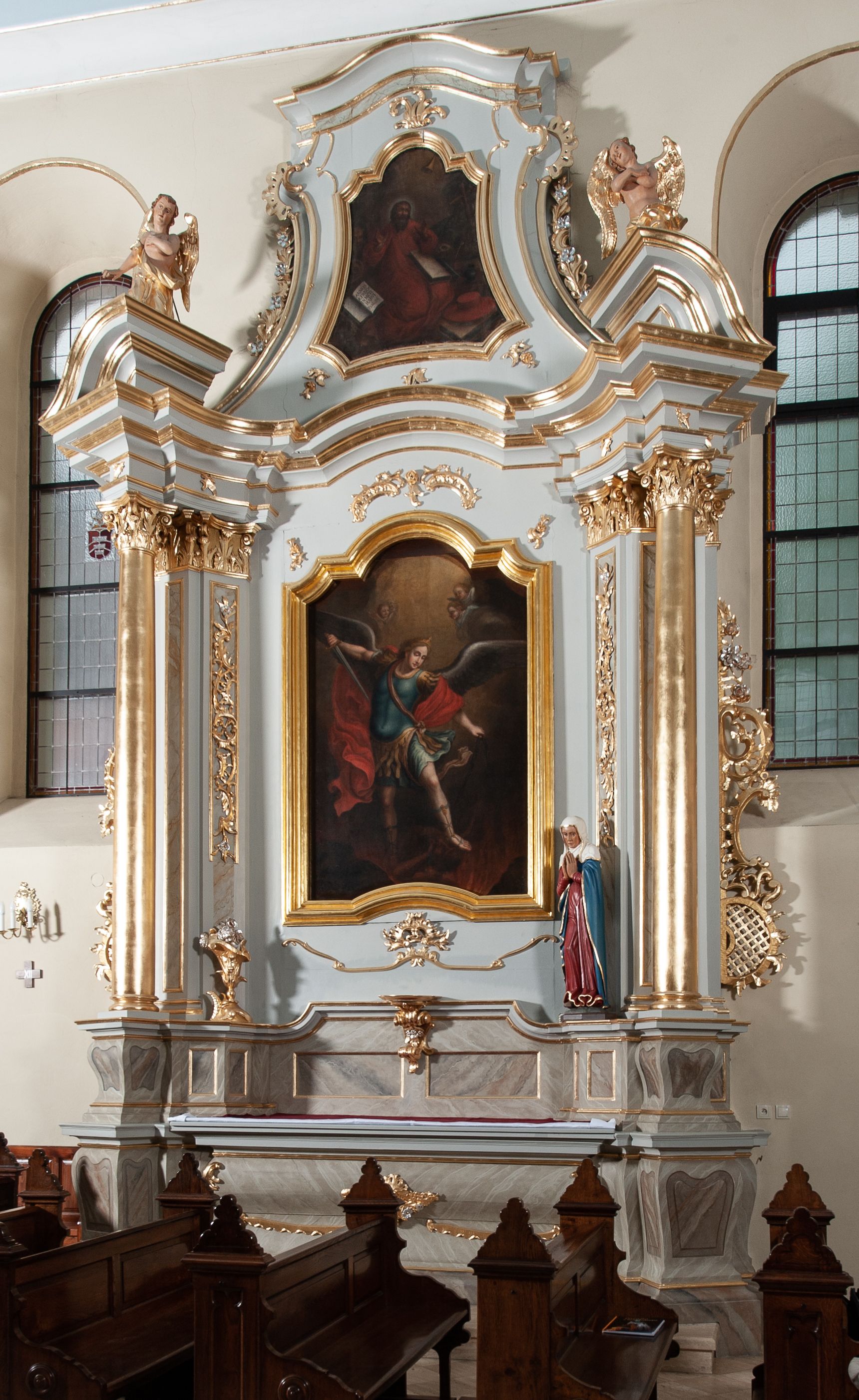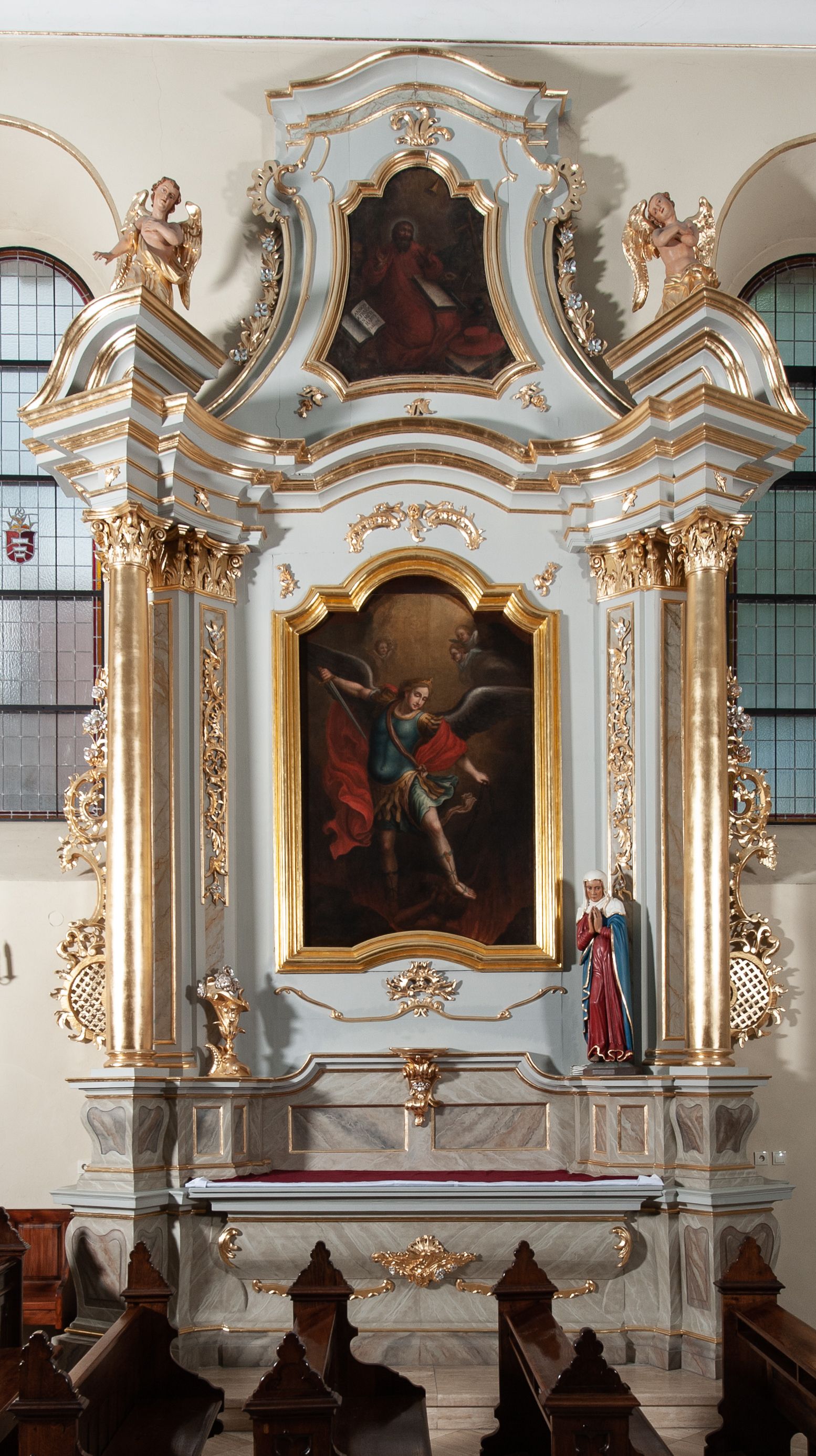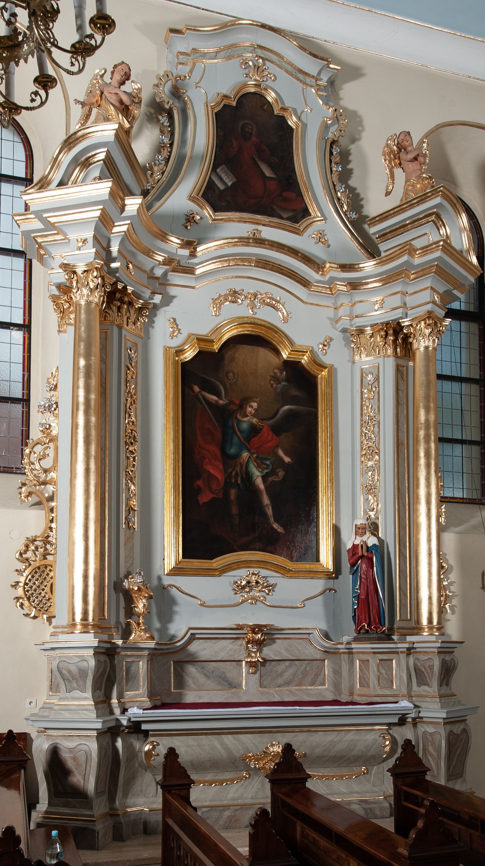 Nastawa ołtarzowa jednoosiowa, jednokondygnacyjna ze zwieńczeniem, na podwójnym cokole. Mensa drewniana, sarkofagowa. W polu antepedium stylizowane elementy rocaille’owe ujęte ornamentem roślinnym. Kondygnacja nastawy flankowana pilastrami oraz stojącą przed nimi parą kolumn o kapitelach kompozytowych. Cokoły kolumn profilowane, ustawione skośnie względem lica. Podpory dźwigają pełne belkowanie o wklęsłej linii, wyłamane na ich osiach, połączone nad polem środkowym gzymsem wygiętym w łuk oraz fragmenty przerwanego przyczółka z klęczącą parą adorujących aniołów. W polu środkowym obraz z przedstawieniem św. Michała Archanioła ujęty profilowaną ramą w formie stojącego prostokąta z dolną krawędzią wyniesioną w łuk i zamkniętego łukiem nadwieszonym z uskokiem. Na cokołach, obok kolumn, po lewej stronie wazon z kwiatami, po prawej święta niewiasta (św. Anna?). Kondygnacja ujęta ażurowymi uszami utworzonymi z rocaille’ów, kratki regencyjnej oraz rozwiniętych kwiatów. Zwieńczenie w formie zbliżonej do stojącego prostokąta o wklęsłych bokach zwężających się ku górze z uszakami, zamknięte falistym gzymsem. W polu obraz z przedstawieniem św. Hieronima w profilowanej ramie w formie stojącego prostokąta o wklęsłych bokach i dolnych narożach rozszerzającego się ku dołowi, zamkniętego łukiem nadwieszonym z uskokami. Cokoły nastawy dekorowane płycinami o fantazyjnym zarysie oraz w formie leżących prostokątów. Trzony pilastrów zdobione płycinami; wewnętrzna para wypełniona rocaille’em. Pole główne, zwieńczenie oraz uszaki dekorowane elementami rocaille’owymi. Zwieńczenie ujęte roślinnymi festonami. Struktura polichromowana na biało; cokoły, ołtarz i predella marmoryzowane w kolorze beżowym; kolumny, ornamentyka i profile złocone i srebrzone.