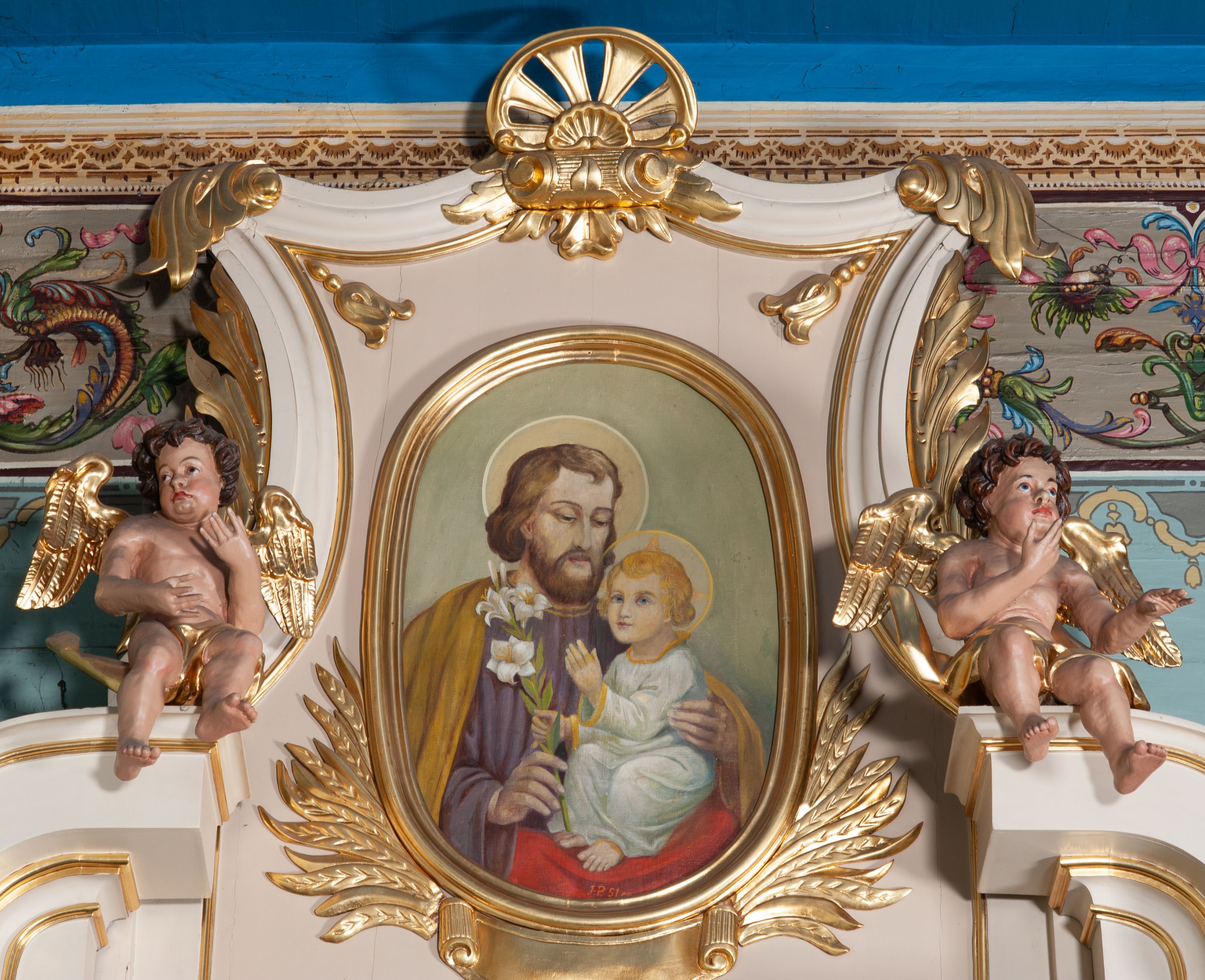 Struktura polichromowana na kremowo ze złoconą i srebrzoną ornamentyką oraz detalami architektonicznymi.