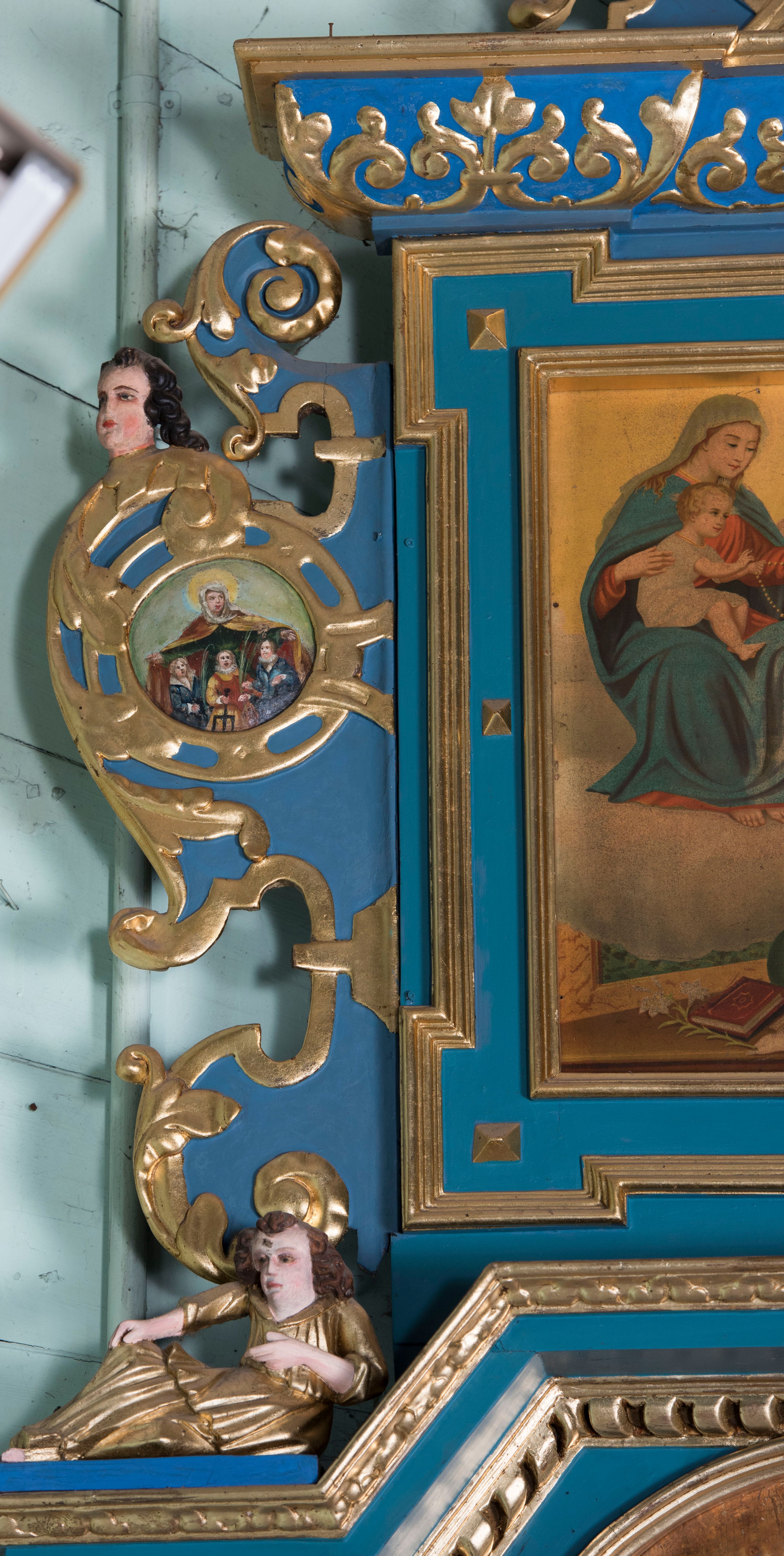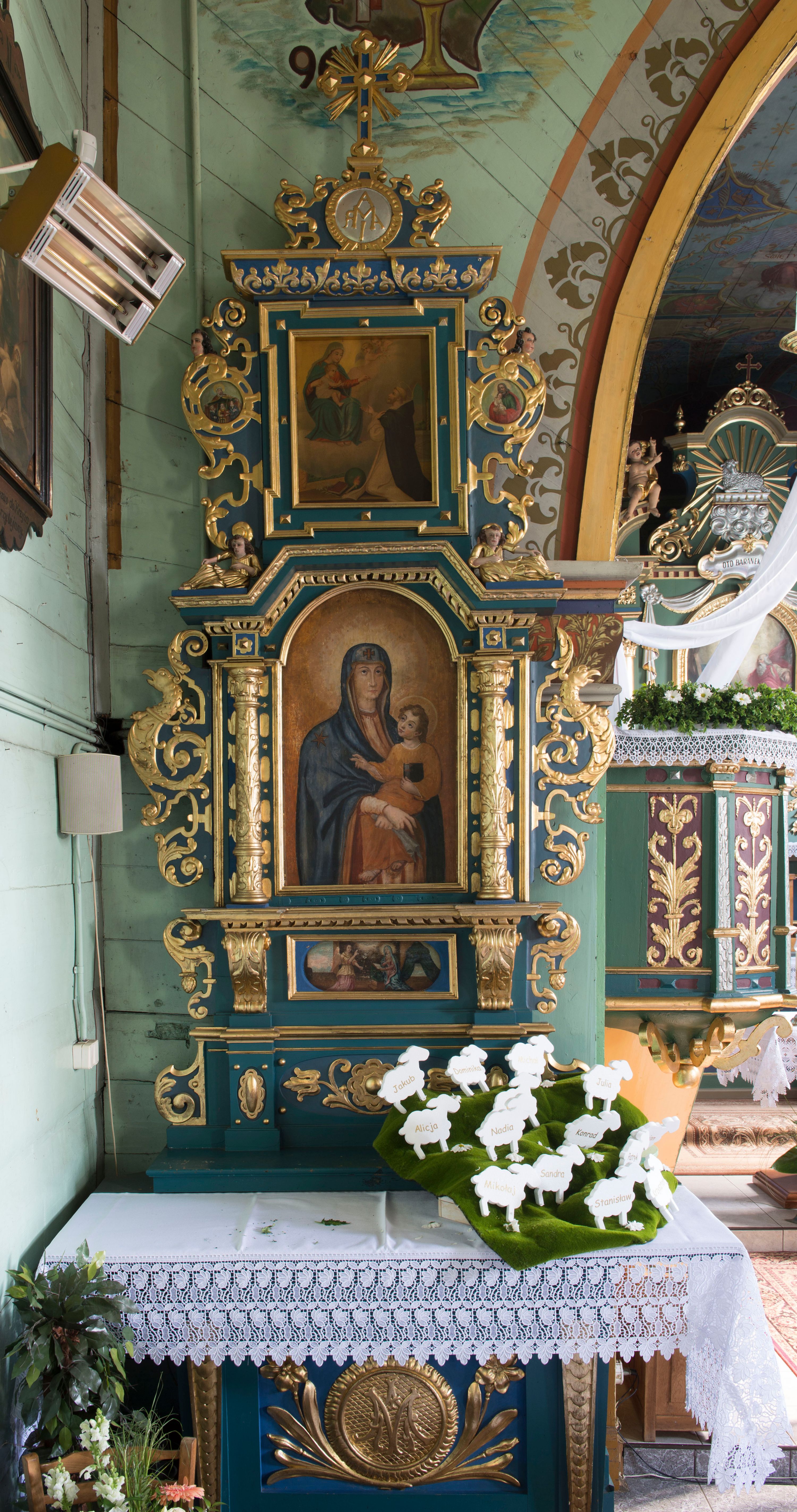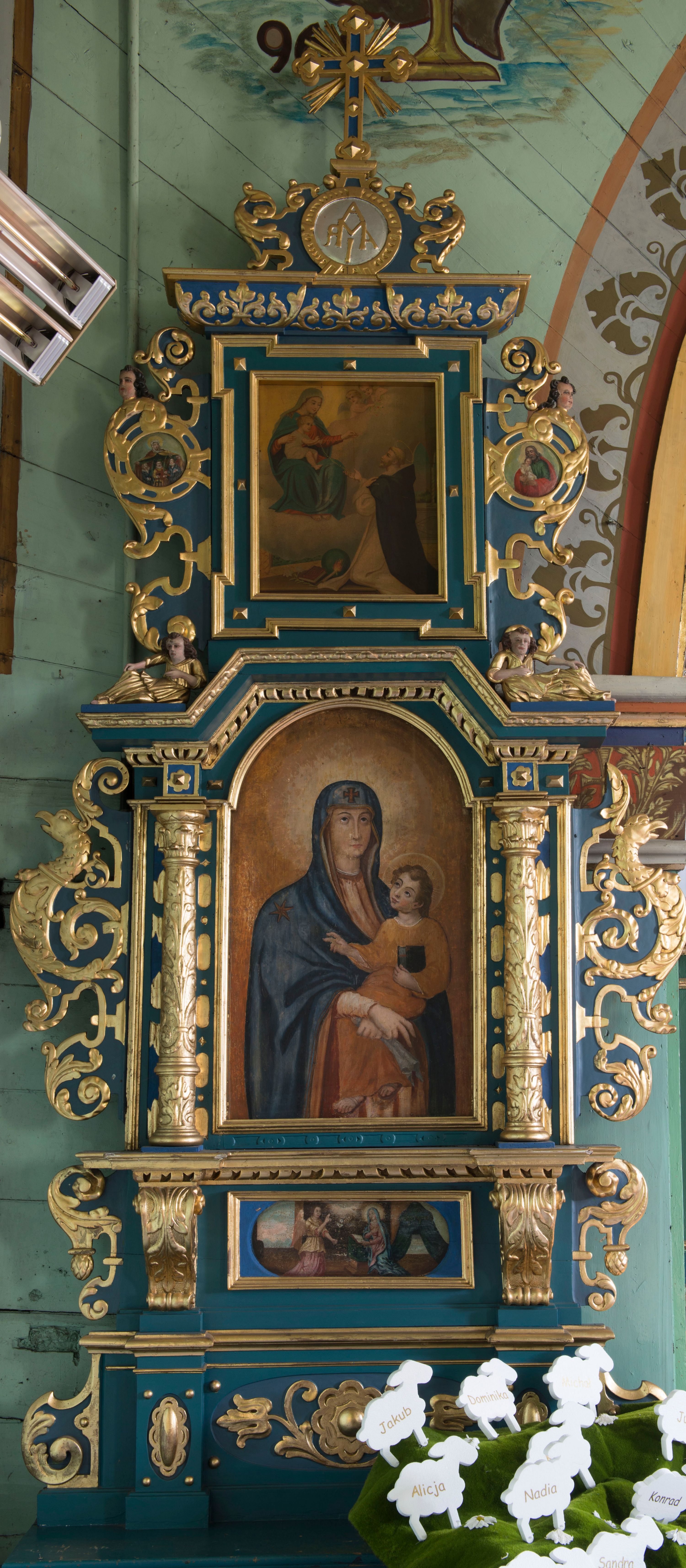 Ołtarz architektoniczny, jednokondygnacyjny, jednoosiowy ze zwieńczeniem. Ołtarz prostopadłościenny, o przednich narożach ujętych pilastrami hermowymi, z drewniana mensą. Antepedium w formie prostokątnej płyciny z płaskorzeźbionym medalionem z monogramem maryjnym okolonym drobnymi promieniami i ujętym liśćmi i kwiatami narcyza. Retabulum osadzone na niewysokim cokole, lekko zryzalitowanym po bokach. Wyżej predella ujęta parą konsoli wolutowych wspierających wyłamujący się ponad nimi gzyms. Cokół wraz z predellą flankowany parą uszaków w formie spływów wolutowych. Część środkowa ujęta parą kolumn o trzonach zdobionych motywem kandelabru, wspierających fryz wyłamujący się ponad nimi oraz gzyms przybierające postać trójboczną. Zwieńczenie w kształcie kwadratu zamkniętego odcinkiem gzymsu o lekko zryzalitowanych bokach. Predellę, część środkową i zwieńczenie ujmują pary ujmują pary uszaków o fantazyjnych wykrojach, zdobione ornamentem okuciowym i wicią roślinną. Uszaki zwieńczenia dodatkowo zdobione parą główek anielskich i medalionów ze św. Józefem po prawej stronie i św. Zofią po lewej. Na bokach gzymsu para figur siedzących aniołów. Szczyt w postaci ujętego parą wolut i zwieńczonego krzyżem kartusza z okrągłym medalionem z monogramem maryjnym. w predelli obraz w kształcie leżącego prostokąta ze sceną Zwiastowania. Pole środkowe retabulum, ujęte motywami kaboszonów, ma kształt stojącego prostokąta zamkniętego półkolistym łukiem nadwieszonym, w środku obraz Madonny z Dzieciątkiem. W zwieńczeniu obraz w kształcie stojącego prostokąta, ujęty szeroką ramą z uszakami w narożach, zdobioną ornamentem. W środku wizerunek Matki Boskiej Różańcowej ze św. Dominikiem. Struktura polichromowana w odcieniach koloru niebieskiego, detal architektoniczny i ornamentyka złocone i srebrzone.