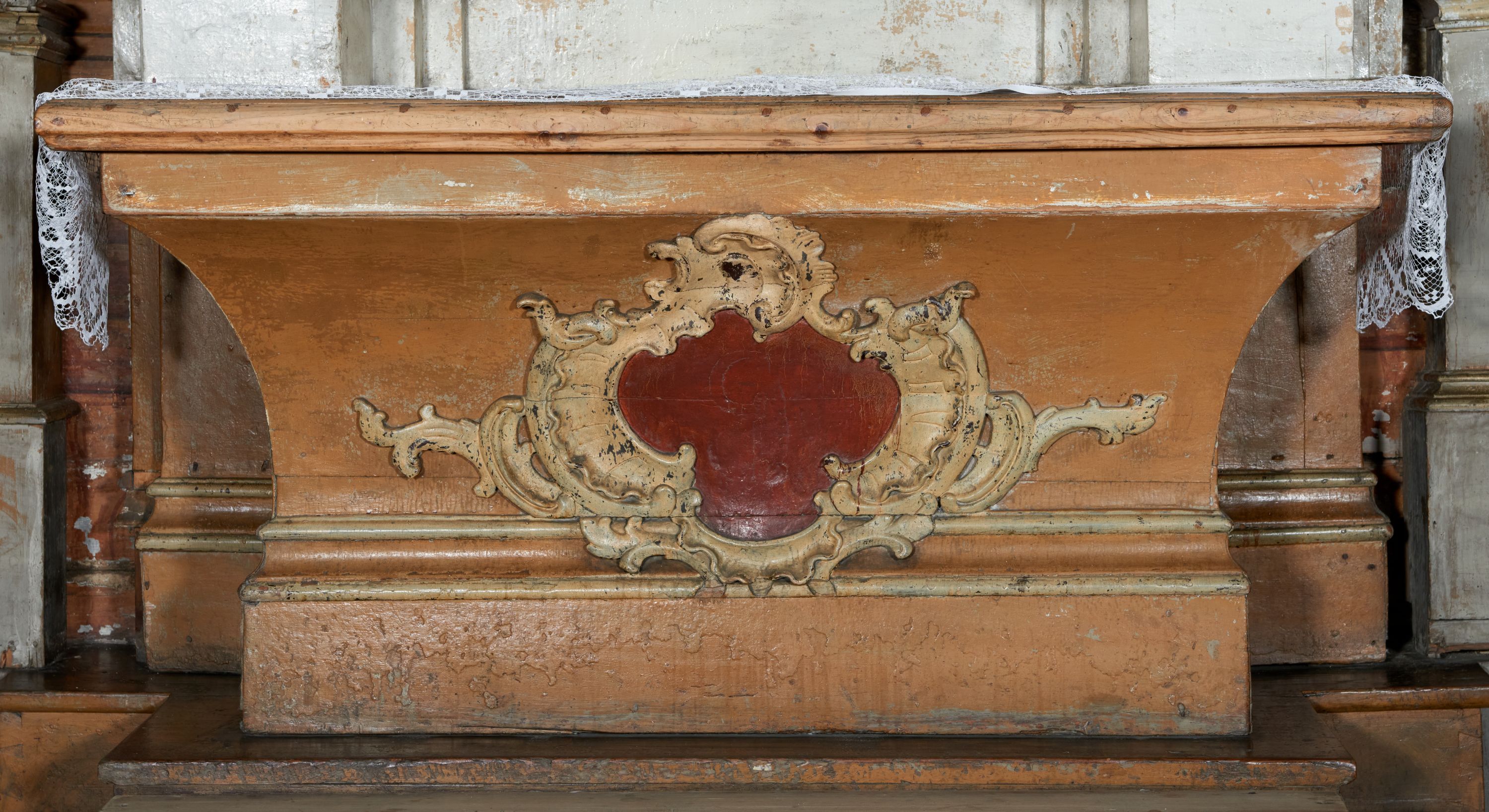 Mensa drewniana; ołtarz sarkofagowy, o wklęsłych bokach, zwężających się ku dołowi, ustawiony na niskim cokole zakończonym podwójnym półwałkiem, dekorowany rocaille'owym kartuszem. Ołtarz ustawiony na trzech drewnianych stopniach.