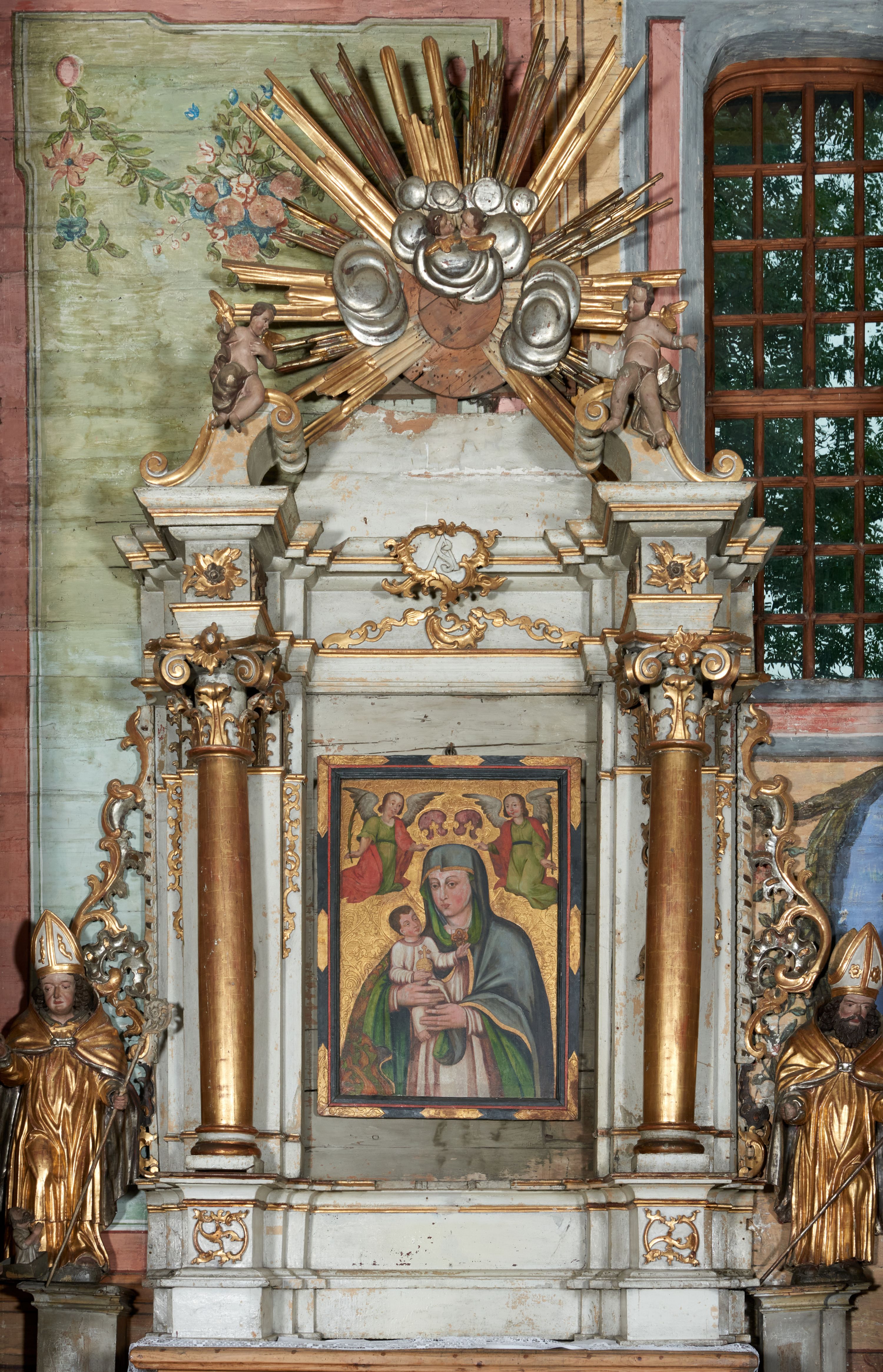 Obecna struktura ołtarza złożona jest z elementów powstałych w różnym czasie. Samo retabulum z widocznie uciętym w połowie zwieńczeniem stanowi główną składową. Dodano do niego w późniejszym czasie glorię promienistą zamontowaną ponad zwieńczeniem, mensę ołtarzową z rokokowym kartuszem, rocaille'owe uszy, filary z figurami biskupów oraz obraz Matki Boskiej z Dzieciątkiem.