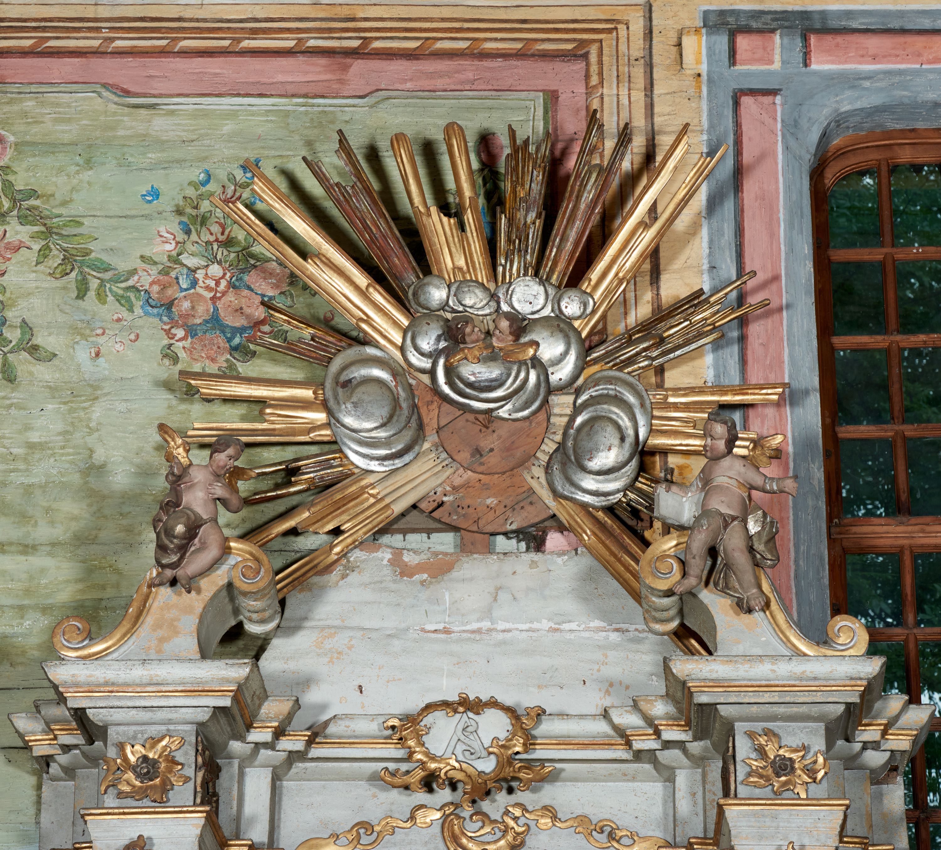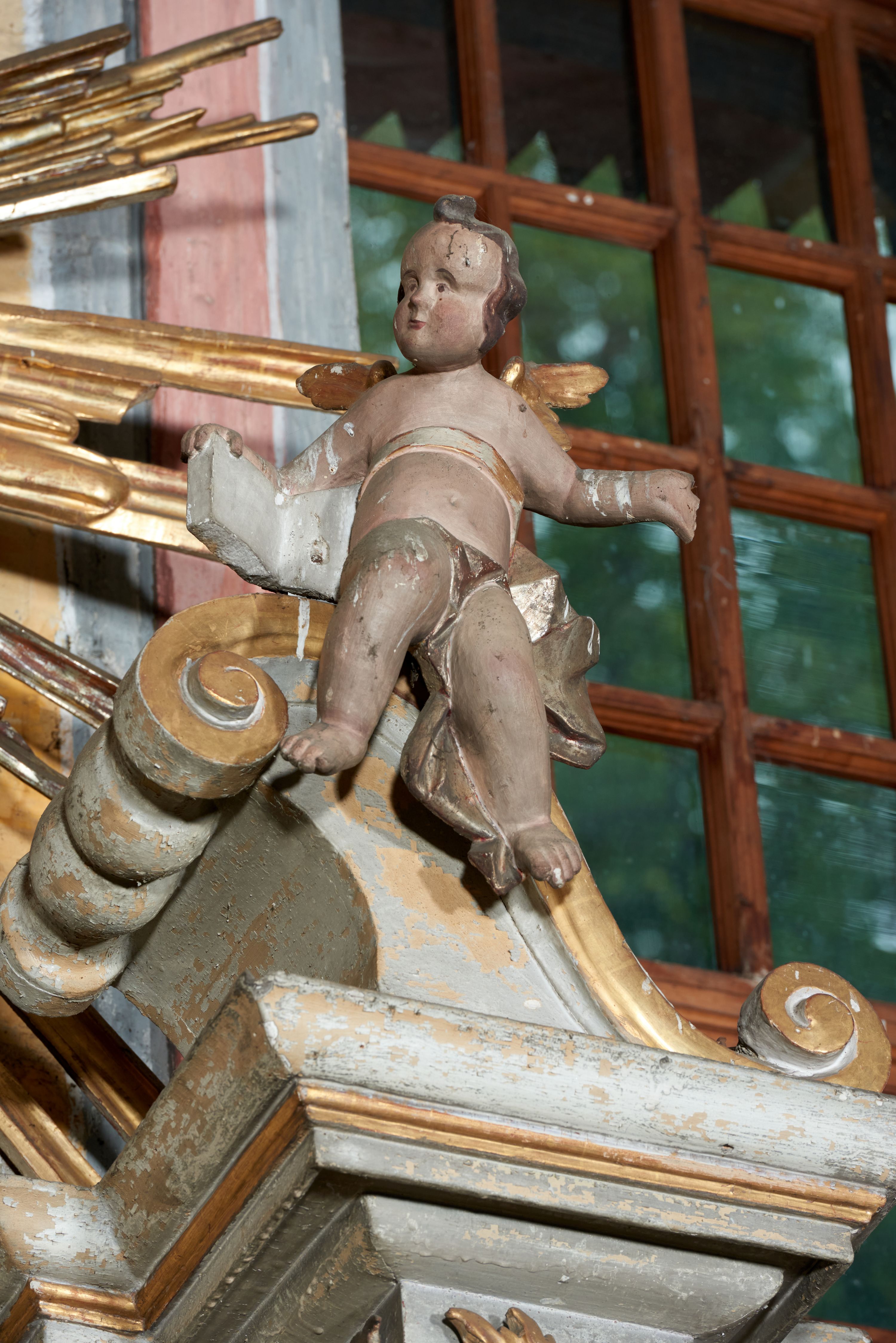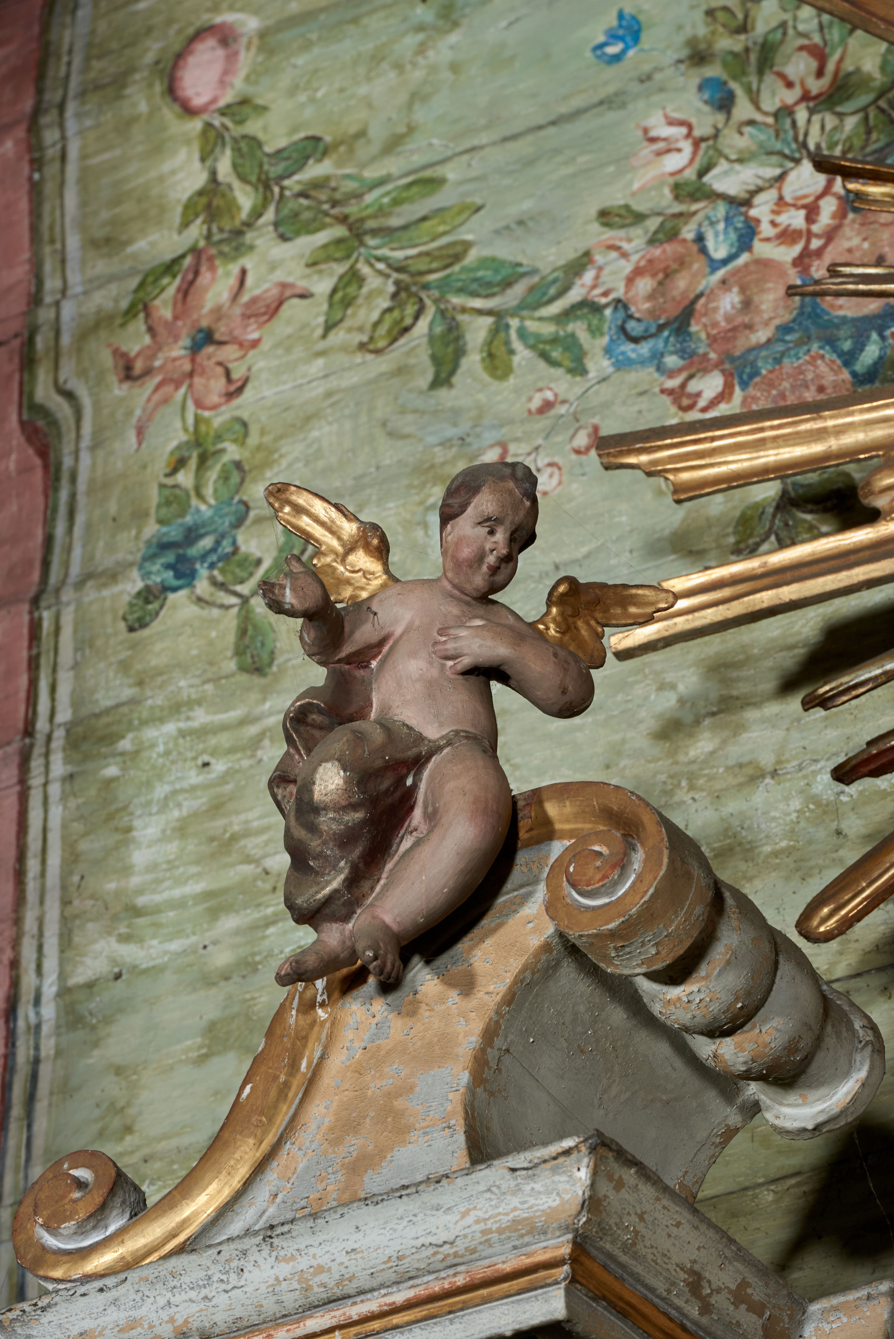 Silne zniszczenia i zabrudzenia polichromii i złoceń; niektóre elementy struktury spękane; drobne uszkodzenia mechaniczne.