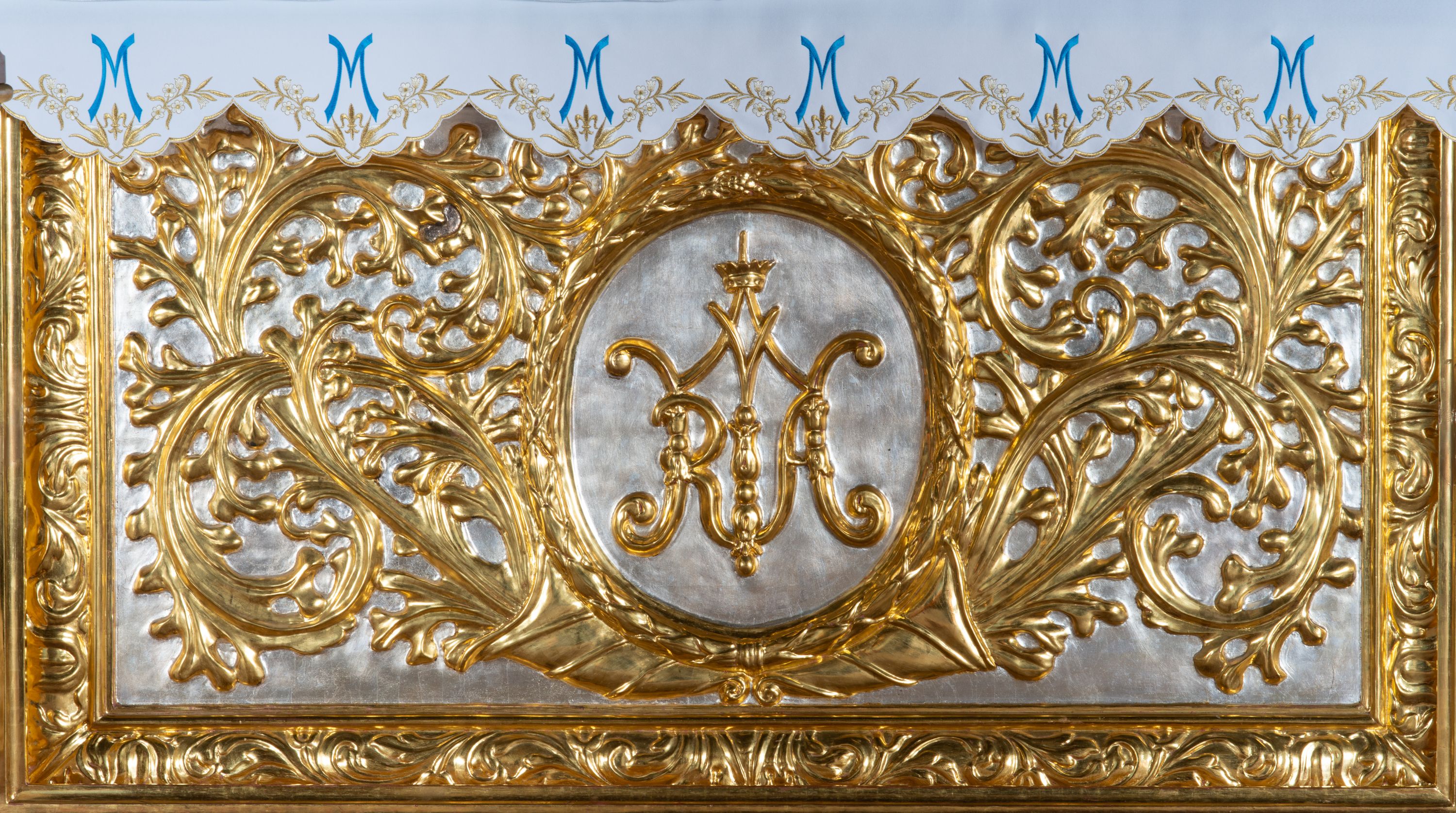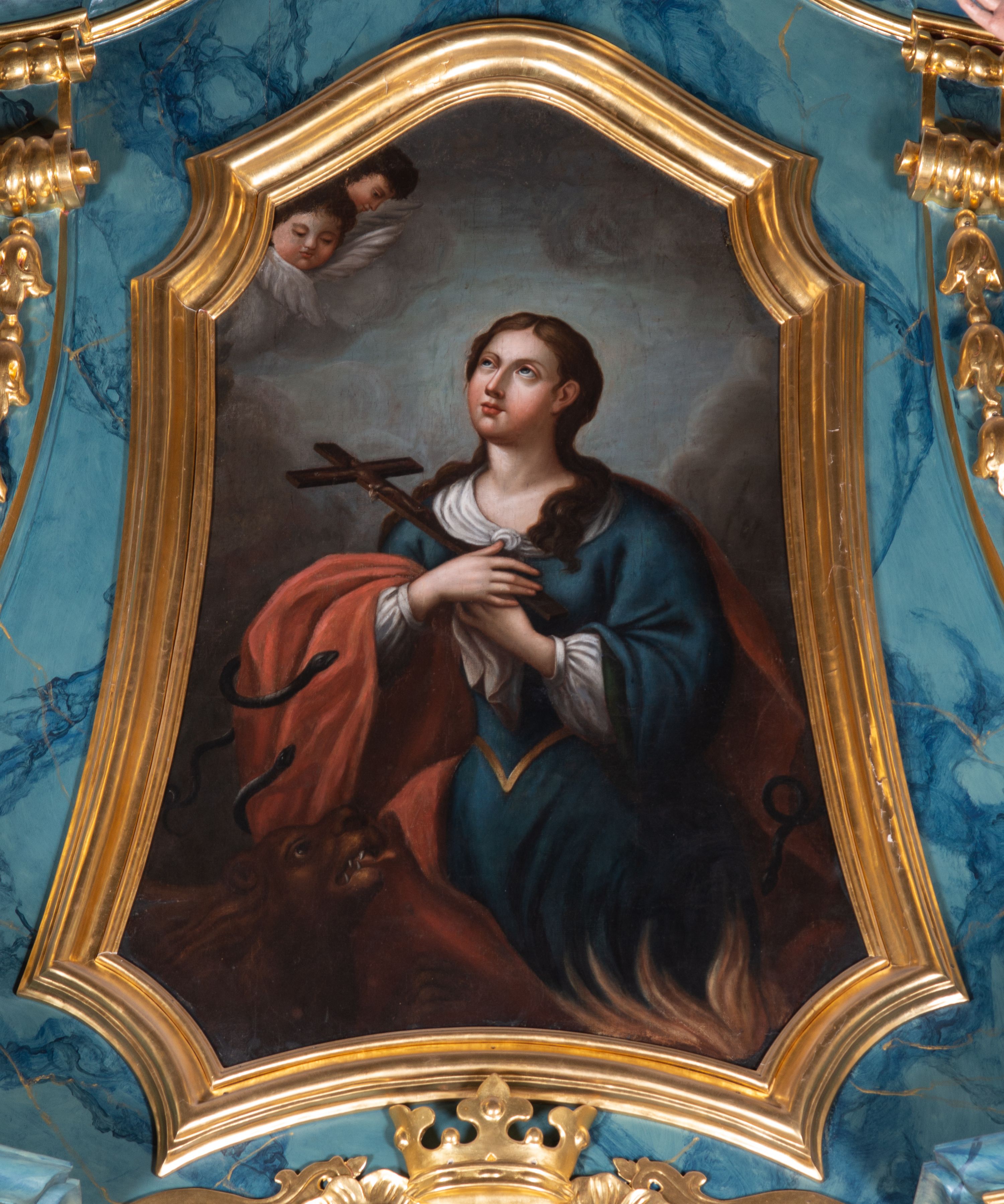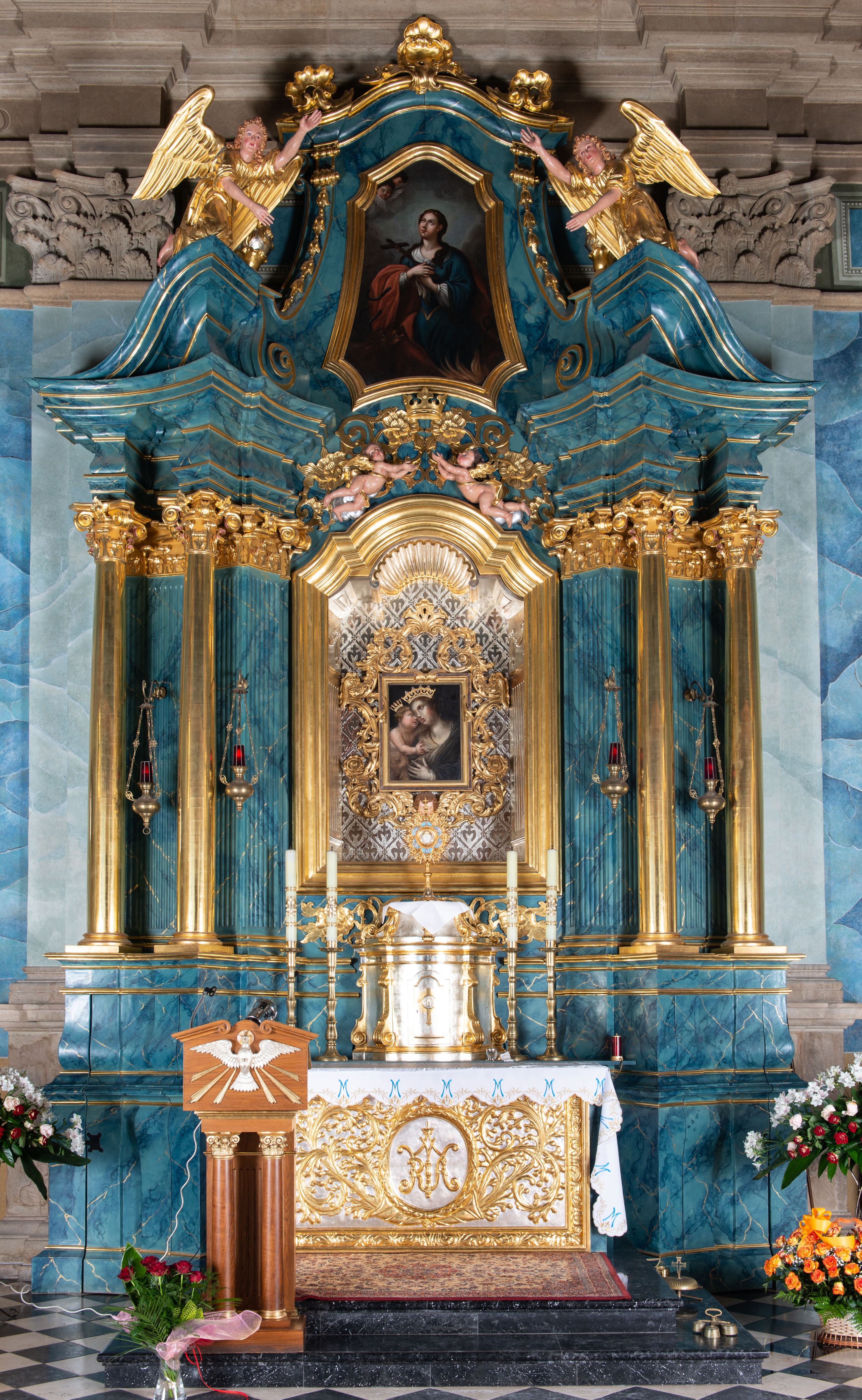 Struktura w całości marmoryzowana w kolorze zielono-granatowym; kolumny, ornamentyka i profile złocone i srebrzone.