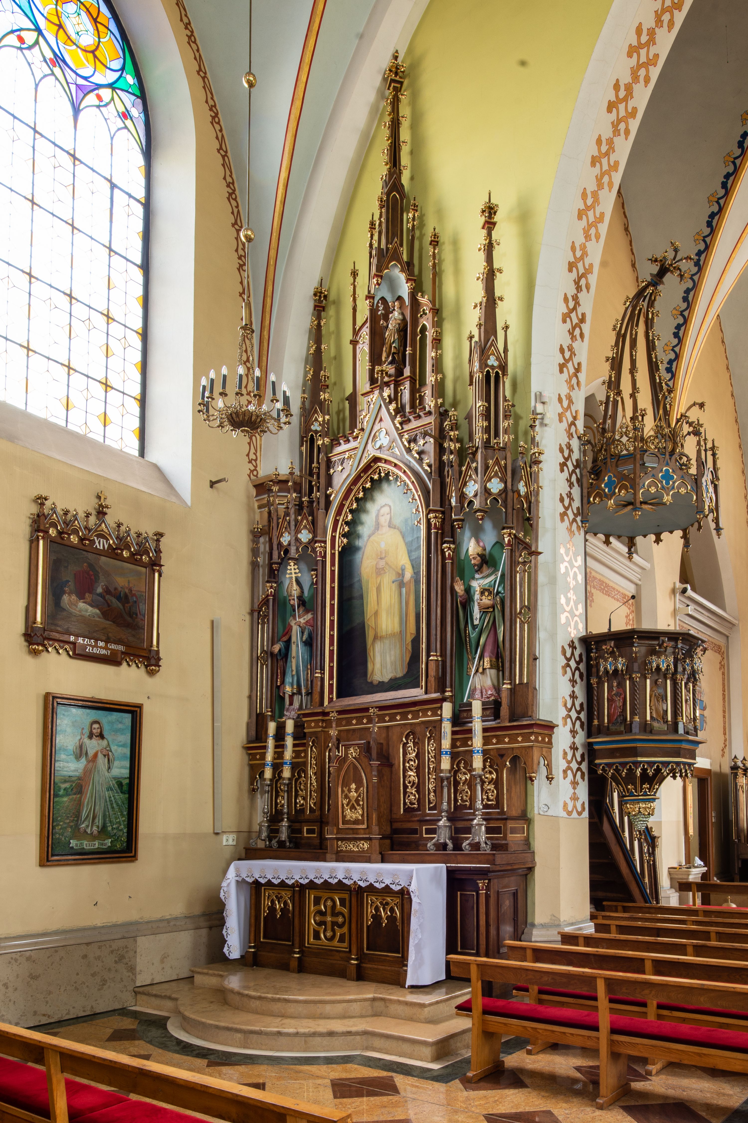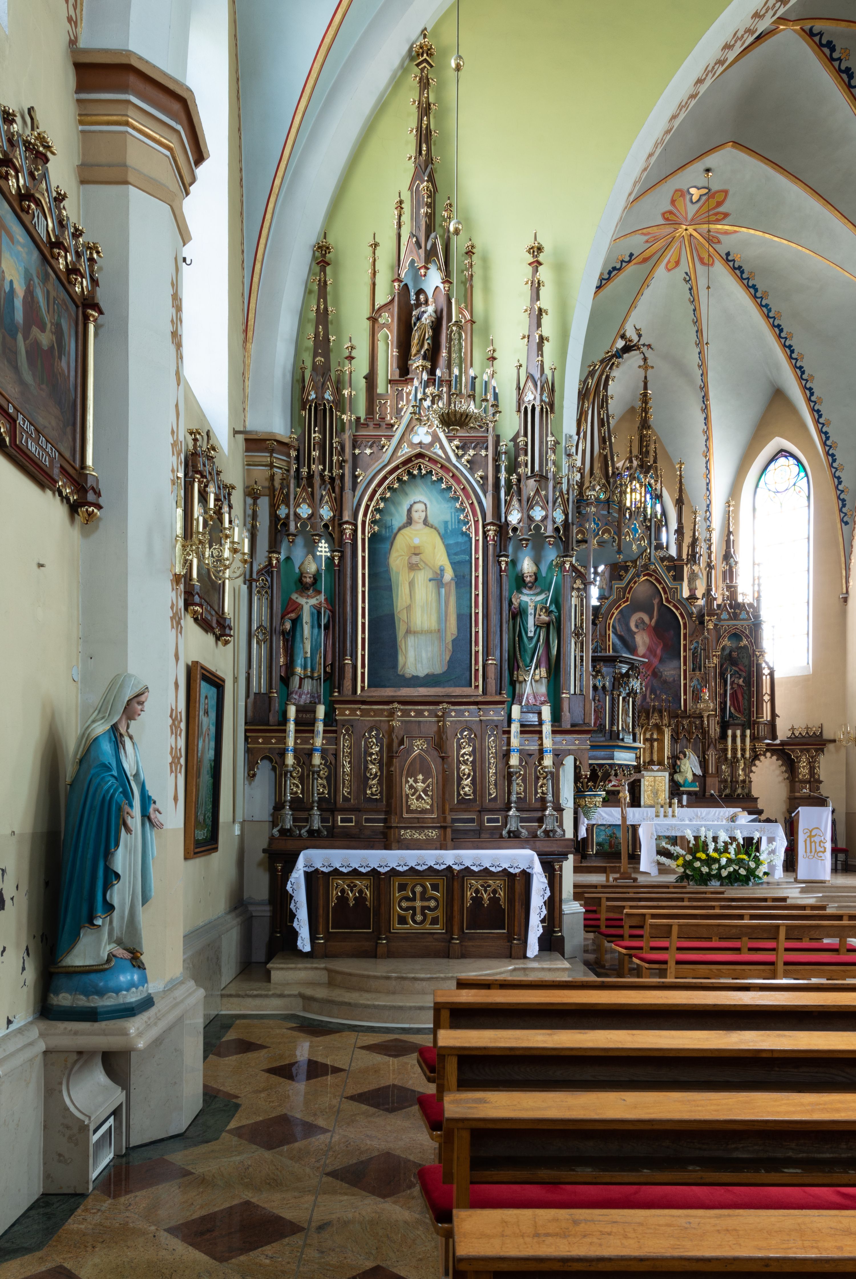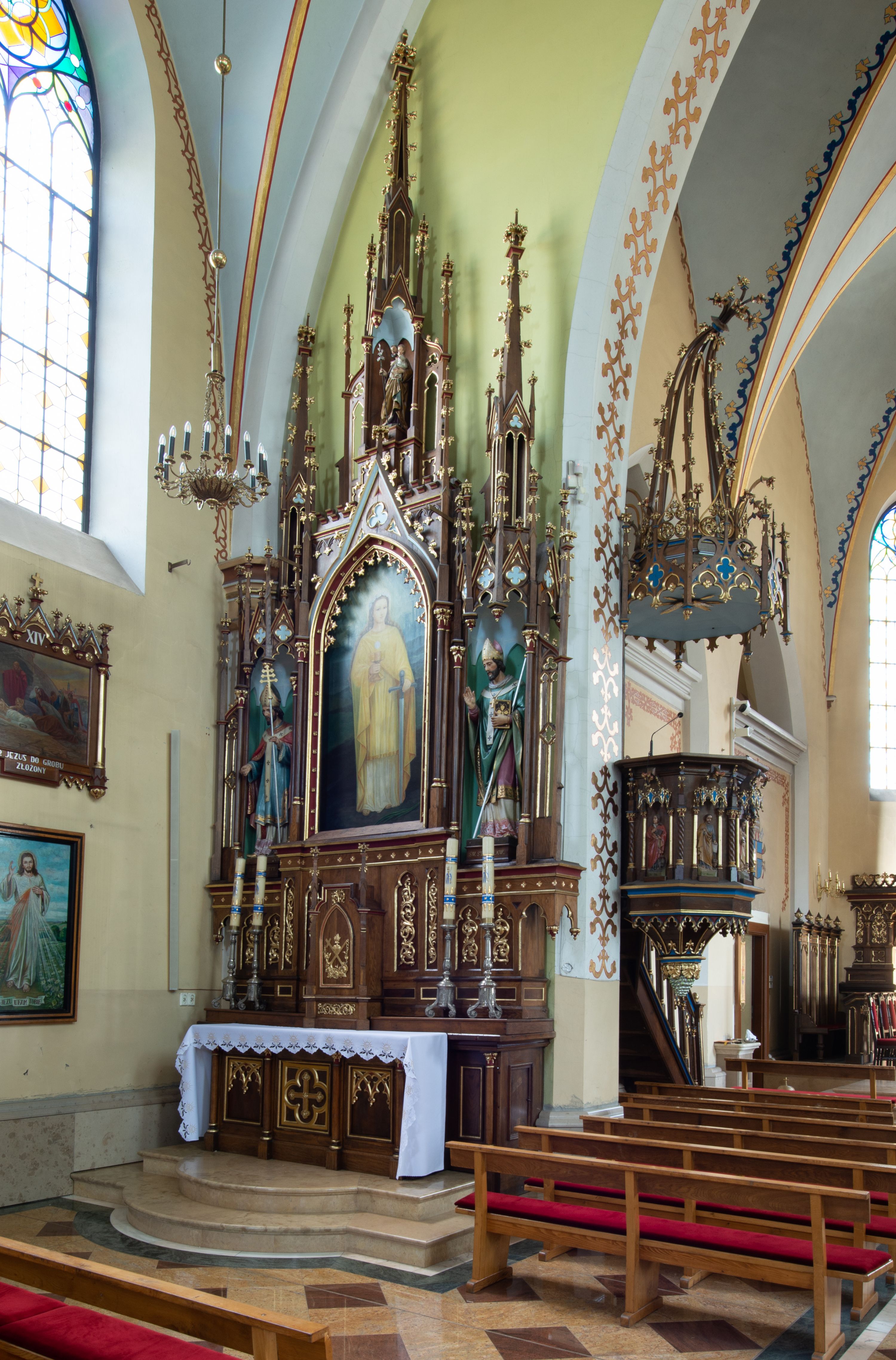 Neogotycki, przyścienny, jednokondygnacyjny ołtarz Matki Boskiej Różańcowej uzyskał architektoniczną strukturę ze zwieńczeniem. Kolorystyka ołtarza utrzymana została w tonacji ciemnego, bejcowanego drewna. Detale, ornamenty zostały wyzłocone, natomiast wypełnienia maswerków i ram wimperg są białe. Z kolei pole ramy głównego obrazu wykonano jako czerwone. Retabulum ustawiono na podwójnych gradusach zaokrąglonych od przodu. Stipes ołtarzowy uzyskał kształt prostopadłościanu z trzema czworobocznymi płycinami od frontu, ujętymi złoconymi i profilowanymi obramieniami. Płyciny rozdzielają półkolumienki na wysokich cokolikach. Dwie skrajne płyciny stipesu wypełniono u góry maswerkiem, natomiast w środkowej znalazł się równoramienny krzyż wpisany w czteroliść. Stipes podtrzymuje drewnianą mensę z portatylem. Ołtarz przylega do wysokiego, prostopadłościennego cokołu flankowanego po bokach kolumienkami, na którym wspiera się cała nastawa. Widoczne jego partie zdobią prostokątne płyciny w obramieniach. Na cokole wspiera się predella podzielona płytkimi, prostokątnymi płycinami zakończonymi ostrołukowymi arkadkami z noskami, wypełnionymi płaskorzeźbionym i złoconym ornamentem roślinnym. Pośrodku, w przerwie między płycinami predelli, usytuowano prostopadłościenne tabernakulum w formie kapliczki, zwieńczone łukiem siodłowym, flankowane dwoma pinaklami. Ostrołukowe drzwiczki tabernakulum zdobi skrzyżowana z krzyżem kotwica oraz wyobrażenie Boskiego Serca Pana Jezusa. Poniżej widoczna jest girlanda różana. Predella wspiera trójosiową kondygnację ze zwieńczeniem. Na osi środkowej usytuowano płytką, prostokątną wnękę zakończoną ostrołukiem z arkaturą. Flankują ją smukłe kolumienki na wysokich cokolikach wspierające wysokie pinakle. Ponad wnęką widoczna jest wimperga z maswerkiem dekorowana czołgankami i kwiatonem. We wnęce umieszczono płaskorzeźbione i polichromowane przedstawienie Matki Boskiej Różańcowej ze św. Dominikiem i św. Katarzyną ze Sieny, a na zasuwie obraz ze św. Barbarą. W osiach skrajnych, pod gotyckimi baldachimami z wimpergami, rozdzielonymi pinaklami, ustawiono w niszach na postumentach figury św. Wojciecha i św. Stanisława. Święci zostali podpisani na postumentach. Konchy nisz są jasnoniebieskie natomiast ich ścianki zielone. Boki baldachimów udekorowano małymi wimpergami rozdzielonymi smukłymi pinaklami z kwiatonami i czołgankami. Baldachimy przechodzą w smukłe, ażurowe fiale dekorowane pinaklami i czołgankami oraz kwiatonami. Zwieńczenie nastawy na osi środkowej uzyskało kształt otwartej kapliczki z niszą zakończoną smukłą fialą z iglicą, dekorowaną czołgankami i kwiatonem. Po bokach kapliczki znajdują się ażurowe przypory wypełnione maswerkiem, flankowane pinaklami. W niszy umieszczono figurę św. Józefa z Dzieciątkiem. Całość retabulum flankują uszaki w formie ażurowych przypór, wypełnionych maswerkami i zdobionych parą pinakli.