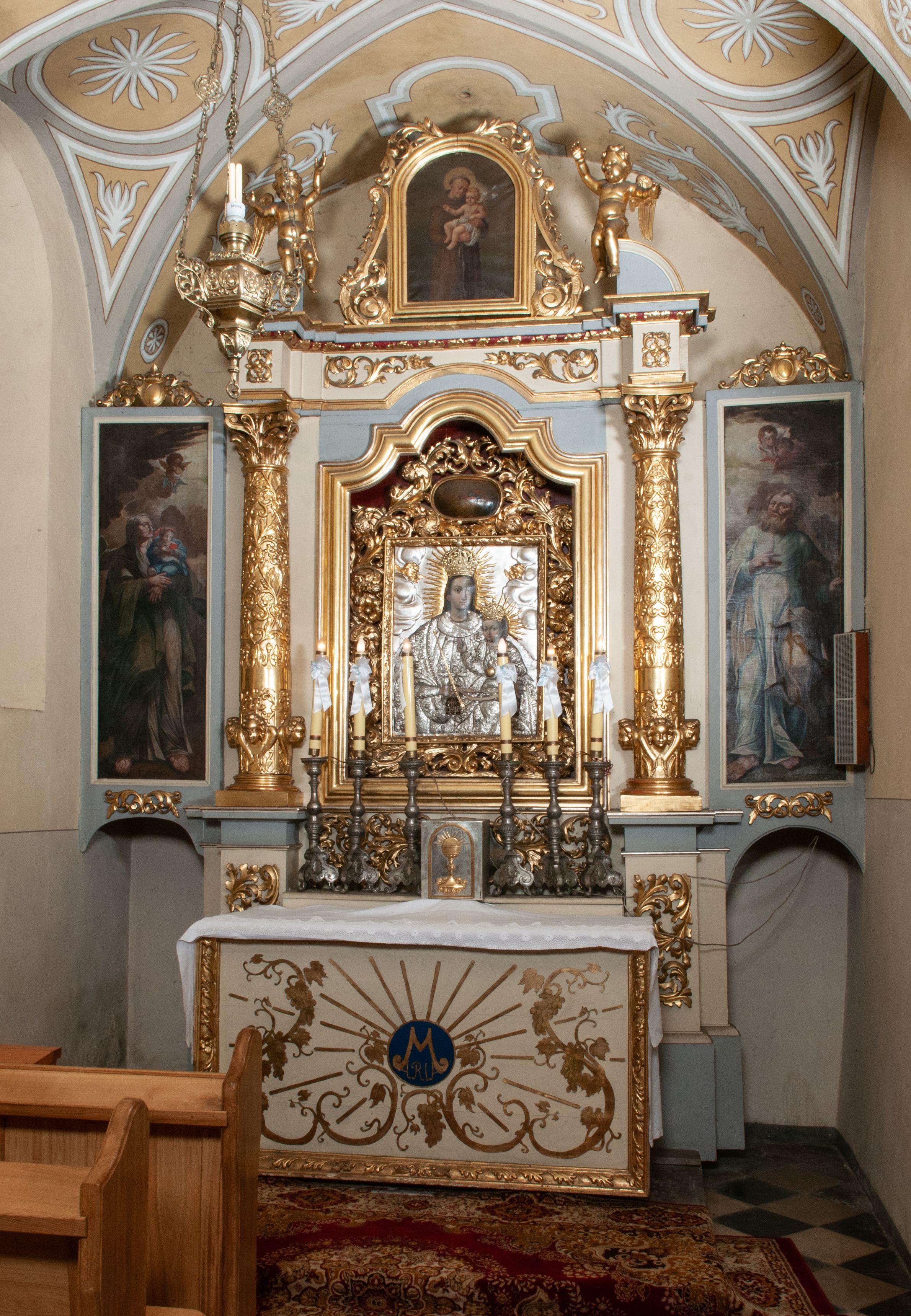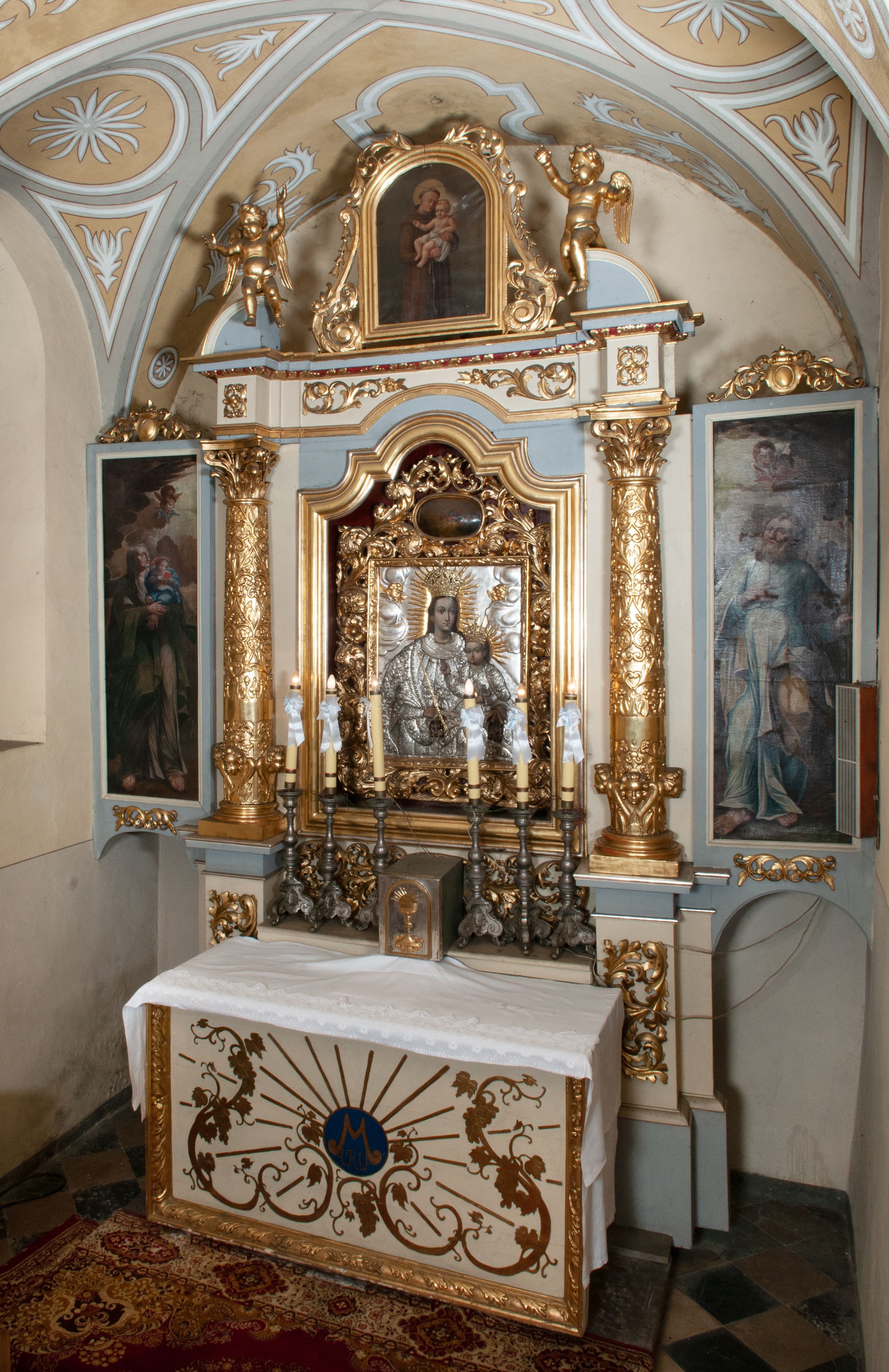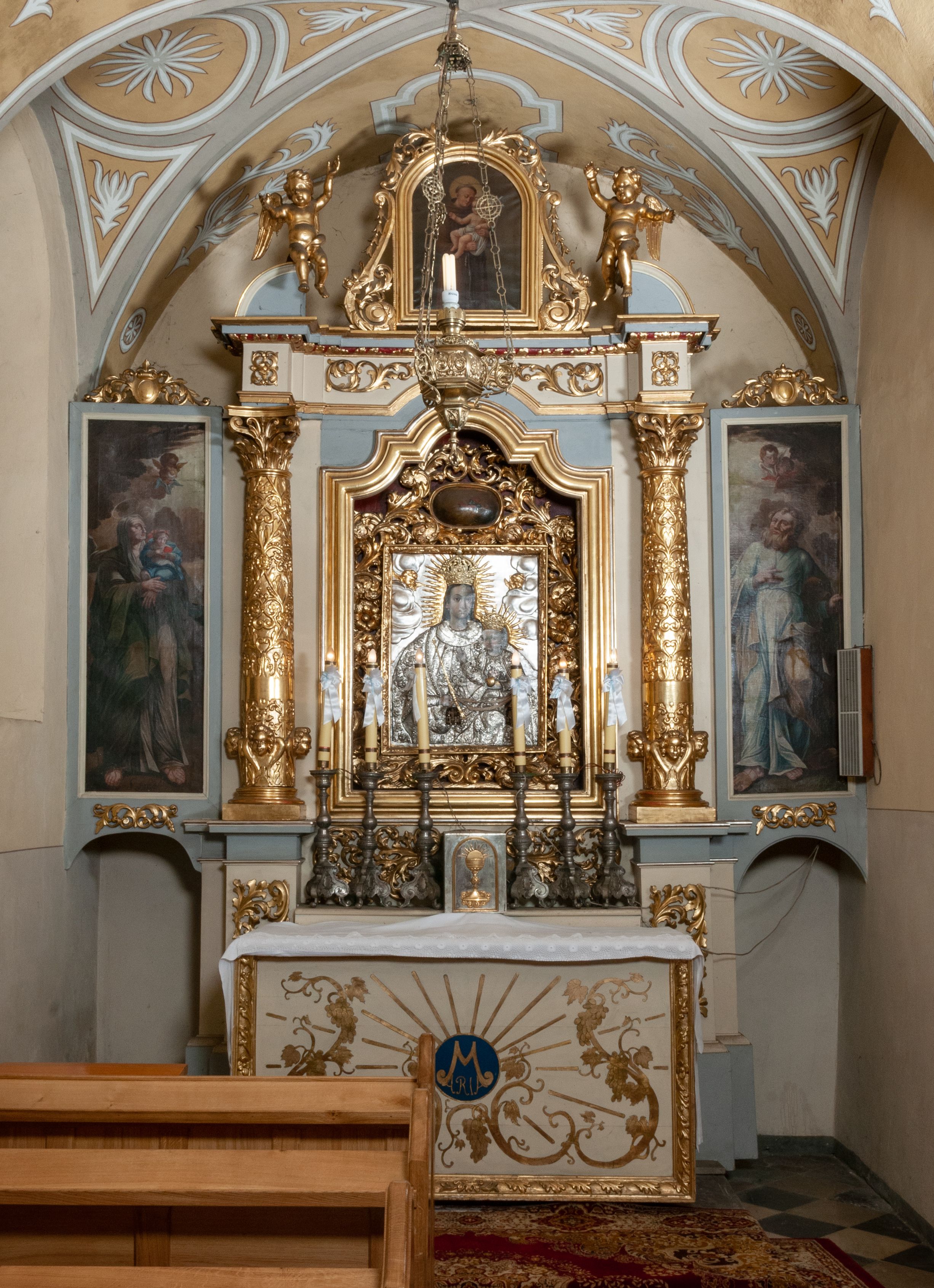 Ołtarz został wykonany w 1893 roku, zestawiono go z fragmentów późnorenesansowych i barokowych, z późnobarokowym obrazem Matki Boskiej Szkaplerznej oraz obrazami przedstawiającymi św. Józefa, św. Annę i św. Joachima. W 1986 roku wykonano pełną konserwację ołtarza.