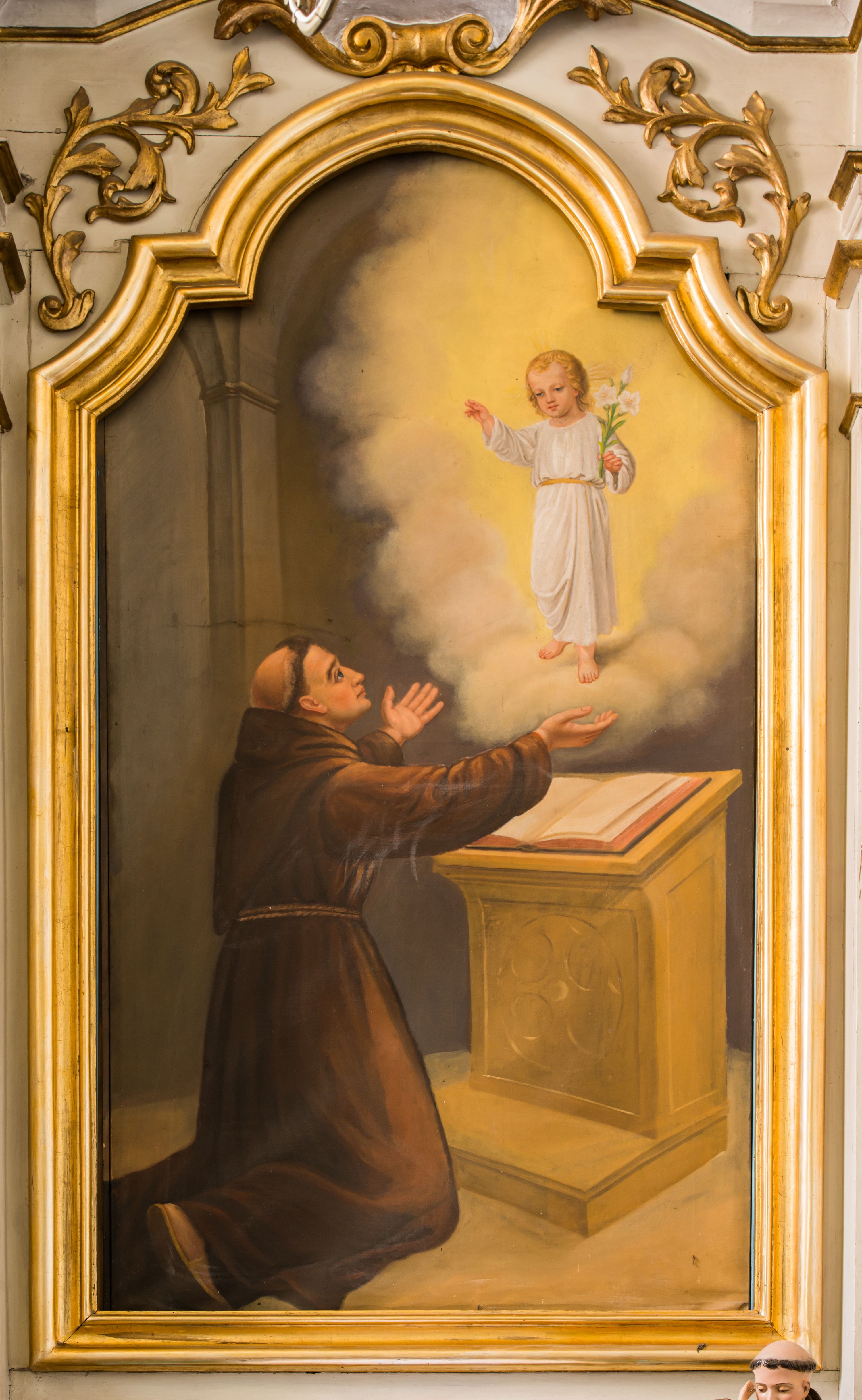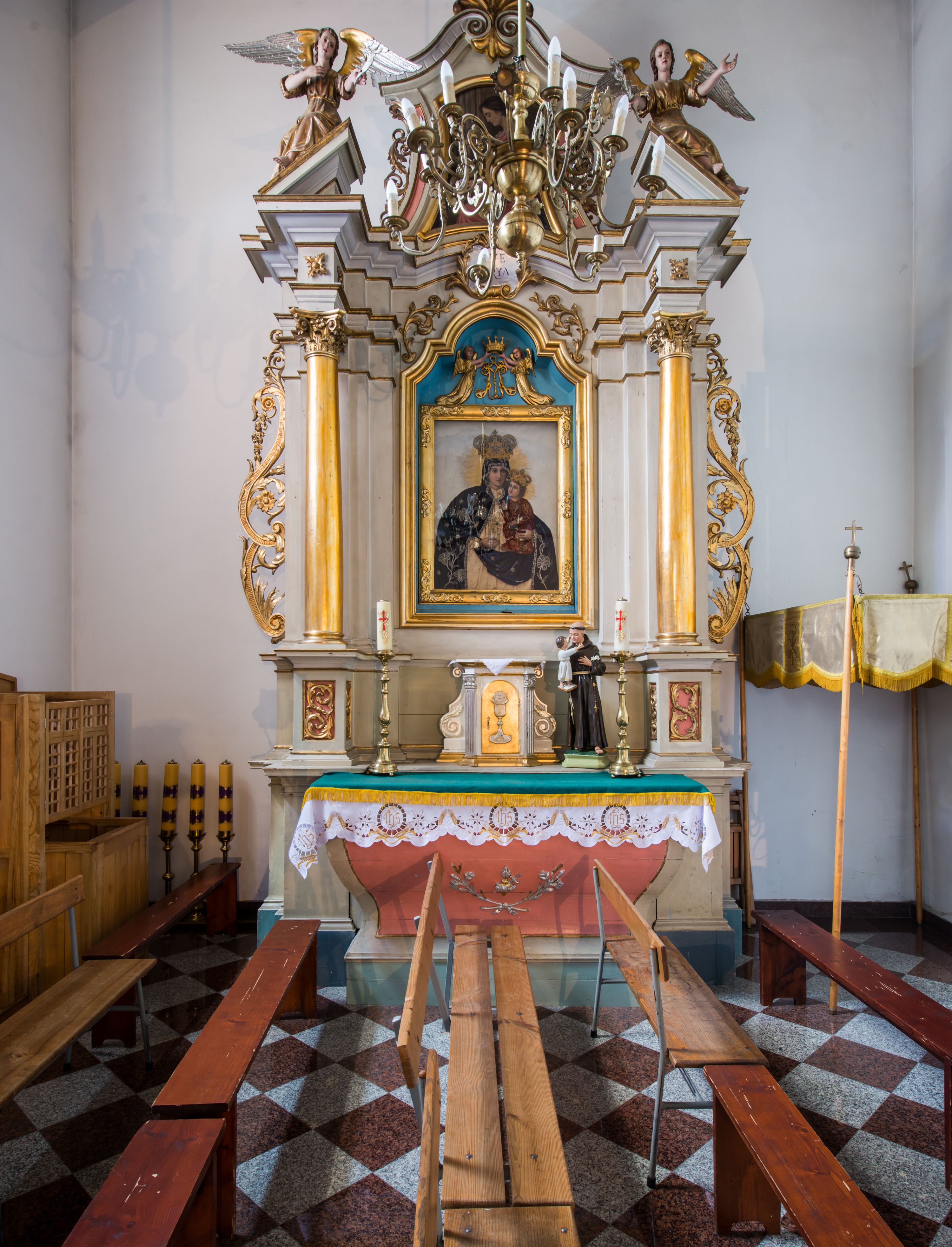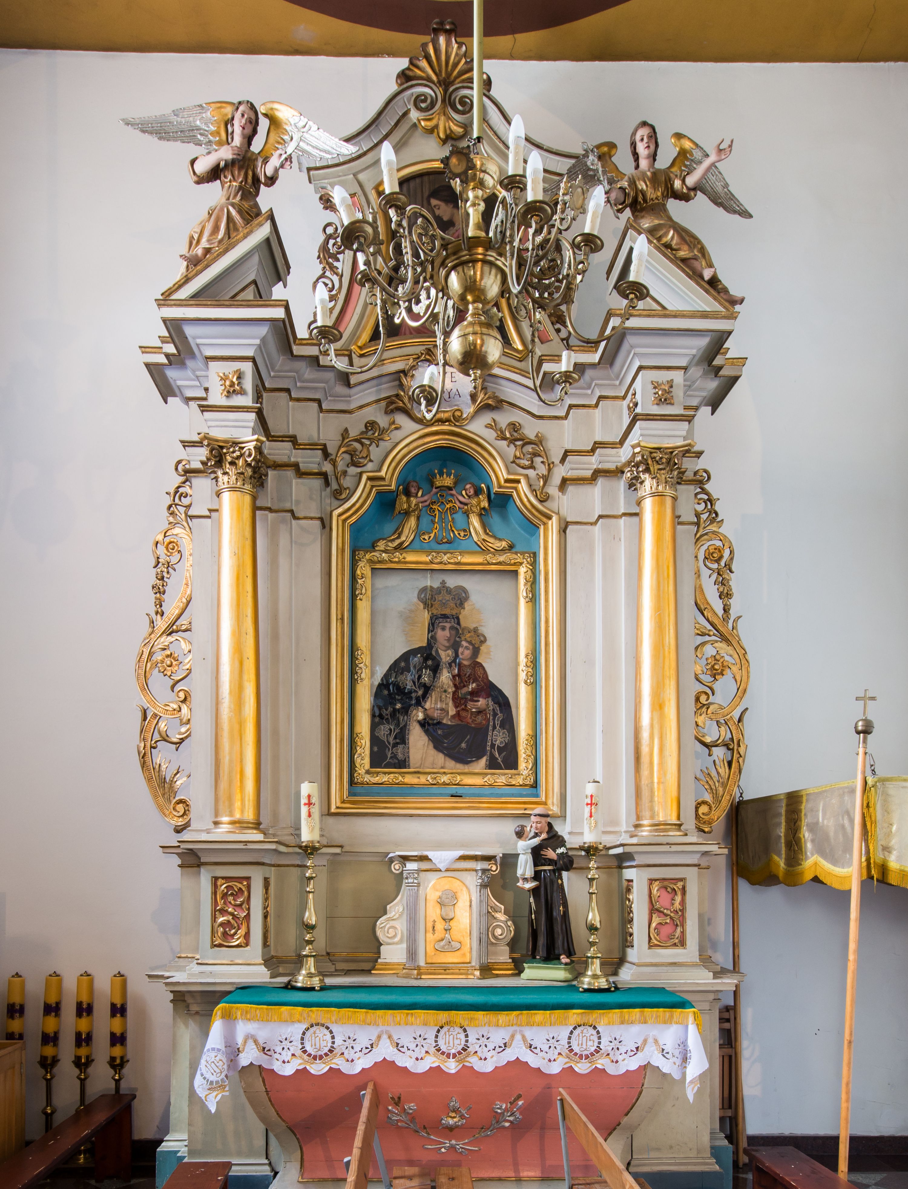 Ołtarz przyścienny, architektoniczny, na cokole. Mensa w typie sarkofagowym; antepedium dekorowane przebitym mieczem gorejącym sercem w wieńcu z róż ujętym kwitnącymi gałązkami. Na mensie tabernakulum na rzucie zbliżonym do prostokąta, na profilowanej podstawie, ujęte spływami wolutowymi. Na licu drzwi w kształcie stojącego prostokąta zamkniętego łukiem półkolistym dekorowane kielichem z hostią, ujęte ustawionymi skośnie pilastrami dźwigającymi pełne belkowanie z wysuniętym gzymsem. Obok tabernakulum stoi figura św. Antoniego Padewskiego. Nastawa jednoosiowa, jednokondygnacyjna ze zwieńczeniem. Oś środkowa flankowana parą kolumn o kapitelach kompozytowych, ustawionych przed licem ołtarza na tle zwielokrotnionych pilastrów. Cokoły kolumn dekorowane płycinami z dekoracją z wici. Podpory dźwigają pełne, wyłamane wielokrotnie belkowanie oraz odpowiadający ich ułożeniu przerwany przyczółek, na którym spoczywa para adorujących aniołów; belkowanie nad częścią środkową ucięte łukowato. W polu środkowym we wnęce w kształcie stojącego prostokąta zamkniętego łukiem nadwieszonym z uskokiem obraz z przedstawieniem Matki Boskiej z Dzieciątkiem w profilowanej ramie z dekoracją płaskorzeźbioną. W ramie ponad obrazem płaskorzeźbiona kompozycja z aniołków trzymających koronę ponad monogramem maryjnym. Powyżej kartusz z napisem „AVE / MARYA”.