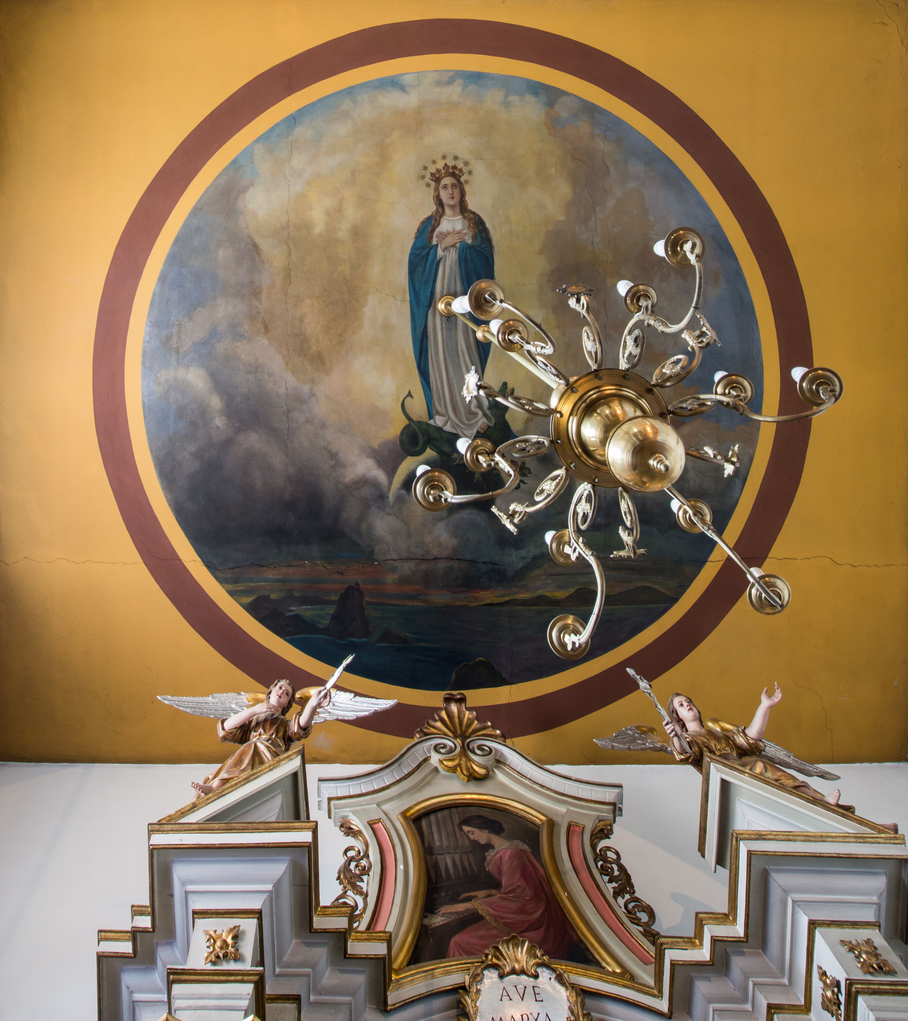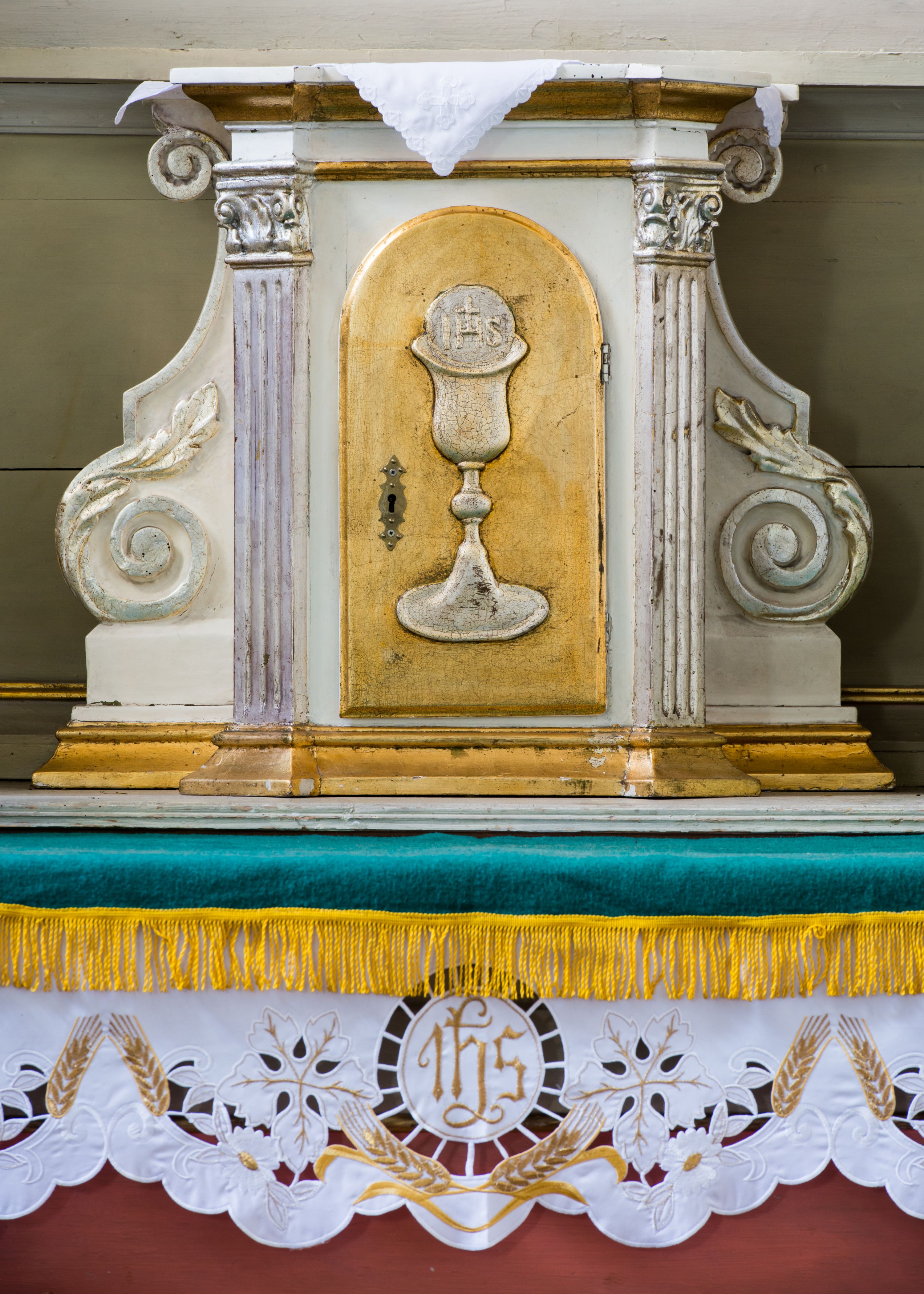 Struktura polichromowana na biało ze złoconą ornamentyką oraz detalami architektonicznymi.