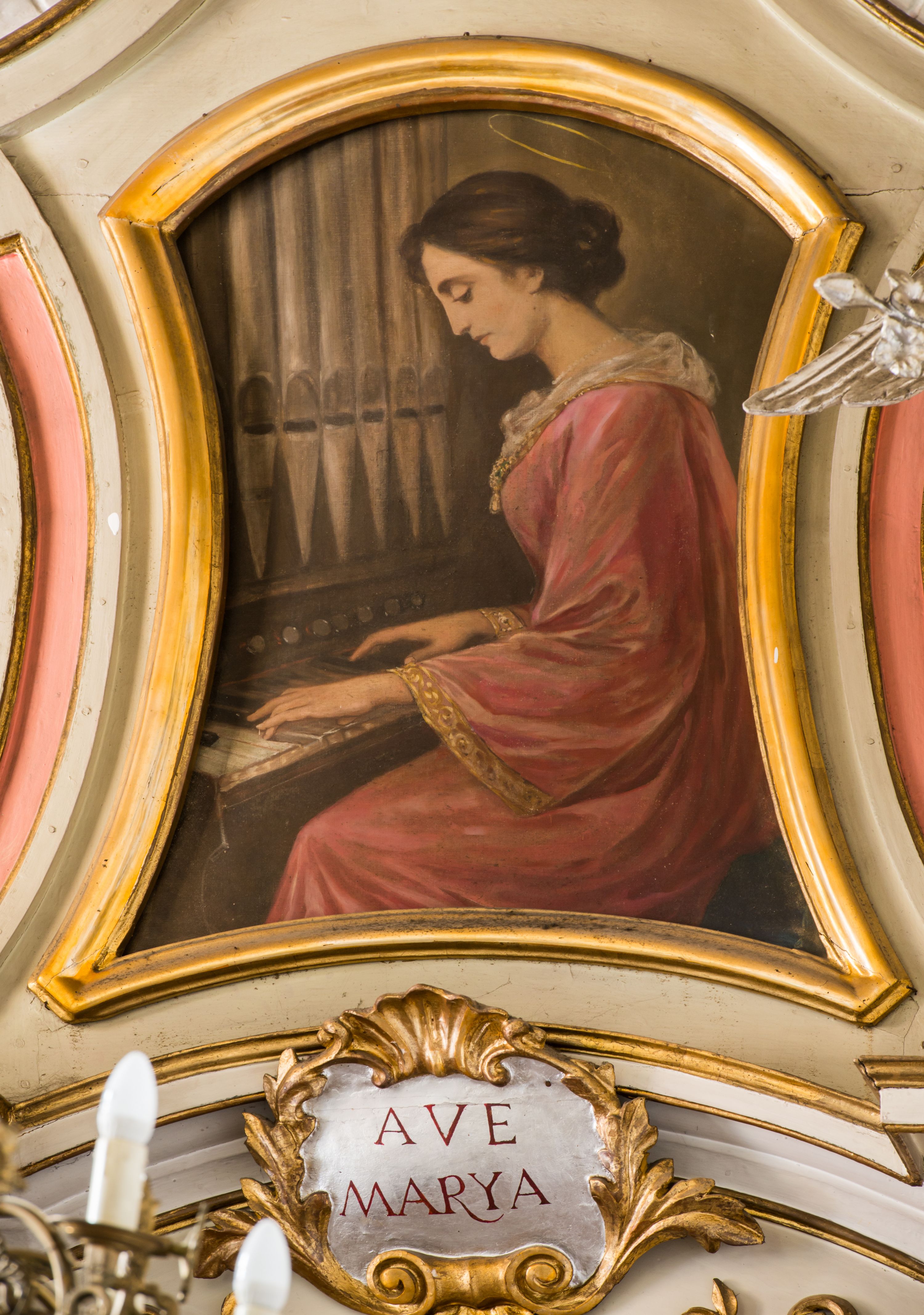 Kondygnację ujmują ażurowe uszaki utworzone z wici roślinnej. Zwieńczenie o kształcie wklęsło-wypukłym, zamknięte od góry łukiem nadwieszonym utworzonym z wolut spiętych muszlą palmetową. Wypełnia je obraz w ramie powtarzającej jego kształt z wizerunkiem św. Cecylii grającej na instrumencie. Zwieńczenie ujmują podobne, ażurowe uszaki.