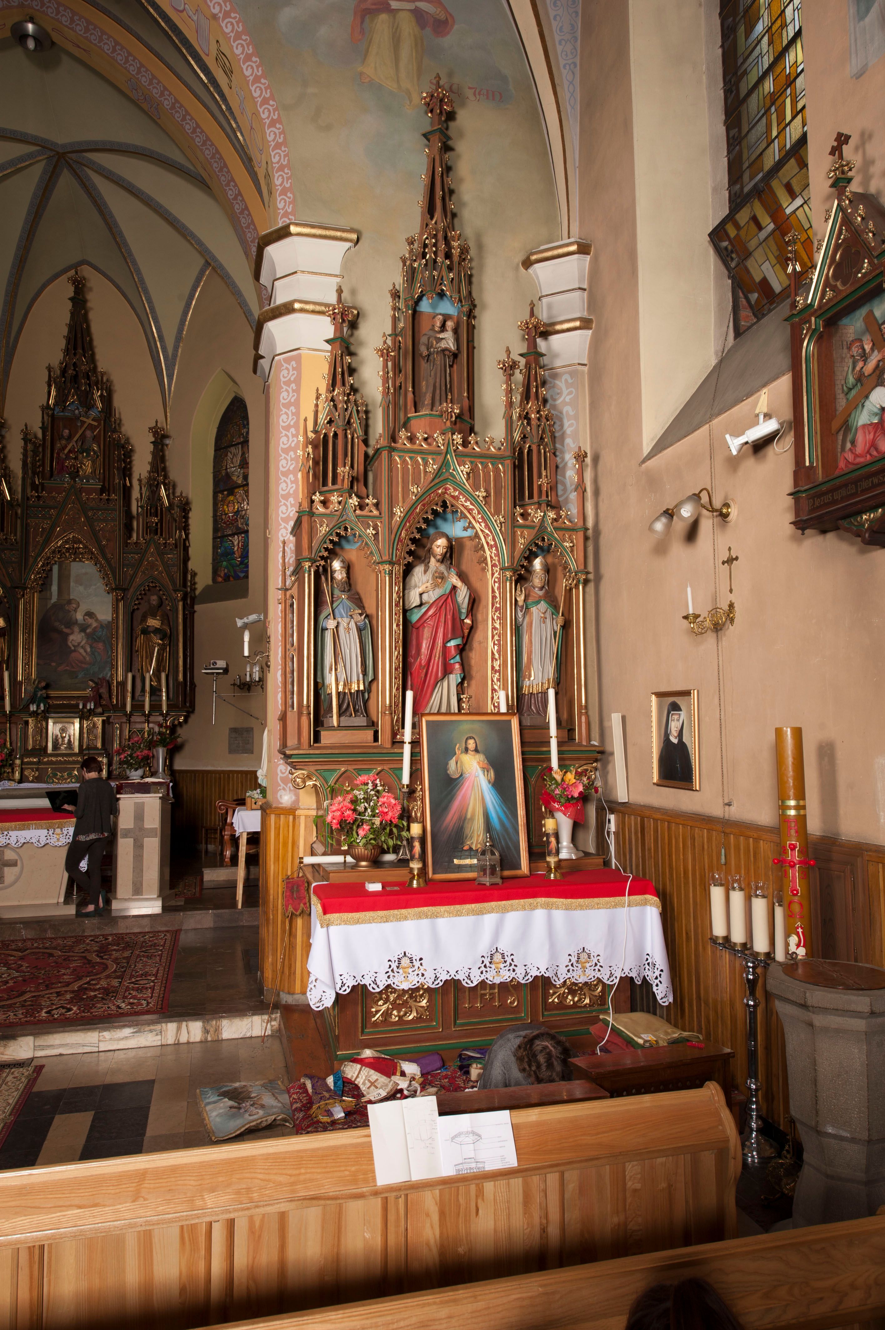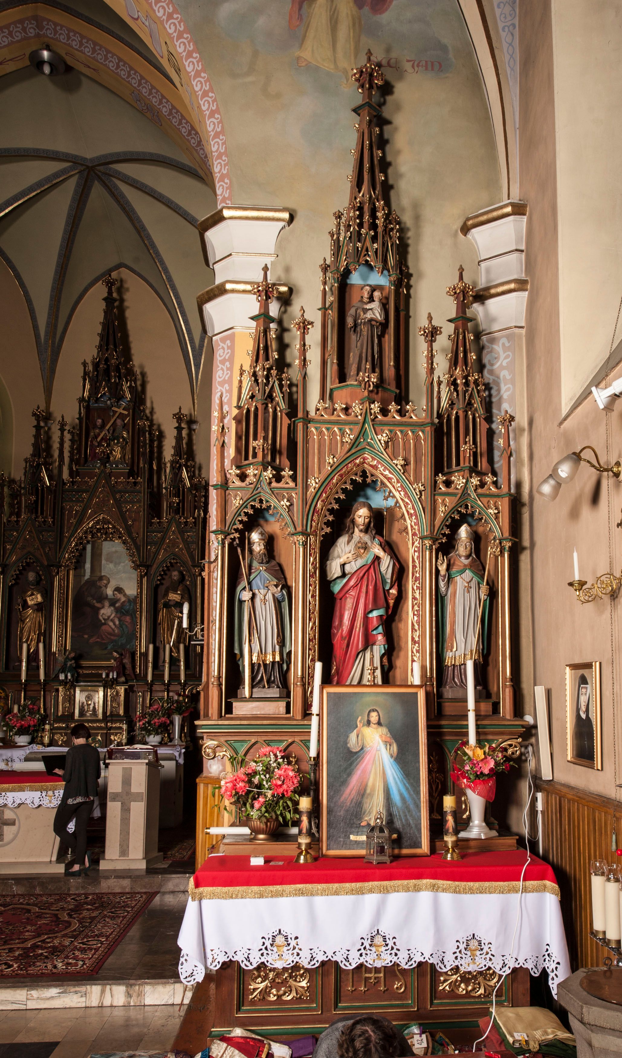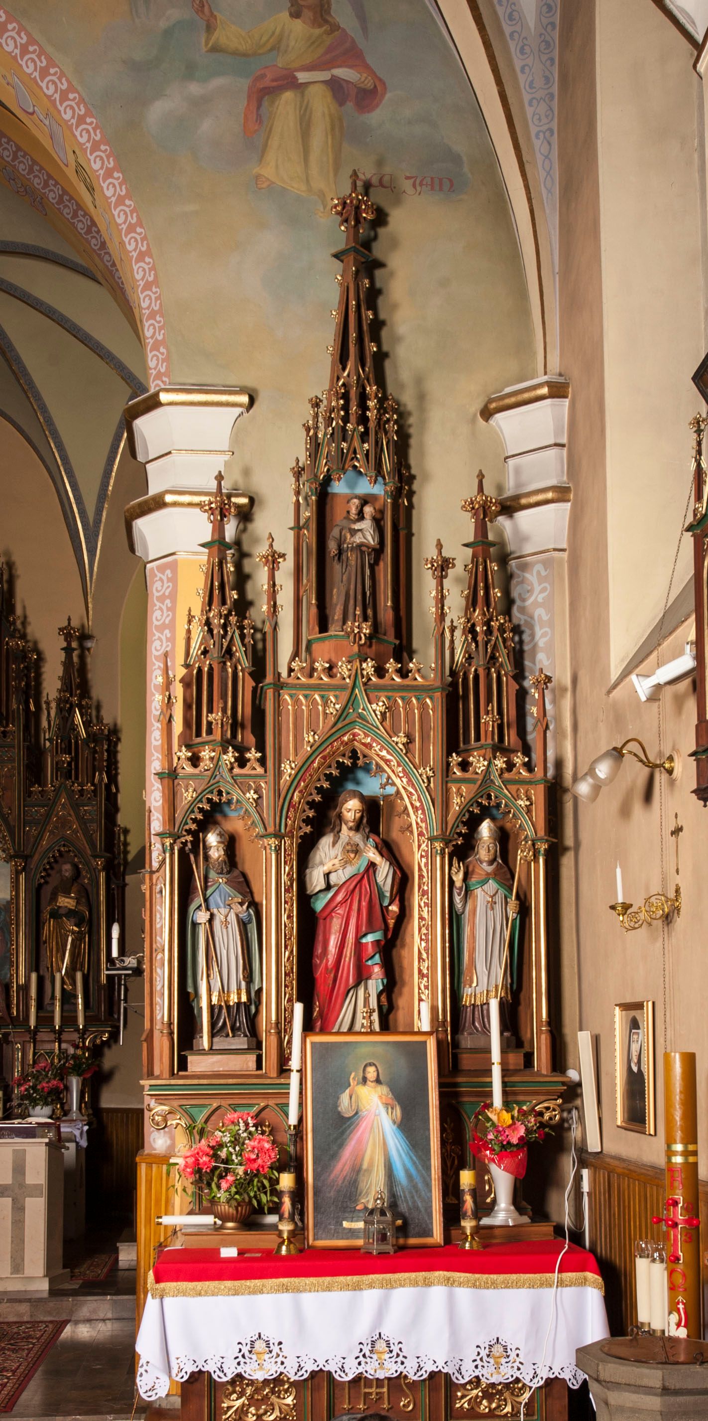 Ołtarz przyścienny, architektoniczny, trójosiowy, jednokondygnacyjny ze zwieńczeniem. Mensa skrzyniowa, prostopadłościenna. Antepedium z trzema prostokątnymi płycinami. W środkowej monogram IHS, boczne wypełnione symetrycznym ornamentem roślinnym. Predella wysoka, dekorowana fryzem arkadkowym, ostrołukowym. W pierwszej kondygnacji retabulum trzy nisze prostokątne zamknięte od góry wimpergą na tle szczytu. Środkowa nisza wyższa i szersza od bocznych, rama dekorowana wyschniętą wicią roślinną, wszystkie zdobione ażurowym ornamentem ostrołukowym i żabkami; szczyty wypełniają pola wypełnione łukiem trójlistnym, ostrym. Boczne nisze zwieńczone ustawionymi skośnie ażurowymi kapliczkami z pinaklami, zdobionymi żabkami i kwiatonami. W środkowej niszy figura Najświętszego Serca Jezusa, w bocznych św. Wojciech i św. Stanisław. W zwieńczeniu ażurowa kapliczka powtarzająca kształt kapliczek wieńczących osie boczne pierwszej kondygnacji z niszą, w której figura św. Antoniego Padewskiego.