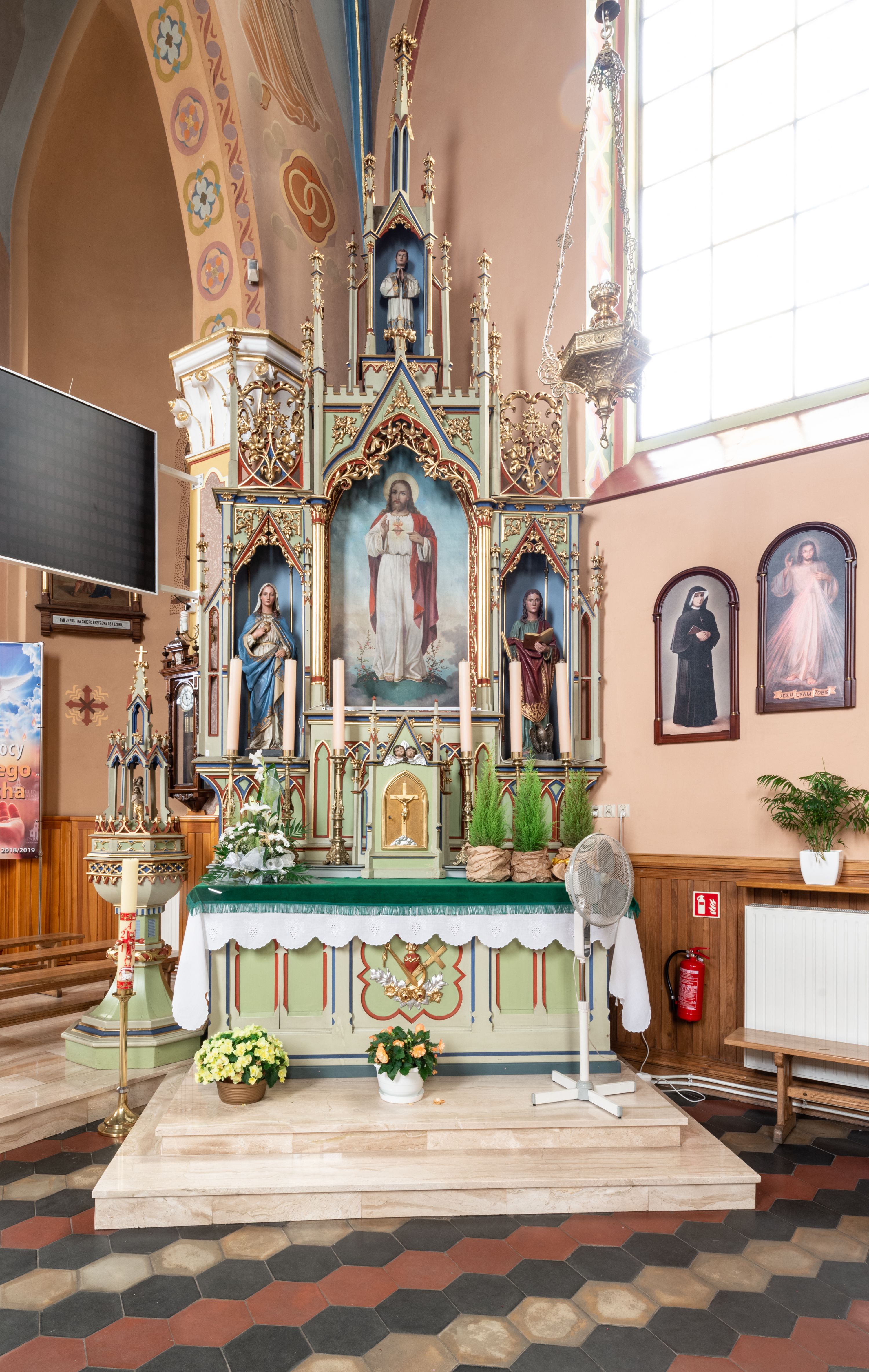 Ołtarz przyścienny, architektoniczny, trójosiowy, jednokondygnacyjny ze zwieńczeniem. Mensa skrzyniowa, prostopadłościenna, z antepedium dekorowanym płycinami. W środkowej plakieta z symbolami płonącego serca oplecionego koroną cierniową, krzyża i kotwicy ujętymi kwitnącymi kwiatami i liśćmi. Na mensie tabernakulum w formie prostopadłościanu zwieńczonego wimpergą wypełnioną uskrzydlonymi główkami anielskimi, ujetą pinaklami. W centrum ostrołukowe drzwiczki z podobizną ukrzyżoanego Chrystusa. Predella trójdzielna ze środkową częścią wyższą, dekorowana fryzem z przenikających się arkadek, w środkowej części flankowanym blendami. W pierwszej kondygnacji retabulum trzy nisze prostokątne, z których środkowa zamknięta trójlistnie a boczne trójkątnie. Środkowa nisza wyższa i szersza od bocznych, rama dekorowana ornamentem, wszystkie zdobione ażurowym ornamentem roślinnym i żabkami; szczyty z fragmentami ornamentyki geometryczno-roślinnej. Boczne nisze zwieńczone pinaklami, między którymi przenikające się żebra zwieńczone kwiatonem i fragmentami wolut, wypełnione wicią roślinną. W środkowej niszy kondygnacji obraz z przedstawieniem najświętszego Serca Jezusa, w bocznych figury Najświętszego Serca Marii z lewej i św. Jana Ewangelisty z prawej strony. Kondygnacja ujęta uszami utworzonymi z przypór z pinaklami. W zwieńczeniu ażurowa kapliczka ujęta pinaklami, w której figura modlącego się księdza.