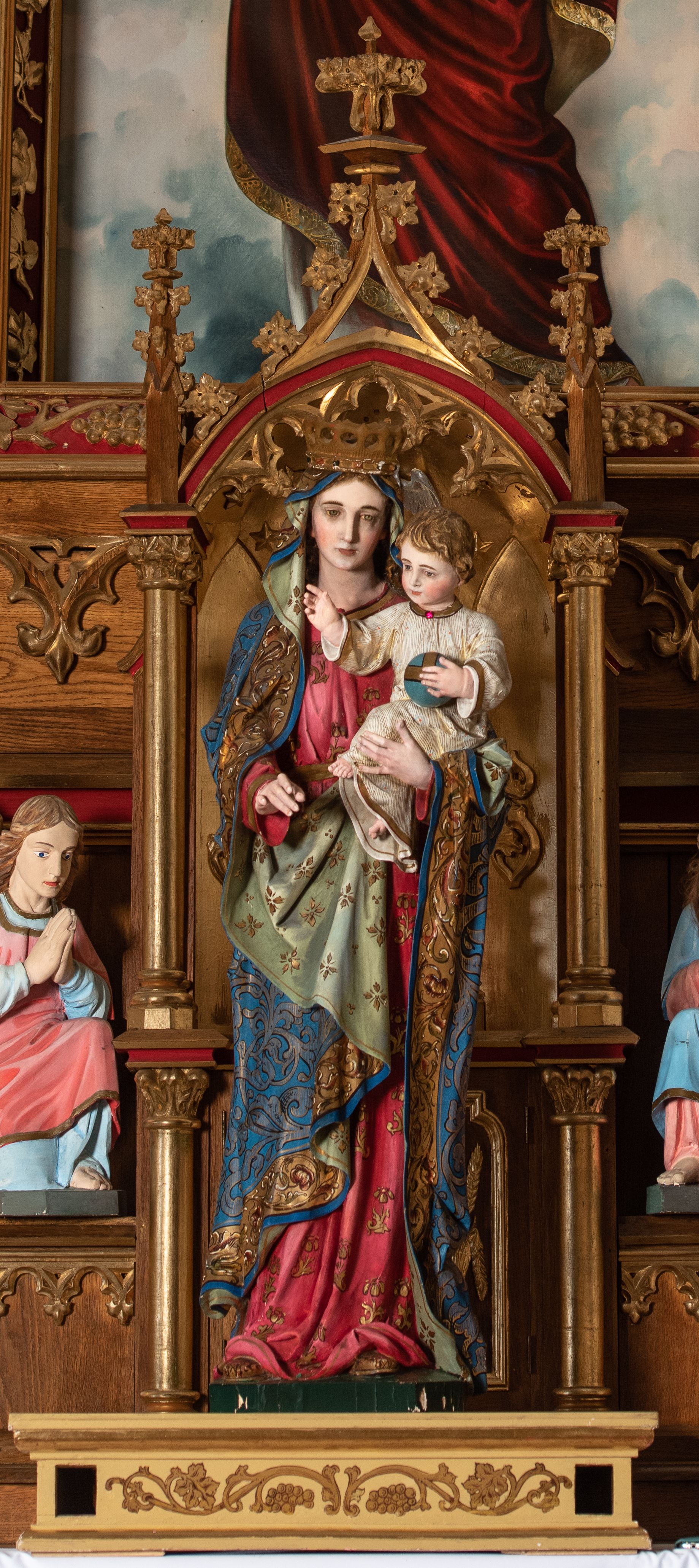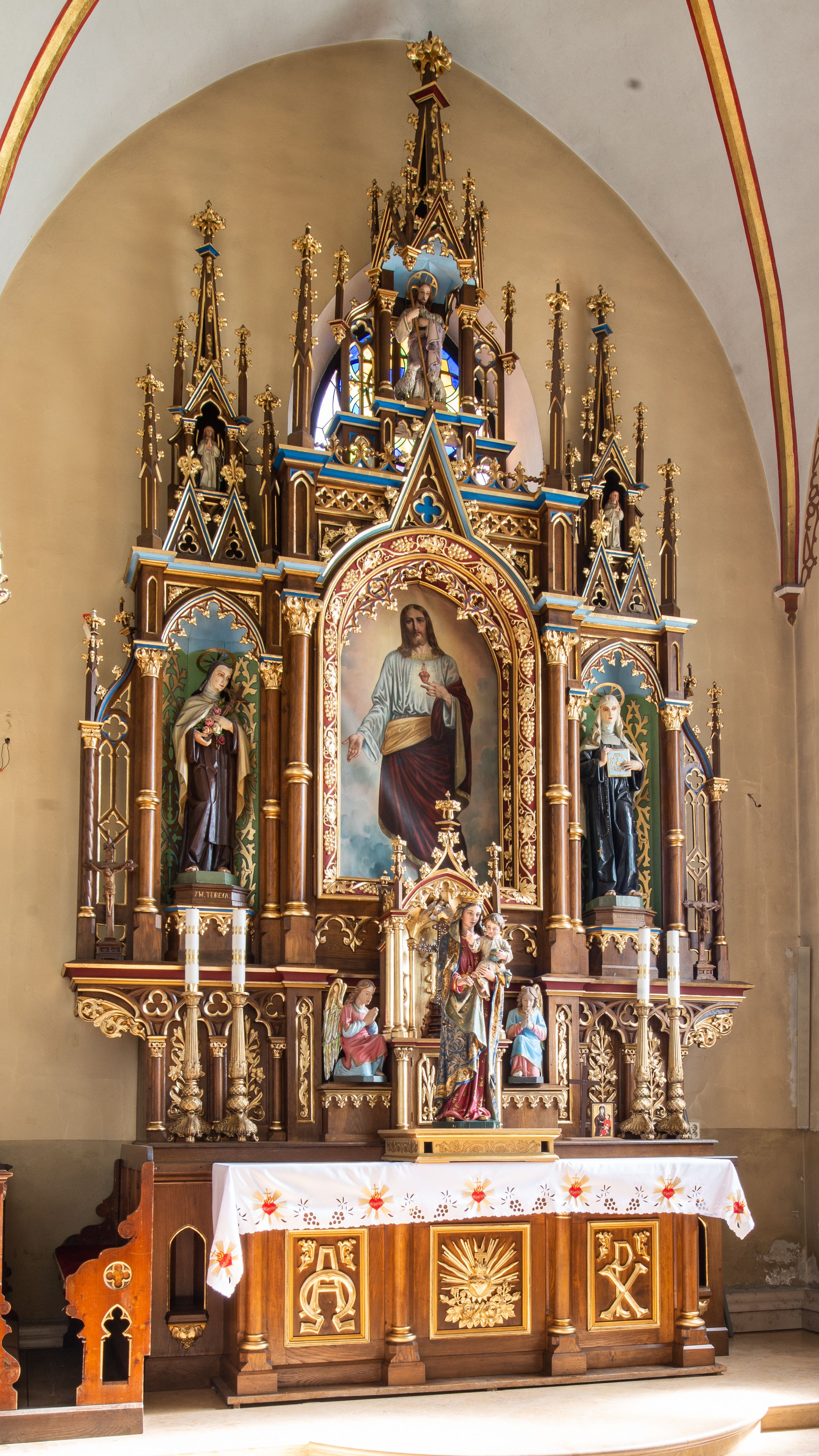 Jednokondygnacyjny i trójosiowy ołtarz ze zwieńczeniem uzyskał architektoniczną, bejcowaną i lakierowaną strukturę z partiami detalu i ornamentyką polichromowaną w kolorze czerwonym i niebieskim. Stipes ołtarzowy przyjął kształt prostopadłościanu z drewnianą mensą. Jego przód zdobią trzy pola z czworobocznymi płycinami ujętymi w złocone, profilowane ramki, rozdzielone kolumienkami z kapitelami korynckimi, ustawione na wysokich cokolikach z uskokiem. Środkową płaszczyznę dekoruje płaskorzeźbione i złocone przedstawienie Boskiego Serca w promienistej glorii z girlandą różaną. W dwóch pozostałych umieszczono płaskorzeźbione i złocone splecione litery Alfa i Omega oraz znak "Chi-Ro". Za ołtarzem rozpościera się wysoki cokół z parą niszy o konsolach zdobionych winną latoroślą. Na nim wspiera się predella nastawy dekorowana trójlistnymi arkadkami wspartymi na kolumienkach o złoconych korynckich kapitelach. W polach arkad umieszczono płaskorzeźbione i złocone przedstawienia stylizowanego kwiatu lilii. Na końcach predelli umieszczono ornament akantowy. Pośrodku predelli wkomponowano tabernakulum z tronem wystawienia. Tabernakulum uzyskało kształt prostopadłościennej szafki flankowanej parą złoconych kolumienek wspierających wyłamujący się ponad nimi gzyms. Dwuskrzydłowe drzwiczki zdobią płaskorzeźbione, złocone kłosy zbóż. Tabernakulum wieńczy złocony tron wystawienia w formie baldachimu wspartego na czterech kolumienkach, zamkniętego trzema ściankami z ośmioboku. Z kolei baldachim wieńczy ażurowa wimperga i para pinakli zdobione czołgankami i kwiatonami. Całość flankuje para prostopadłościennych cokołów zdobionych złoconym ornamentem, z dwoma figurami przyklękających na jednym kolanie aniołów z rękoma złożonymi w geście modlitewnym, ubranych w błękitno-różowe tuniki i dalmatyki. Każda z osi retabulum ujęta została parą kolumienek wspierających częściowo przerwane, wyłamujące się ponad nimi belkowanie. Gzyms w części środkowej uzyskał formę wimpergi. Retabulum po bokach zostało ujęte parą ażurowych uszaków z pojedynczymi kolumienkami o skręconych trzonach, zwieńczonych pojedynczymi pinaklami. Część środkowa zwieńczenia została ustawiona na cokole o zryzalitowanych bokach zwieńczonych parą pinakli. W szczycie usytuowano wsparty na parze kolumienek ażurowy baldachim z alternacji wimperg i pinakli, z wysokim, ażurowym pinaklem pośrodku. Nad osiami bocznymi retabulum usytuowano formy pary niewielkich kapliczek, których kolumienki wspierają wieńczące je duże, ażurowe pinakle oraz wimpergi flankowane parami mniejszych pinakli. Kapliczki ujęte są parami ażurowych wimperg u dołu oraz parami wysokich pinakli po bokach. Pinakle i wimpergi całej nastawy zdobione są złoconymi czołgankami i kwiatonami. Pole osi środkowej retabulum uzyskało formę płytkiej wnęki w kształcie stojącego prostokąta zamkniętego łukiem półkolistym z arkaturą. Ujmuje go profilowana, złocona rama zdobiona złoconą wicią winnej latorośli na ciemnoczerwonym tle. W środku umieszczono obraz Najświętsze Serce Pana Jezusa. Pola osi bocznych nastawy uzyskały formę trójbocznych niszy w kształcie stojących prostokątów zamkniętych łukiem ostrym o krawędzi zdobionej ażurowym ornamentem. Ścianki niszy pokrywa malowany, złocony astwerk na jasnozielonym tle, natomiast ich konchy błękit. Na ośmiobocznych postumentach zdobionych ornamentem ustawiono rzeźby świętych z podpisami. Z lewej strony znalazła się św. Teresa od Dzieciątka Jezus, a z prawej św. Małgorzata Alacoque. W zwieńczeniu, pośrodku, pod baldachimem umieszczono rzeźbę Chrystusa Dobrego Pasterza. Natomiast w kapliczkach po bokach parę figurek stojących aniołków ze złożonymi w geście modlitewnym rękoma.
