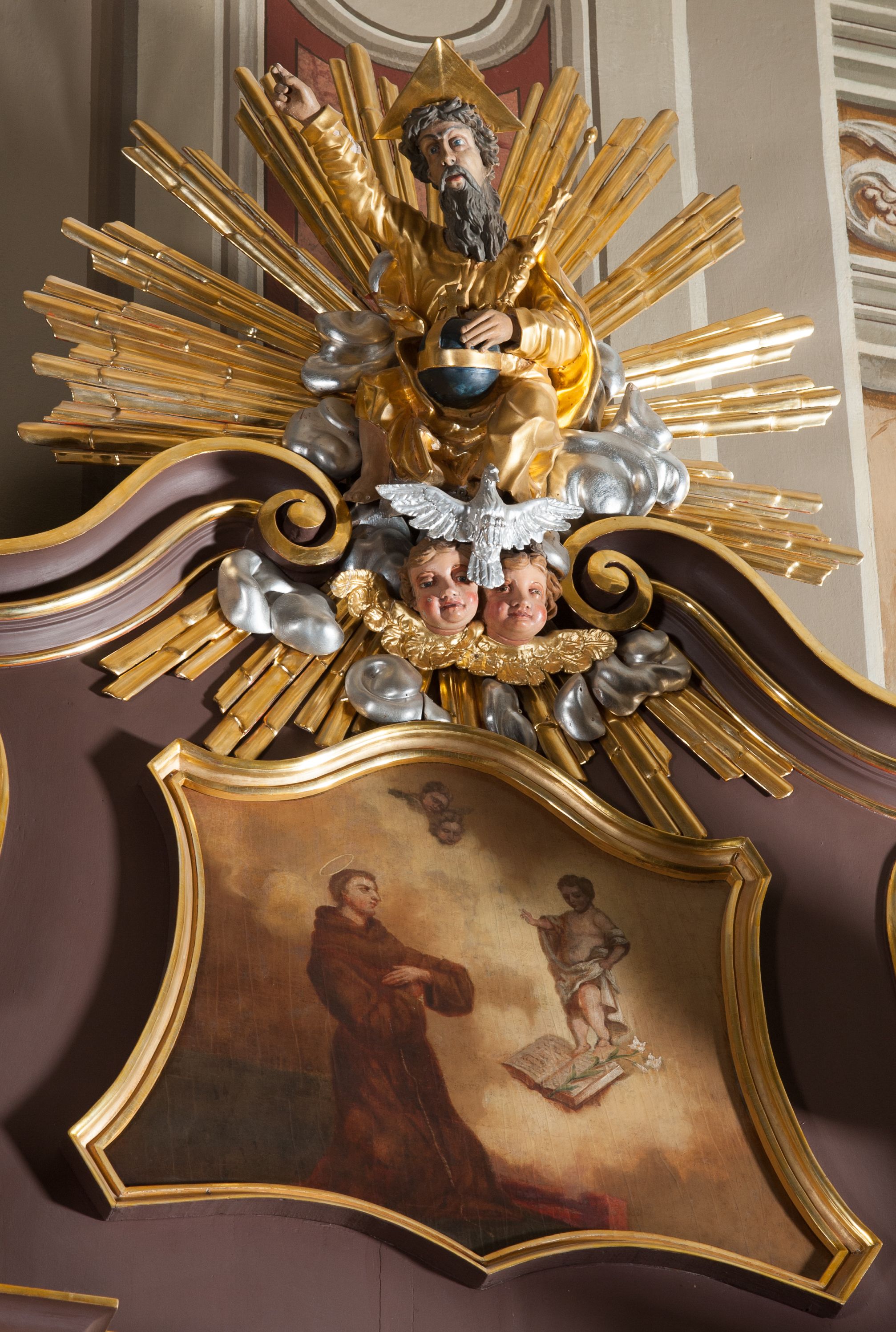 Ołtarz przyścienny, architektoniczny, jednoosiowy, jednokondygnacjowy ze zwieńczeniem. Retabulum ustawione na wysokim cokole, przed którym stoi mensa w typie sarkofagowym. Na mensie tabernakulum w formie prostopadłościanu, którego ściana frontowa jest flankowana parą dostawionych skośnie kolumn, a tylna wolutami. Tabernakulum na cokole, na ścianie frontowej drzwi w kształcie prostokąta zamkniętego od góry łukiem nadwieszonym, z przedstawieniem wypukłorzeźbionej, silnie plastycznej sceny chrztu Chrystusa. Z prawej strony św. Jan Chrzciciel, który prawym kolanem klęczy na głazie, prawą ręką polewa wodą głowę stojącego po lewej stronie Chrystusa. Za nimi dwie postaci, powyżej gołębica Ducha Świętego. W górnych narożnikach ściany frontowej tabernakulum dwa, symetrycznie ułożone ornamenty rocaille. Główne pole właściwego retabulum flankują kolumny korynckie o trzonach dekorowanych wicią, ustawione na tle zwielokrotnionych pilastrów; podpory posadowione na ukośnie ustawionych, rozsuniętych postumentach dekorowanych kwadratowymi płycinami, dźwigają belkowanie przełamane na ich osiach, z odcinkami także ustawionymi skośnie. W prostokątnym polu głównym nastawy ołtarzowej obraz z przedstawieniem Matki Boskiej Bolesnej poniżej monogramu maryjnego uwitego ze wstęgi, w prostokątnej ramie zamkniętej od góry łukiem nadwieszonym. Górne naroża pola wypełniają płomieniste motywy rocaille przechodzące w dół w fantazyjną wić roślinną. Na fryzie belkowania umieszczono ornament roślinny z muszlami, a dolna część gzymsu ma formę pasa ażurowej dekoracji z motywów rocaille na czerwonym tle. Na środku tej dekoracji niewielki kartusz z napisem. Na rozsuniętych odcinkach belkowania, na osi kolumn, umieszczone fragmenty pękniętego półkolistego przyczółka; na nich siedzą anioły. Zwieńczenie umieszczone pomiędzy tymi odcinkami w formie ścianki o ogólnym zarysie trapezu o wklęsłych bokach. Wypełnia ją obraz z przedstawieniem św. Antoniego we wklęsło-wypukłej ramie powtarzającej zarys zwieńczenia, które od góry zamknięte jest dwoma wolutami. W miejscu ich styku, na osi, rzeźbione przedstawienie tronującego Boga Ojca pośród chmur, powyżej główek anielskich i na tle glorii promienistej. Bóg prawą rękę wznosi do góry, lewą trzyma na jabłku królewskim i przytrzymuje berło, u stóp gołębica Ducha Świętego. Struktura ołtarza malowana na kolor brązowy; profile, detale, ornamenty i kolumny złocone, postacie w partiach karnacji polichromowane naturalistycznie.