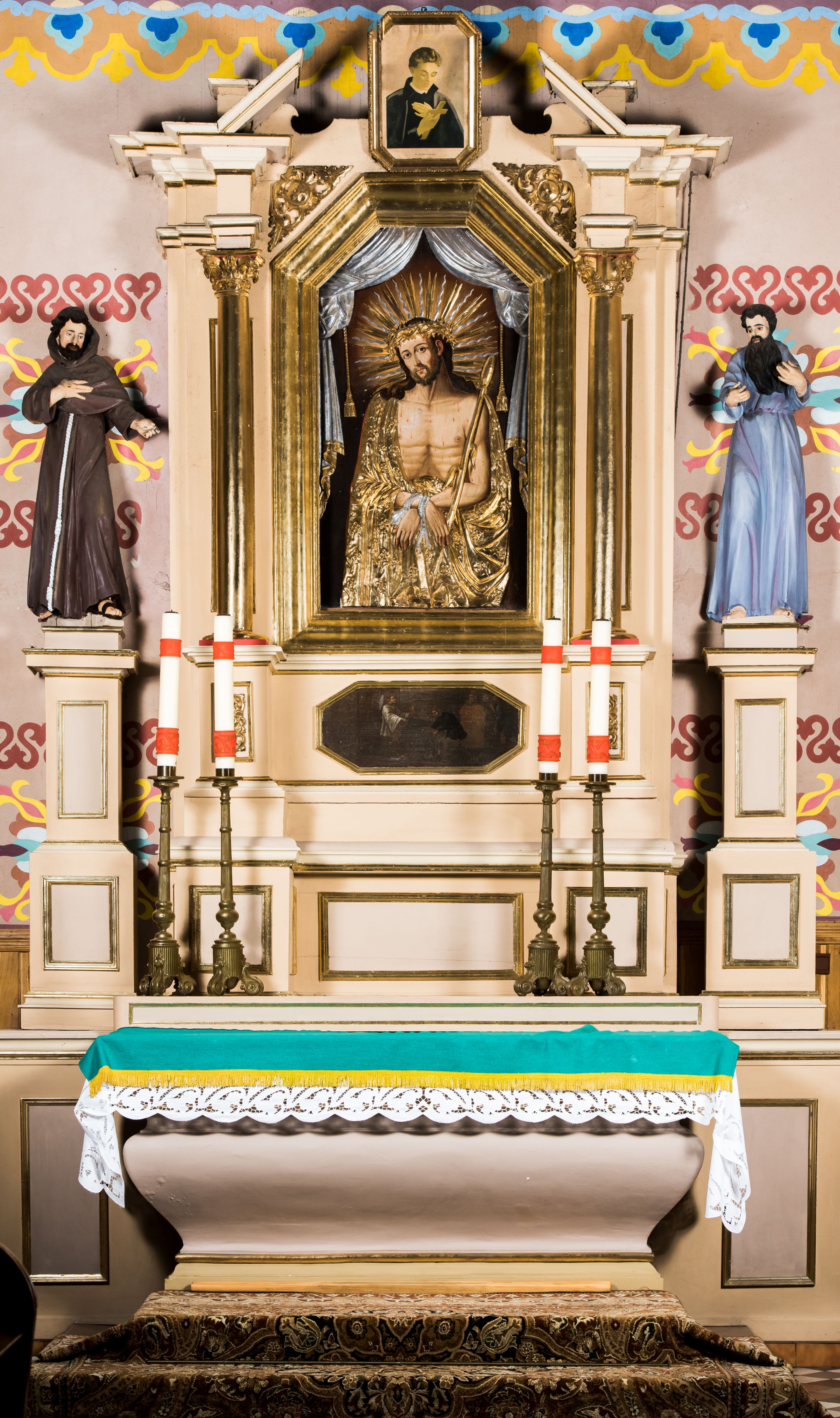 Ołtarz z Panem Jezusem Cierpiącym w typie Ecce Homo stanowi popularny przykład architektonicznej nastawy z początku XVIII wieku, jakich wiele można spotkać w kościołach małopolskich. Zapewne pierwotnie w ołtarzu znajdował się obraz św. Antoniego z Padwy z początku XVIII wieku, obecnie zawieszony na jednym z filarów kościoła, za czym przemawia jego kształt i wymiary oraz znajdujący się w partii cokołowej ołtarza przedstawienie cudu św. Antoniego z osłem.