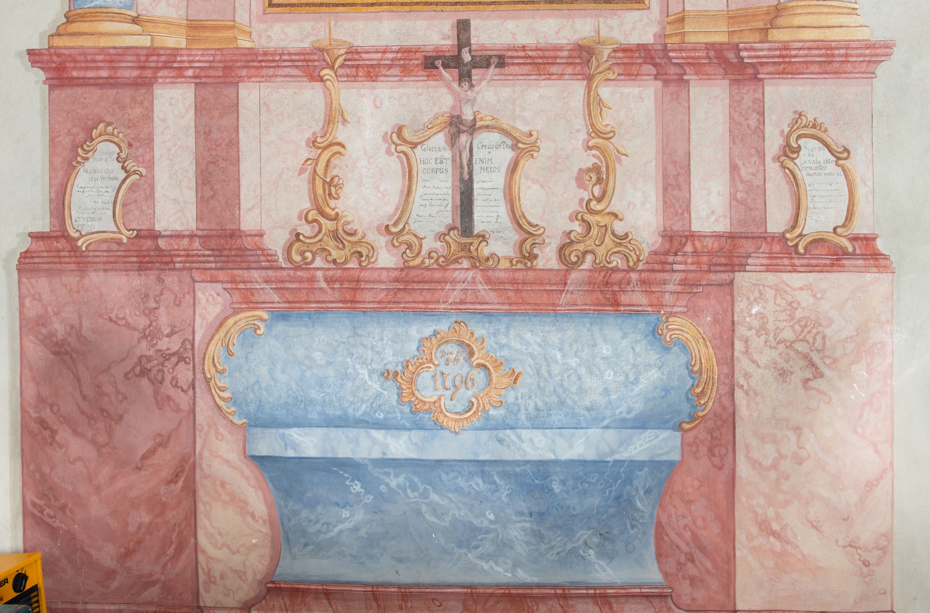 Polichromia została wykonana w 1796 roku. Malowidło przedstawia ukazany w sposób iluzjonistyczny ołtarz boczny św. Józefa. W górnej partii cokołu znajdują się trzy rocaille’owe płyciny z modlitwami z kanonu mszy świętej. W polu głównym w ramie w kształcie stojącego prostokąta zamkniętego łukiem wklęsło-wypukłym z uskokami został namalowany obraz św. Józefa z Dzieciątkiem, a w zwieńczeniu w owalnej ramie obraz św. Jana Nepomucena.