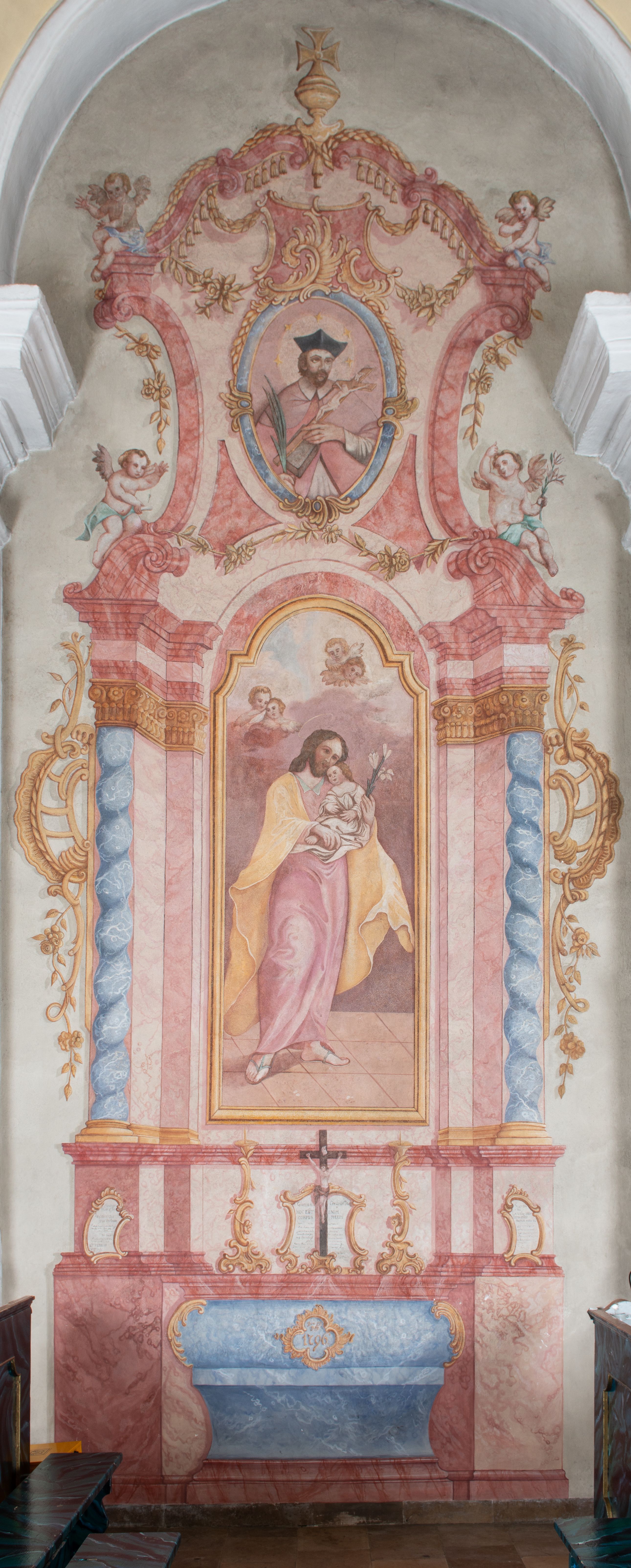 Polichromia ścienna przedstawia ukazany w sposób iluzjonistyczny ołtarz boczny św. Józefa. Mensa sarkofagowa, ozdobiona rocaille’owym kartuszem z napisem: „Dia 22 / July / 1796.”. Nastawa ustawiona na zdwojonym cokole. W górnej partii cokołu trzy rocaille’owe płyciny z modlitwami z kanonu mszy świętej. Na płycinie środkowej: „Gloria Credo in Deo / HOC EST ENIM / CORPUS MEUM”. Na płycinie lewej: „Evange/lium S 90 / IN principca / cruc Verbum, (…)VERBUM / CA(…)FA”. Na płycinie prawej: „Deus (…) / Mc / LAVabo inter / innocentes / manus meas”. Na mensie ołtarzowej na tle kanonu ustawiony jest krucyfiks, a po bokach dwa rokokowe lichtarze. Nastawa ujęta parami pilastrów, ustawionymi przed nimi filarami oraz kolumnami. Kolumny o kręconych trzonach, kapitele fantazyjne. Podpory podtrzymują pełne, przerwane nad polem głównym belkowanie z wolutowymi przyczółkami, na których usadzona jest para aniołków. W polu głównym w ramie w kształcie stojącego prostokąta zamkniętego łukiem wklęsło-wypukłym z uskokami jest namalowany obraz św. Józefa z Dzieciątkiem. Po bokach ołtarza rocaille’owe uszy ze zwisami kwiatowymi. Zwieńczenie w kształcie zbliżonym do stojącego prostokąta o wklęsłych bokach, ujętych spływami wolutowymi, na których w górnej części po bokach znajdują się imposty z usadzonymi na nich dwoma aniołkami. Szczyt zamknięty czterema spiętymi wolutkami, pośrodku krzyż o kształcie krzyża maltańskiego, poniżej podwieszony pas lambrekinu. W polu głównym zwieńczenia w owalnej ramie obraz przedstawiający św. Jana Nepomucena. Zwieńczenie dekorowane zwisami z gałązek różanych. Nastawa marmoryzowana w kolorze jasnoróżowym i jasnoróżowym, trzony kolumn, rama obrazu ze św. Janem Nepomucenem oraz mensa w kolorze jasnoniebieskim, a ornamentyka malowana jest w kolorze złotym.