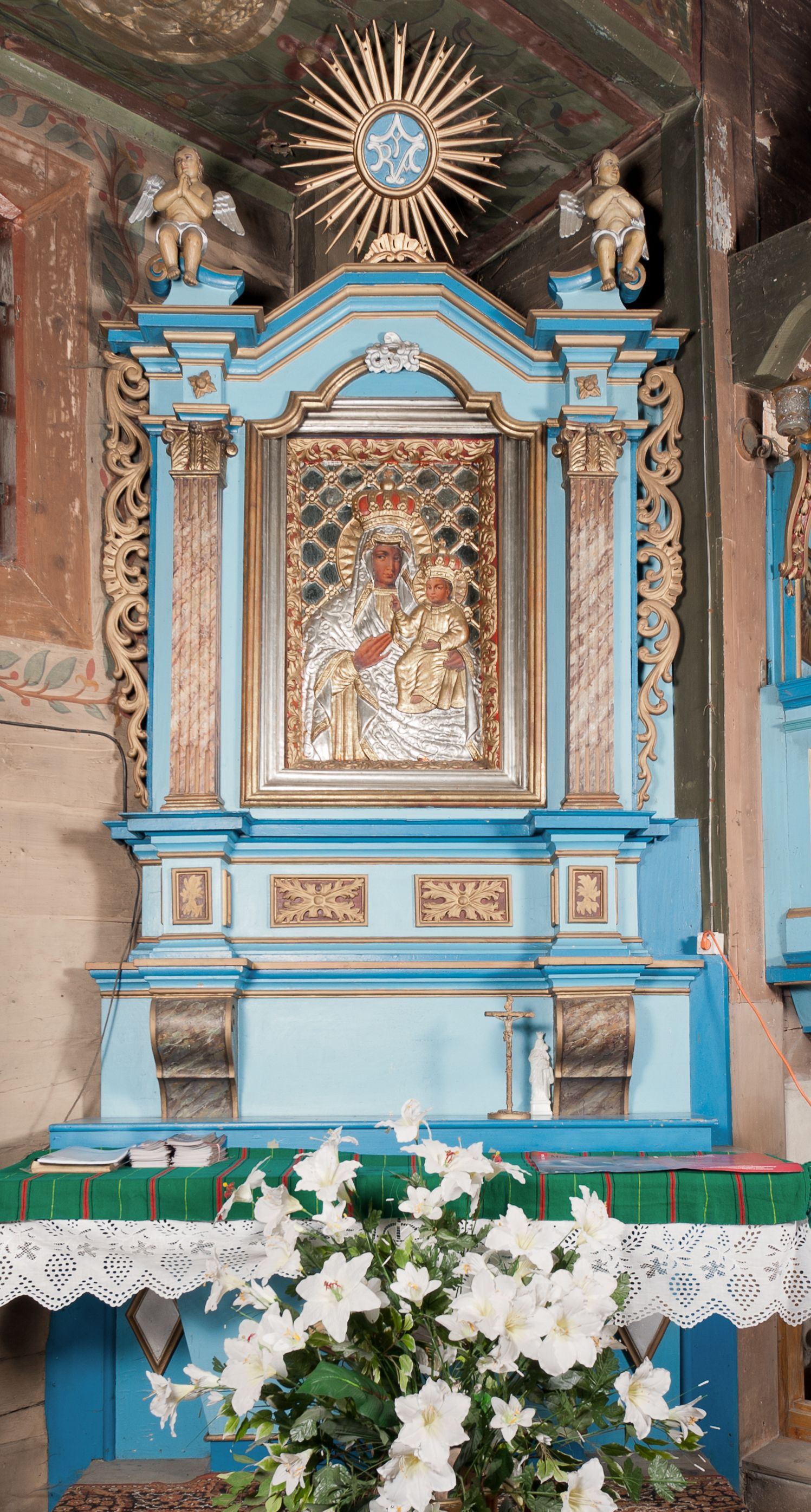 Ołtarz drewniany, polichromowany, marmoryzowany, złocony, umieszczony po północnej stronie tęczy. Retabulum architektoniczne, jednoosiowe, jednokondygnacyjne, ze zwieńczeniem; flankowane parą półfilarów o stylizowanych kapitelach kompozytowych i kanelowanych trzonach. W polu środkowym obraz Matki Boskiej z Dzieciątkiem, w zwieńczeniu medalion ze splecionymi literami imienia Maria w glorii promienistej oraz rzeźby dwóch uskrzydlonych puttów. Ołtarz późnobarokowy, sprawiony na początku XIX wieku, wykonany w warsztacie małopolskim.