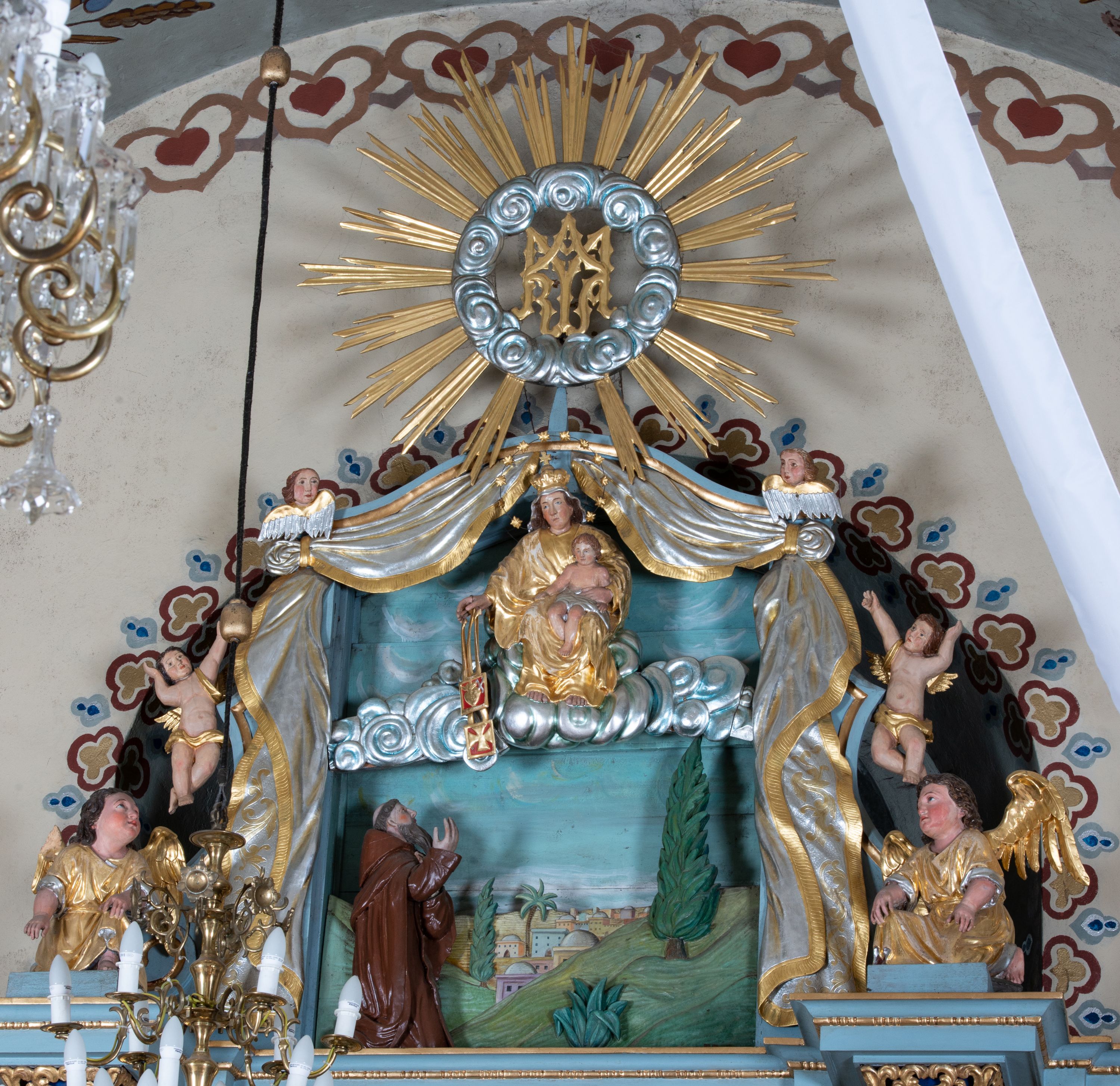Cokół nastawy zdobiony kratkowaniem, a po bokach prostokątnymi płycinami ze stylizowaną dekoracją akantową. Retabulum flankowane zdwojoną parą pilastrów i stojącą przed nimi parą kolumn. Podpory dźwigają wyłamane na osi belkowanie. Kolumny ustawione na bazach, trzony gładkie i złocone, wybrzuszone pośrodku, kapitele kompozytowe. W polu głównym w niszy zamkniętej półkolistym łukiem umieszczony jest obraz Matki Boskiej z Dzieciątkiem, a powyżej rzeźba Boga Ojca. Na boku ołtarza znajdują się rzeźby: św. Dominika po lewej i św. Jacka po prawej stronie. Na belkowaniu usadzona jest para aniołków. Zwieńczenie o fantazyjnym kształcie zbliżonym do stojącego prostokąta z płaskorzeźbioną sceną ofiarowania szkaplerza św. Szymonowi Stockowi. U góry zwieńczenia podpięta srebrzona kotara o złoconym brzegu, spływająca na jego boki zwieńczenia. W górnej partii, po bokach para aniołków z wzniesionymi do góry rękami oraz dwie uskrzydlone główki anielskie. Na szczycie nastawy zatknięta jest promienista gloria złożona z wiązek promieni o nierównej długości z monogramem maryjnym otoczonym przez wieniec z obłoków w polu. Po bokach nastawy ołtarzowej umieszczone są uszaki utworzone ze stylizowanego akantu. Polichromia ołtarza w kolorze jasnoniebieskim, dekoracje ornamentalne oraz detale złocone i srebrzone.