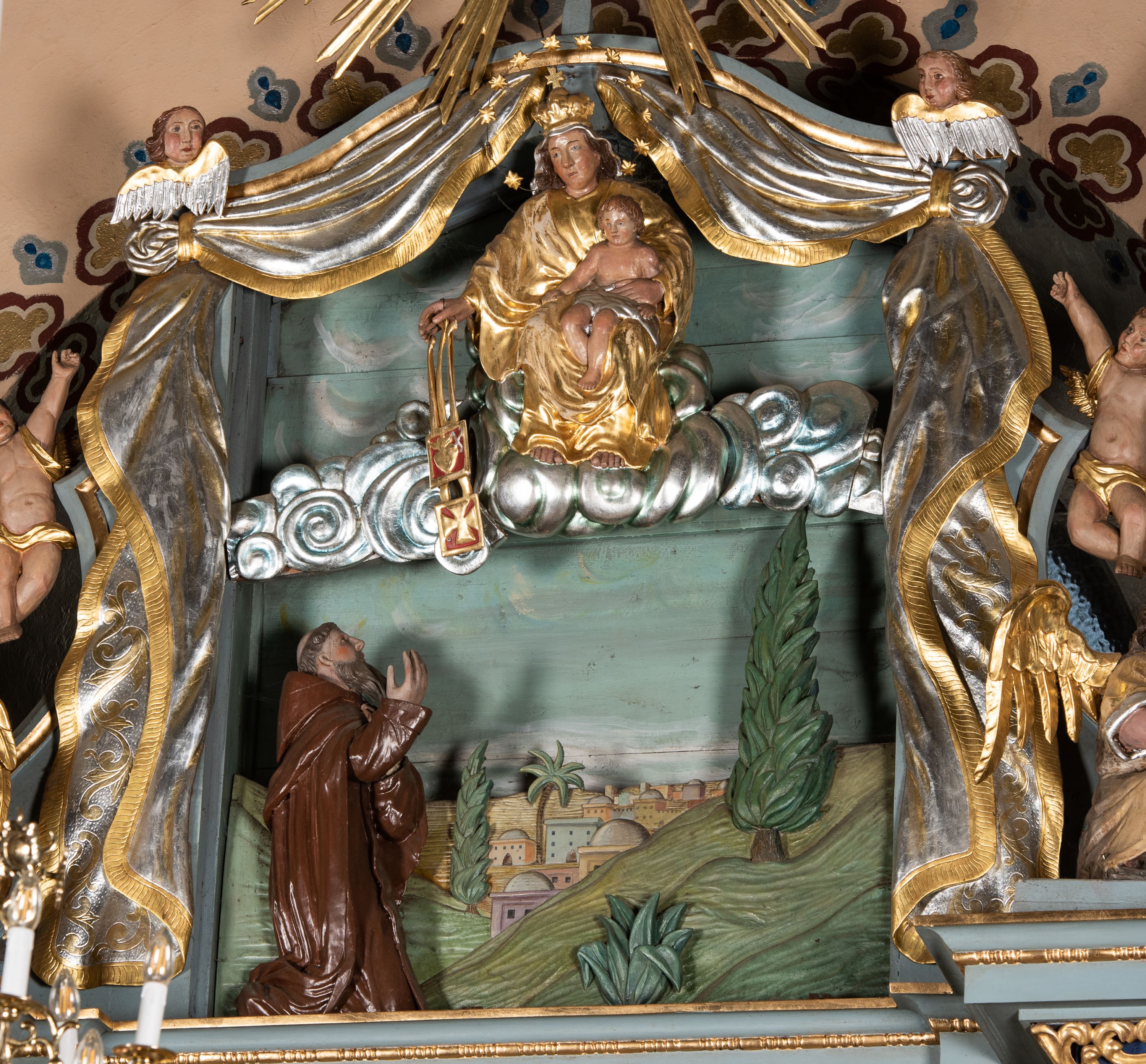 Ikonografia ołtarza w całości poświęcona jest Matce Boskiej. W polu głównym znajduje się otoczony kultem obraz Matki Bożej Sidzińskiej. W zwieńczeniu natomiast jest płaskorzeźba Matki Boskiej Szkaplerznej ze sceną ofiarowania szkaplerza św. Szymonowi Stockowi, a po bokach rzeźby dwóch świętych dominikańskich, których życiorysy były szczególnie związane z kultem maryjnym. Ukazana scena w zwieńczeniu jest ilustracją tradycji zakonu karmelitańskiego, według której w nocy z 15 na 16 lipca 1251 Matka Boska ukazała się św. Szymonowi Stockowi w klasztorze Karmelitów w Cambridge, trzymając w dłoniach szkaplerz i przekazując karmelicie informacje o przywilejach, jakich doznają ci, którzy będą go nosić. Późniejsza tradycja uzupełniła wizję o gest przekazania szkaplerza świętemu. Formułę tę przejęła również sztuka, w której scena ta zaczęła być ukazywana samodzielnie od XVI wieku. Ten typ przedstawienia rozpowszechnił się zwłaszcza w okresie baroku, ale był również bardzo popularny w XIX wieku. Obraz Matki Boskiej Szkaplerznej w zwieńczeniu ołtarza w Sidzinie został umieszczony zgodnie ze starymi zaleceniami dotyczącymi wyglądu brackiego ołtarza, wydanymi w 1650 roku w książce „Skarb karmelitański”: „bractwo ma być postanowione przy pewnym ołtarzu, abo też w kaplicy na to zgotowaney. Na ołtarzu bractwa bądź w kościele bądź w kaplicy będącym będzie obraz Naświętszey Panny podaiącey Szkaplerz sw. Błogosławionemu Szymonowi, iako w historiey piszą y maluią”.