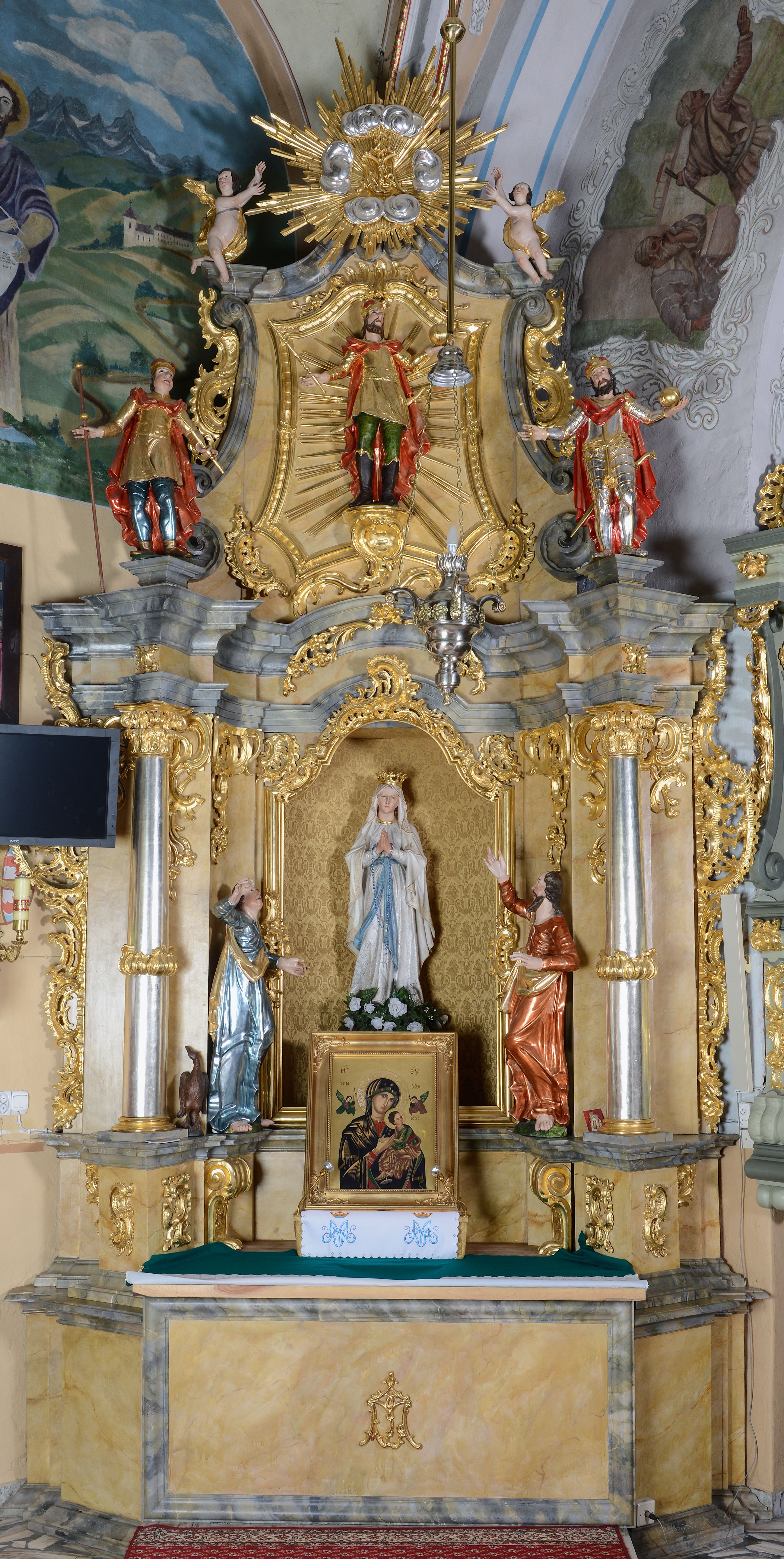 Nastawa ołtarzowa architektoniczna, jednoosiowa, jednokondygnacyjna ze zwieńczeniem. Ołtarz drewniany, prostopadłościenny, mensa drewniana z kamiennym portatylem. Antepedium w kształcie leżącego prostokąta, ujętego profilowaną ramą z aplikowanym monogramem Maryii w polu. Na ołtarzu ustawiony obraz Matki Boskiej Nieustającej Pomocy. Retabulum ustawione na dwustrefowym cokole, ujęte parą kolumn o kapitelach kompozytowych, przewiązanych poniżej połowy rocaille'ową opaską, stojących na tle zwielokrotnionych pilastrów. Podpory dźwigają pełne belkowanie, wyłamane na ich osi, ustawione ukośnie, nad polem środkowym przyjmujące kształt łuku odcinkowego. W polu środkowym głęboka nisza w formie stojącego prostokąta zamkniętego łukiem wklęsło-wypukłym z uskokami, ujęta profilowaną ramą, z figurą Matki Boskiej z Lourdes. Niszę flankują dwie figury: św. Jana i św. Mateusza ustawione na konsolach. Na belkowaniu, na linii podpór cokoły z figurami św. Emeryka i św. Władysława. Zwieńczenie przyjmuje kształt stojącego prostokąta flankowanego spływami wolutowymi, zamkniętego gzymsem przechodzącym w dwie woluty. Całość zakończona promienistą glorią z monogramem Marii otoczonym obłokami, flankowana figurkami aniołków. W polu zwieńczenia rama w formie stojącego prostokąta o wklęsłych bokach i dolnych narożach, zamknięta wolutami, z figurą św. Stefana w polu, ustawioną na wsporniku. Nastawa ujęta po bokach ażurowymi uszami utworzonymi z rocaille'u i prostej karbowanej wstęgi. Całość obficie dekorowana ornamentem rocaille'owym oraz zwisami kwiatowymi. Struktura marmoryzowana w kolorze żółtym, profile marmoryzowane na seledynowo, ornamentyka i profilowania złocone.