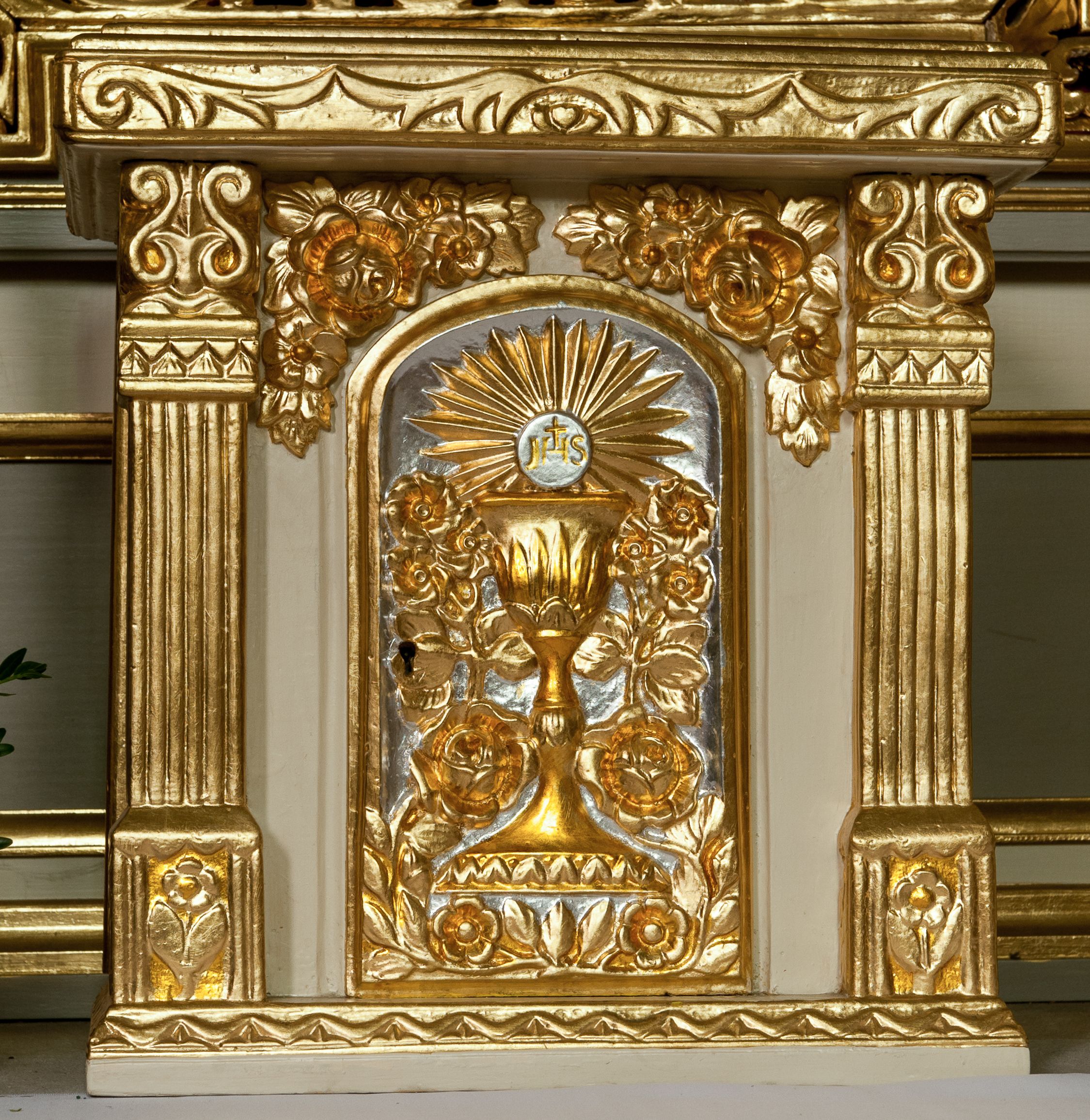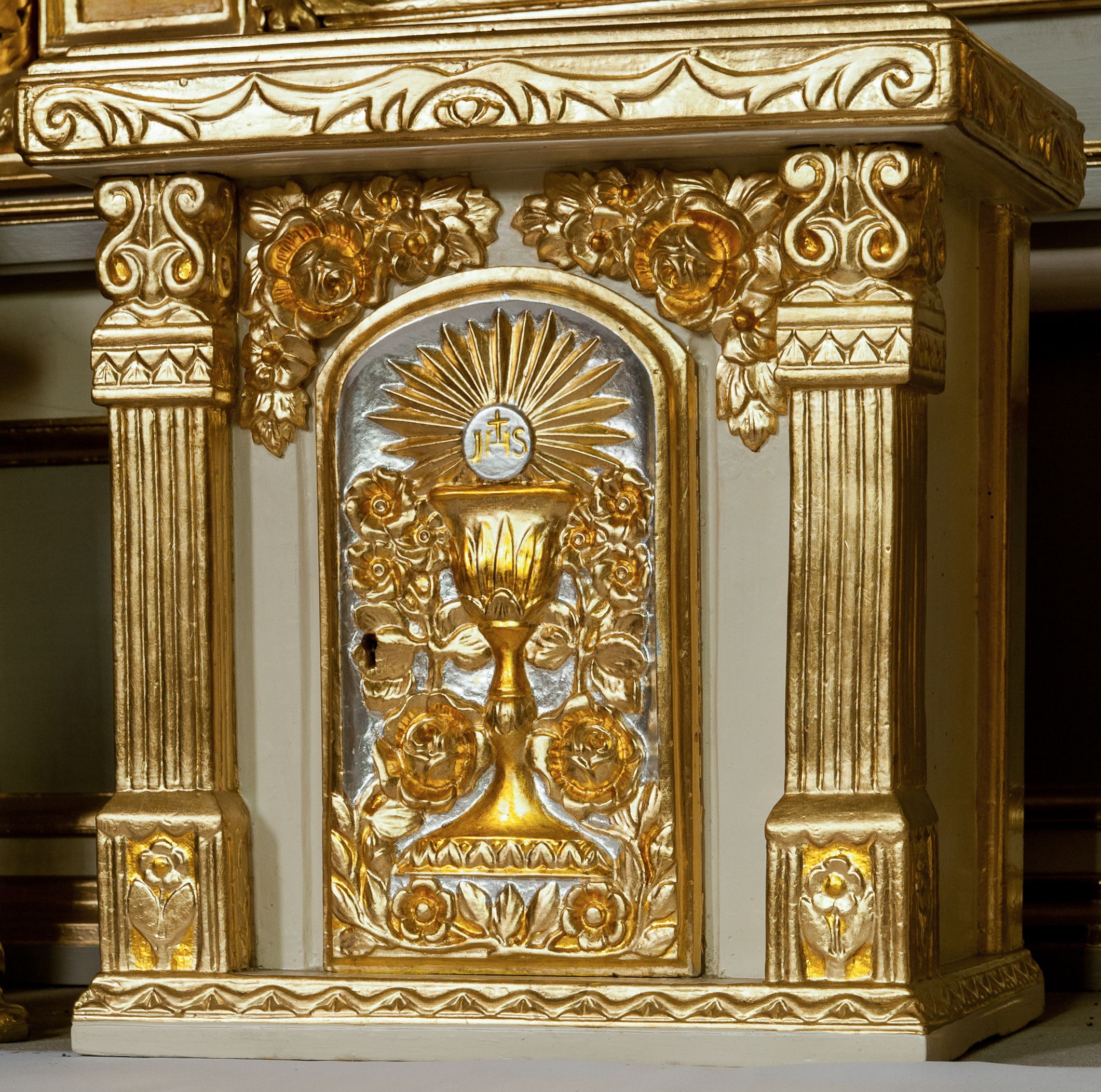 Ołtarz przyścienny, architektoniczny z murowaną mensą z kamiennym portatylem, antepedium z chrystogramem. Na mensie prostopadłościenne tabernakulum, ujęte pilastrami zwieńczonymi gzymsem, z drzwiczkami zakończonymi łukiem koszowym, na których kielich z hostią ujętą kwiatami róż. Nastawa ołtarzowa jednokondygnacyjna, jednoosiowa ze zwieńczeniem. Retabulum ujęte parą kanelowanych filarów o korynckich głowicach, ustawionych na ukośnie dostawionych cokołach. Podpory ustawione na tle kanelowanych pilastrów wspierają ukośne odcinki belkowania zamknięte wydatnym gzymsem. Zwieńczenie o wklęsłych bokach, zamknięte łukiem nadwieszanym.