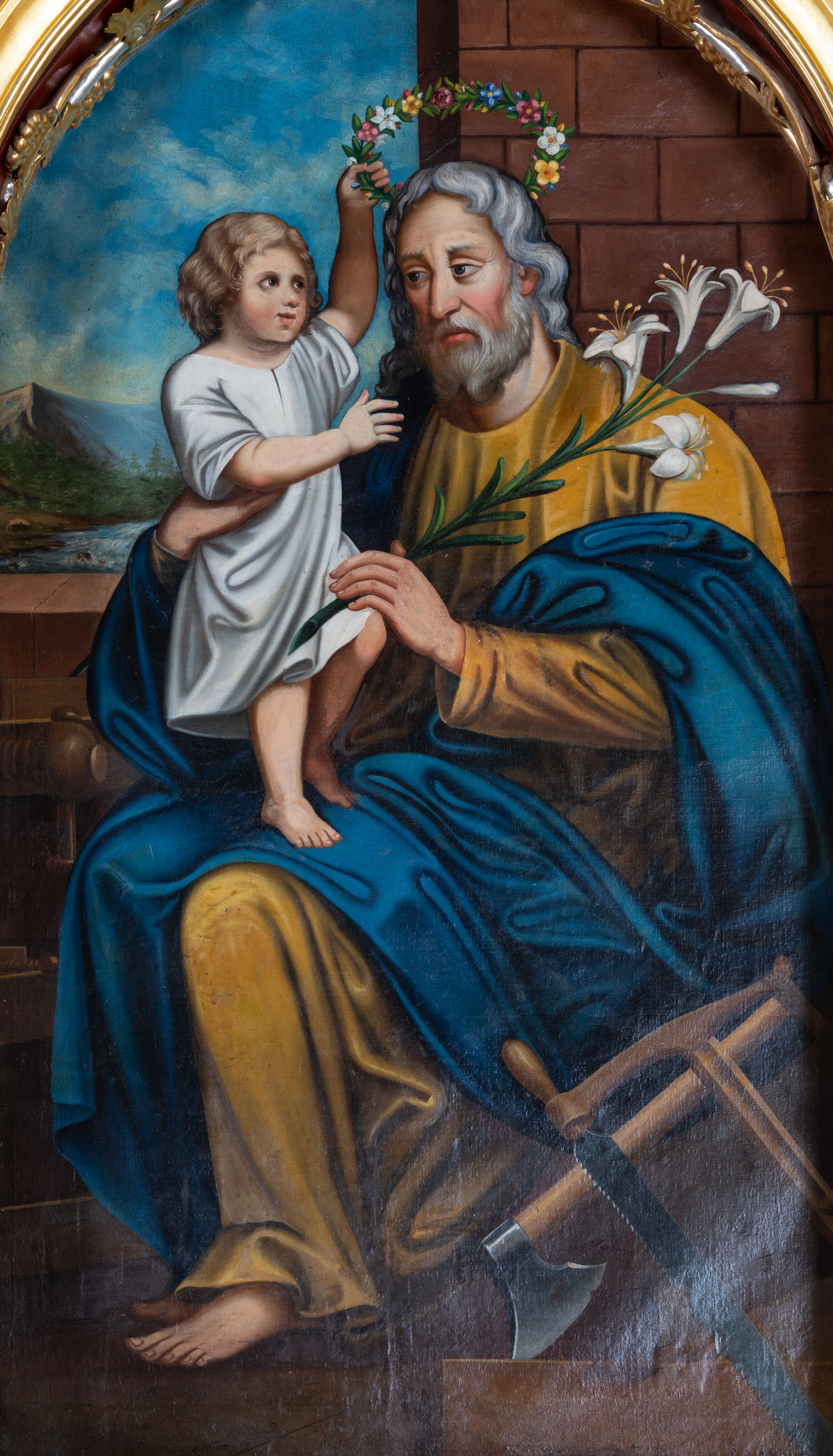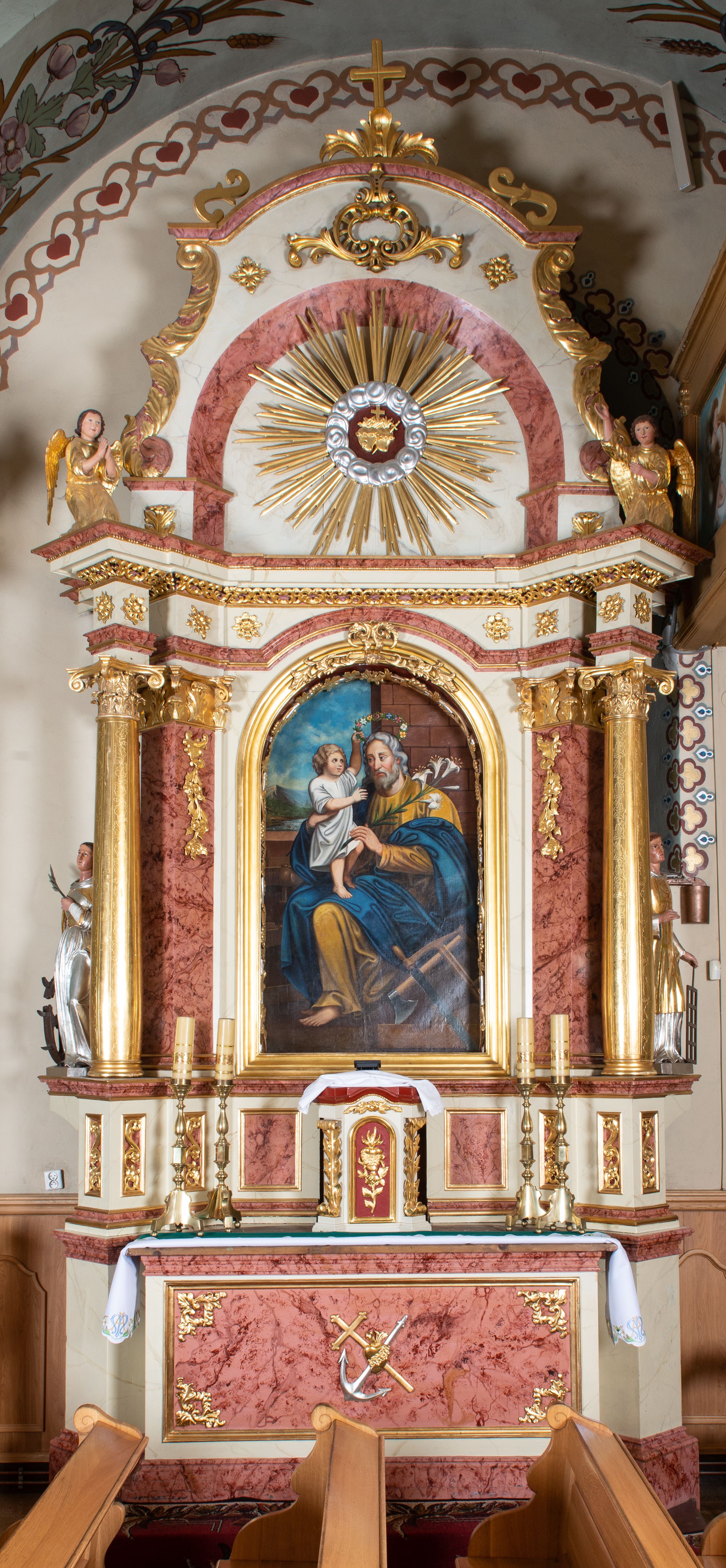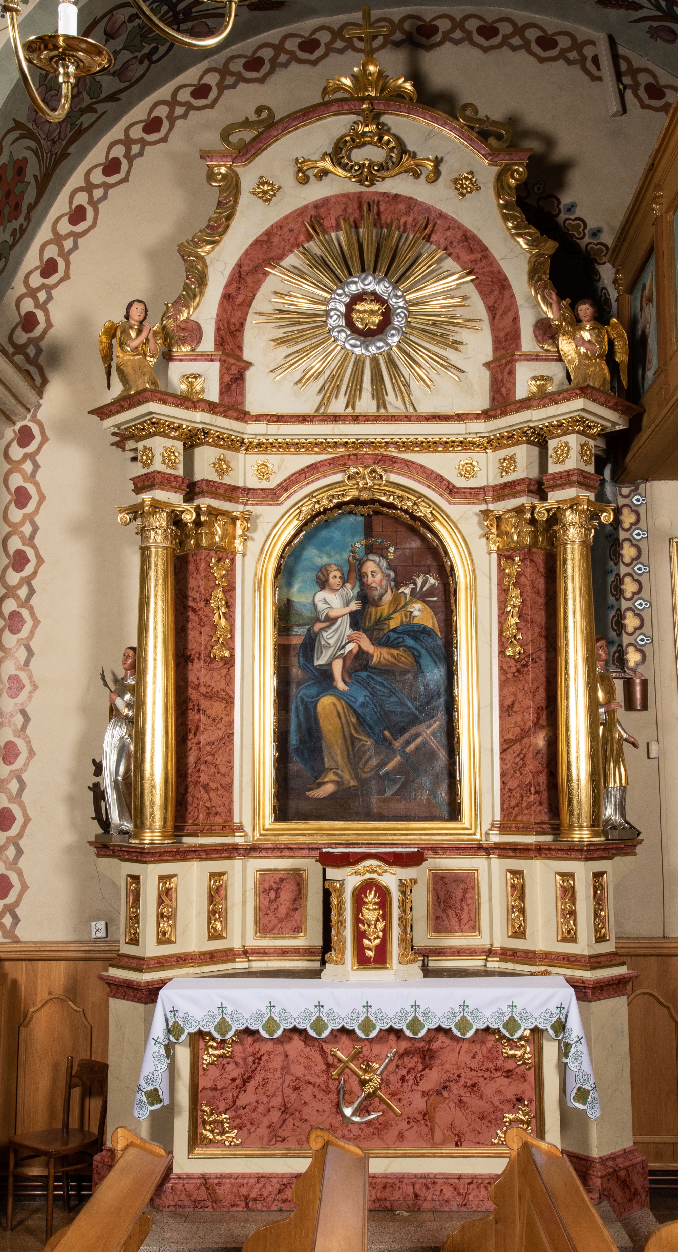 Retabulum na zdwojonym cokole, flankowane ustawionymi pod kątem w jednej linii parami pilastrów, filarów oraz kolumn na przodzie. Podpory dźwigają wyłamane na osi belkowanie z ustawionymi na bokach rzeźbami aniołków. Trzony filarów są marmoryzowane; trzony kolumn delikatnie zwężające się ku górze, złocone, zdobione pionowymi pasami, co drugi wypełniony pnącą się ku górze rytą wicią z liści dębu lub z liści klonu; kapitele podpór kompozytowe. Po bokach ołtarza na niskich cokołach ustawione pod kątem rzeźby św. Katarzyny Aleksandryjskiej po lewej i św. Wawrzyńca po prawej stronie. W polu, w głębokiej wnęce ujętej szeroką, profilowaną ramą umieszczony jest obraz św. Józefa z Dzieciątkiem. Wnęka od wewnątrz zdobiona płaskorzeźbioną winną latoroślą. Cokół dekorowany jest prostokątnymi, marmoryzowanymi płycinami; fryz złoconymi rozetami.