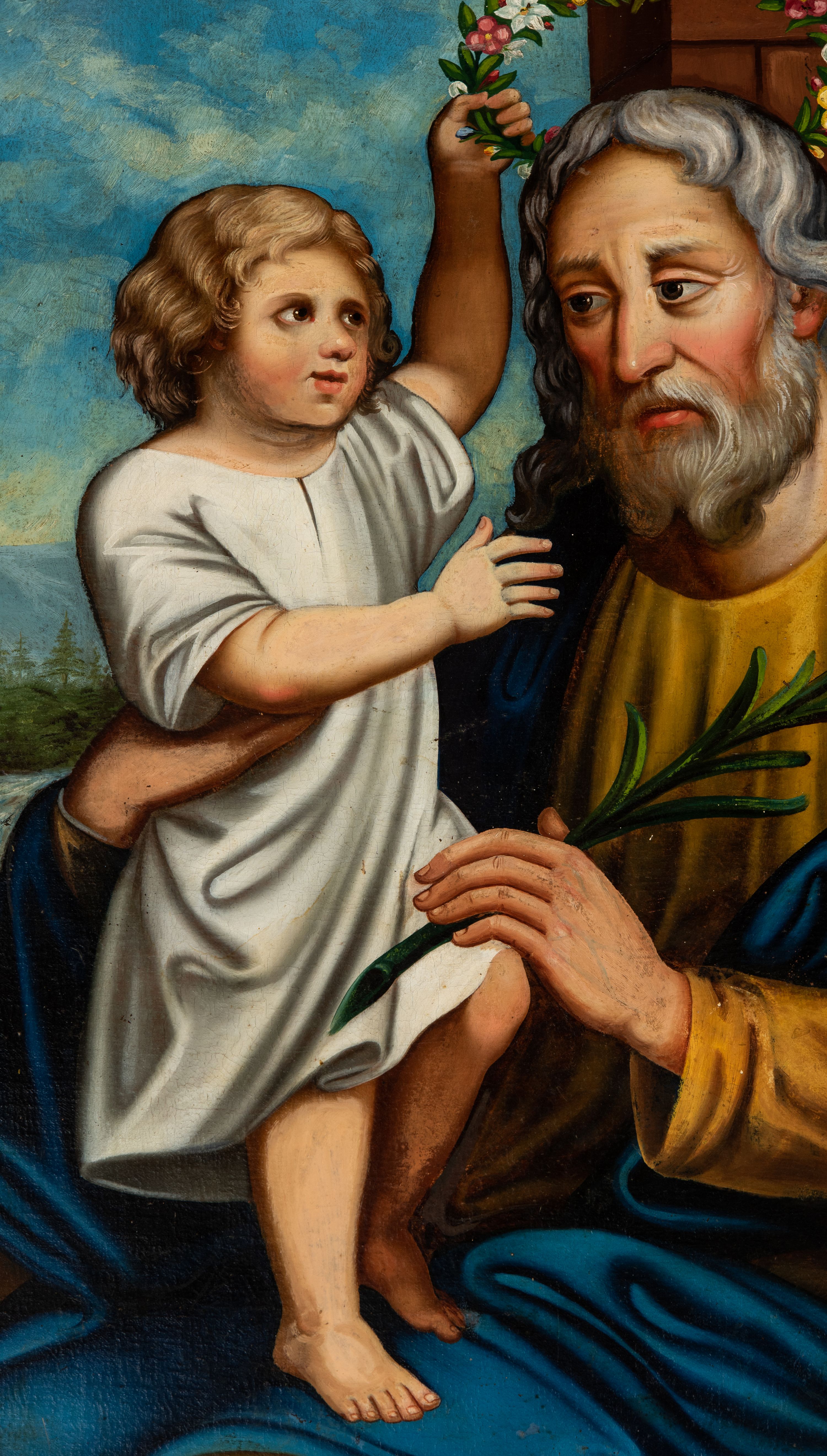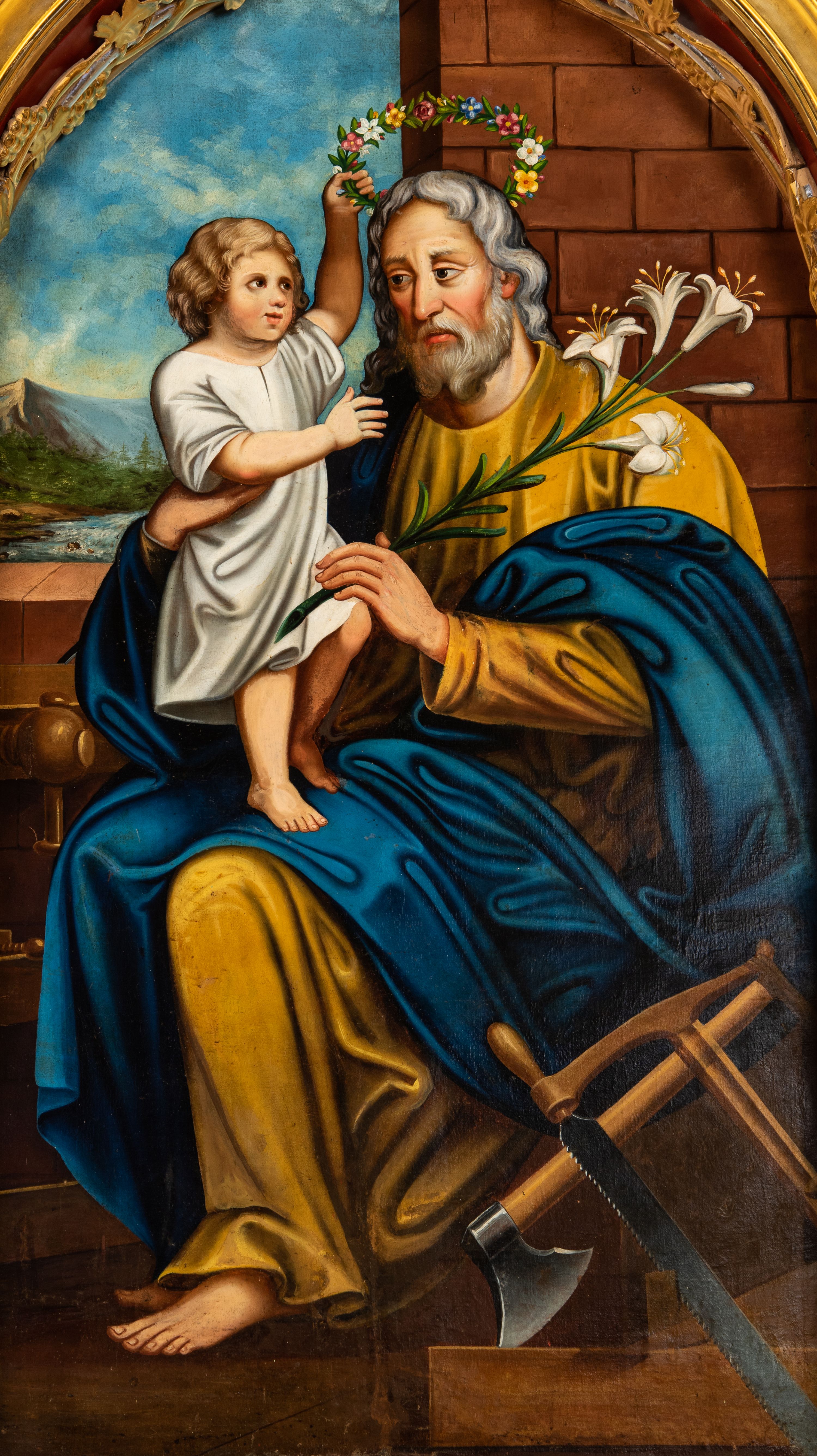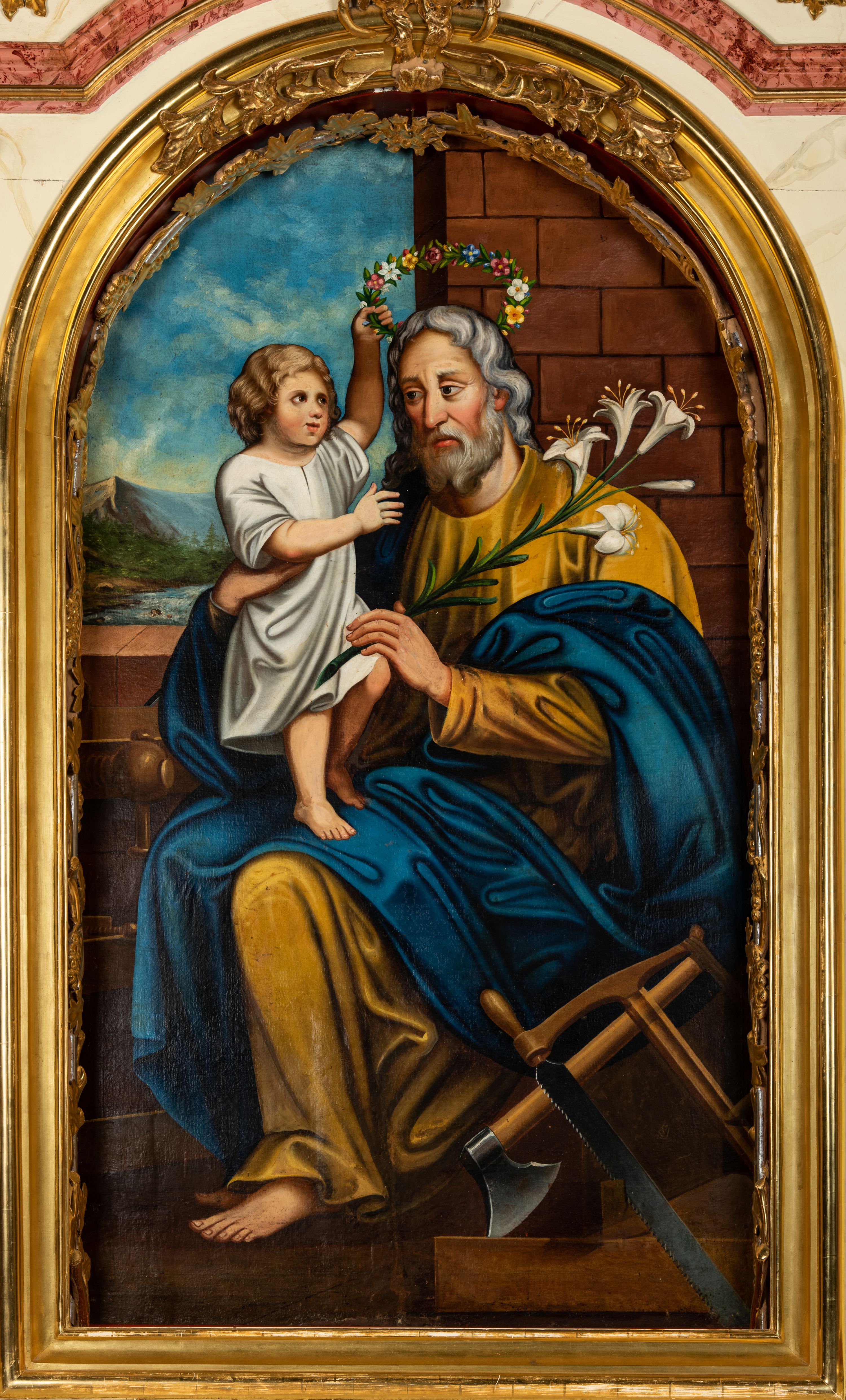 Retabulum na zdwojonym cokole, flankowane ustawionymi pod kątem w jednej linii parami pilastrów, filarów oraz kolumn na przodzie. Podpory dźwigają wyłamane na osi belkowanie z ustawionymi na bokach rzeźbami aniołków. Trzony filarów są marmoryzowane; trzony kolumn delikatnie zwężające się ku górze, złocone, zdobione pionowymi pasami, co drugi wypełniony pnącą się ku górze rytą wicią z liści dębu lub z liści klonu; kapitele podpór kompozytowe. Po bokach ołtarza na niskich cokołach ustawione pod kątem rzeźby św. Katarzyny Aleksandryjskiej po lewej i św. Wawrzyńca po prawej stronie. W polu, w głębokiej wnęce ujętej szeroką, profilowaną ramą umieszczony jest obraz św. Józefa z Dzieciątkiem. Wnęka od wewnątrz zdobiona płaskorzeźbioną winną latoroślą. Cokół dekorowany jest prostokątnymi, marmoryzowanymi płycinami; fryz złoconymi rozetami.