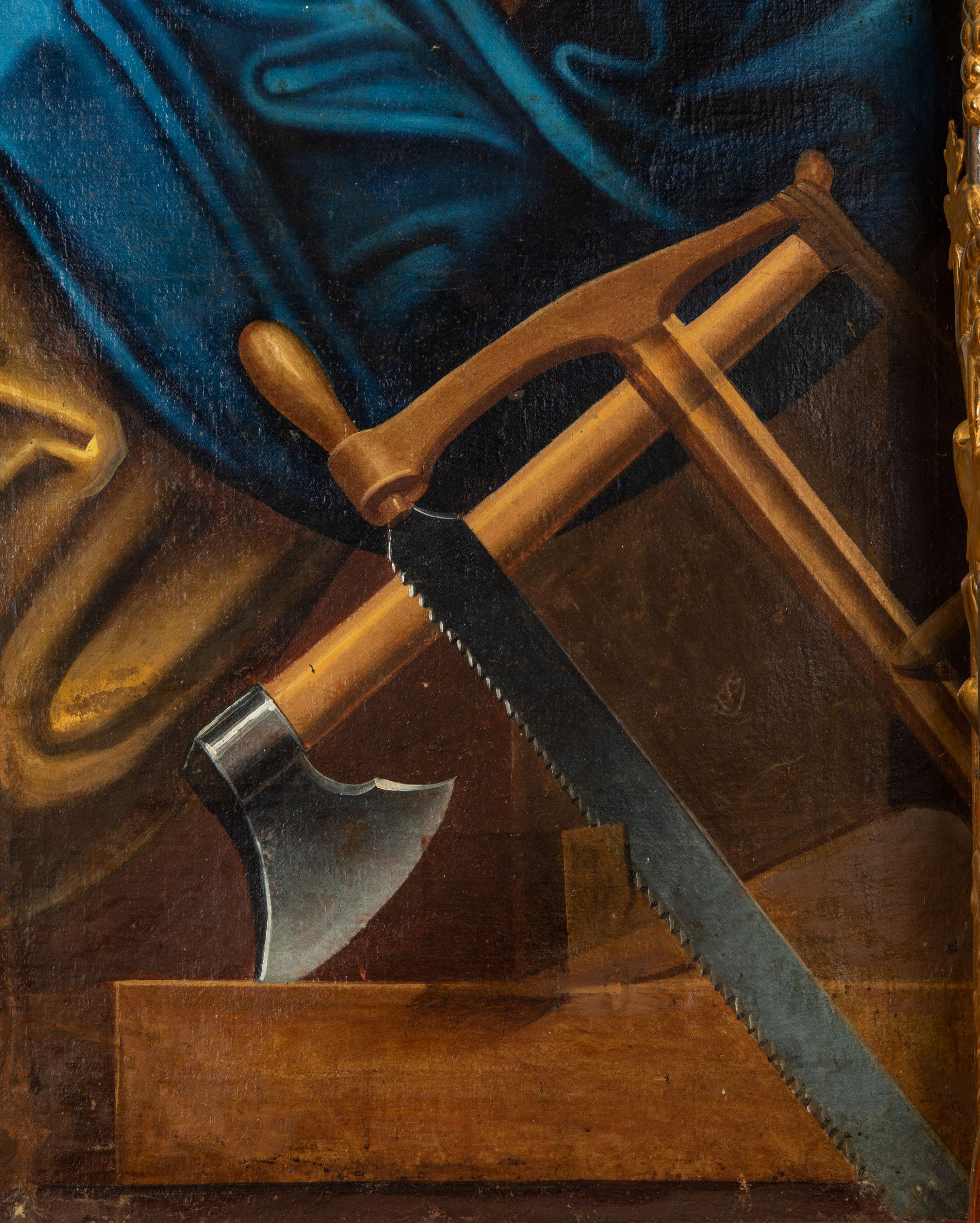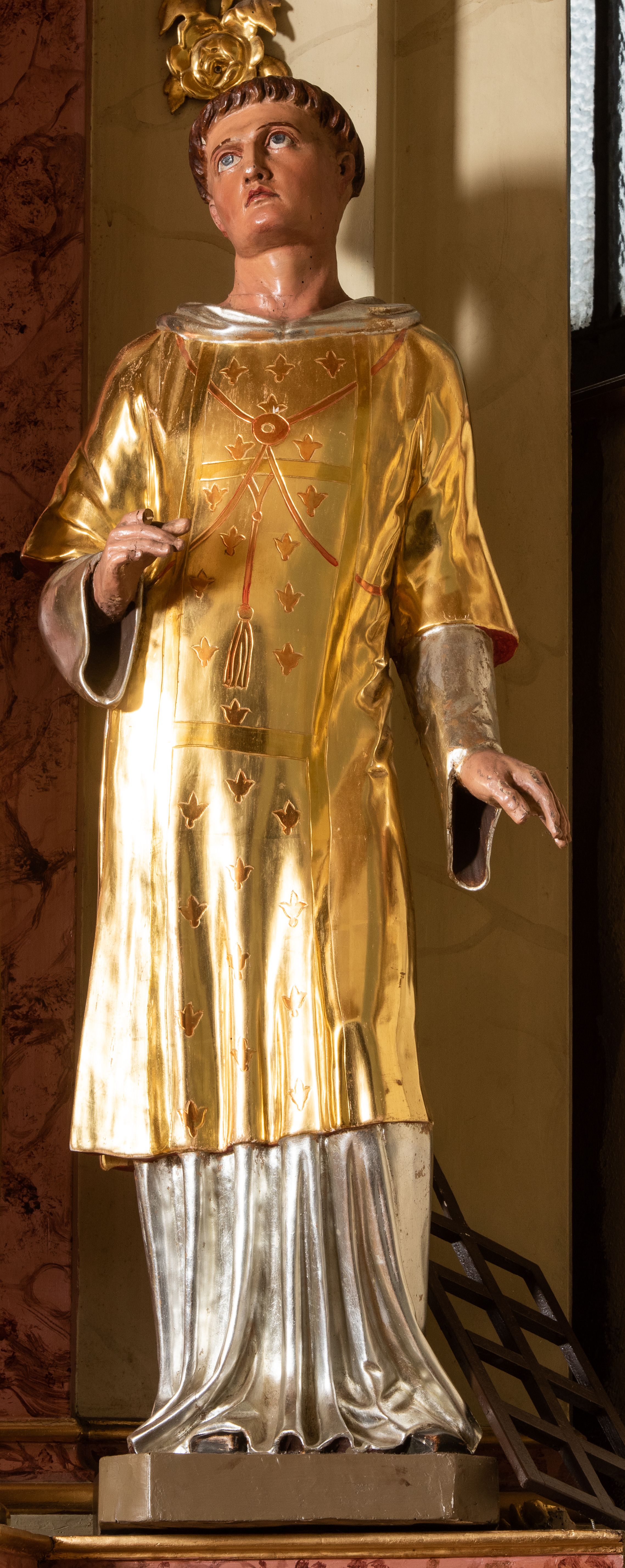 Ołtarz boczny reprezentuje typ aediculowy, czyli jednokondygnacyjnej, jednoosiowej struktury ujętej parą podpór dźwigających przerwane belkowanie ze zwieńczeniem. Struktura opiera się na wzorach wykształconych w sztuce nowożytnej. Nastawa jest posadowiona na wysokim cokole z polem głównym flankowanym podporami, z obrazem w pierwszej kondygnacji oraz glorią promienistą w zwieńczeniu. Rzeźby św. Katarzyny Aleksandryjskiej, św. Wawrzyńca oraz aniołków w zwieńczeniu zostały wykonane w czasie powstania całej nastawy ołtarzowej. Ołtarz zdobiony jest marmoryzacją, czyli techniką imitującą żyłkowania występujące w marmurze, popularną zwłaszcza w XVIII wieku. Niestety źródła archiwalne nie ujawniły twórcy tego retabulum. Dzieło obecnie poświęcone jest św. Józefowi. Jego wizerunek powstał w XIX wieku, zapewne razem z całą nastawą ołtarzową. Święty został przedstawiony w tradycyjnej konwencji ikonograficznej z Dzieciątkiem Jezus na ręku, mającym ukazać go jako opiekuna Syna Bożego oraz z białą lilią w dłoni, symbolem czystości. Interesujące płaskorzeźby zostałe umieszczone na antepedium ołtarza: krzyż, kotwica i gorejące serce. Przedstawienia te są symbolami trzech cnót boskich – Wiary, Nadziei i Miłości.