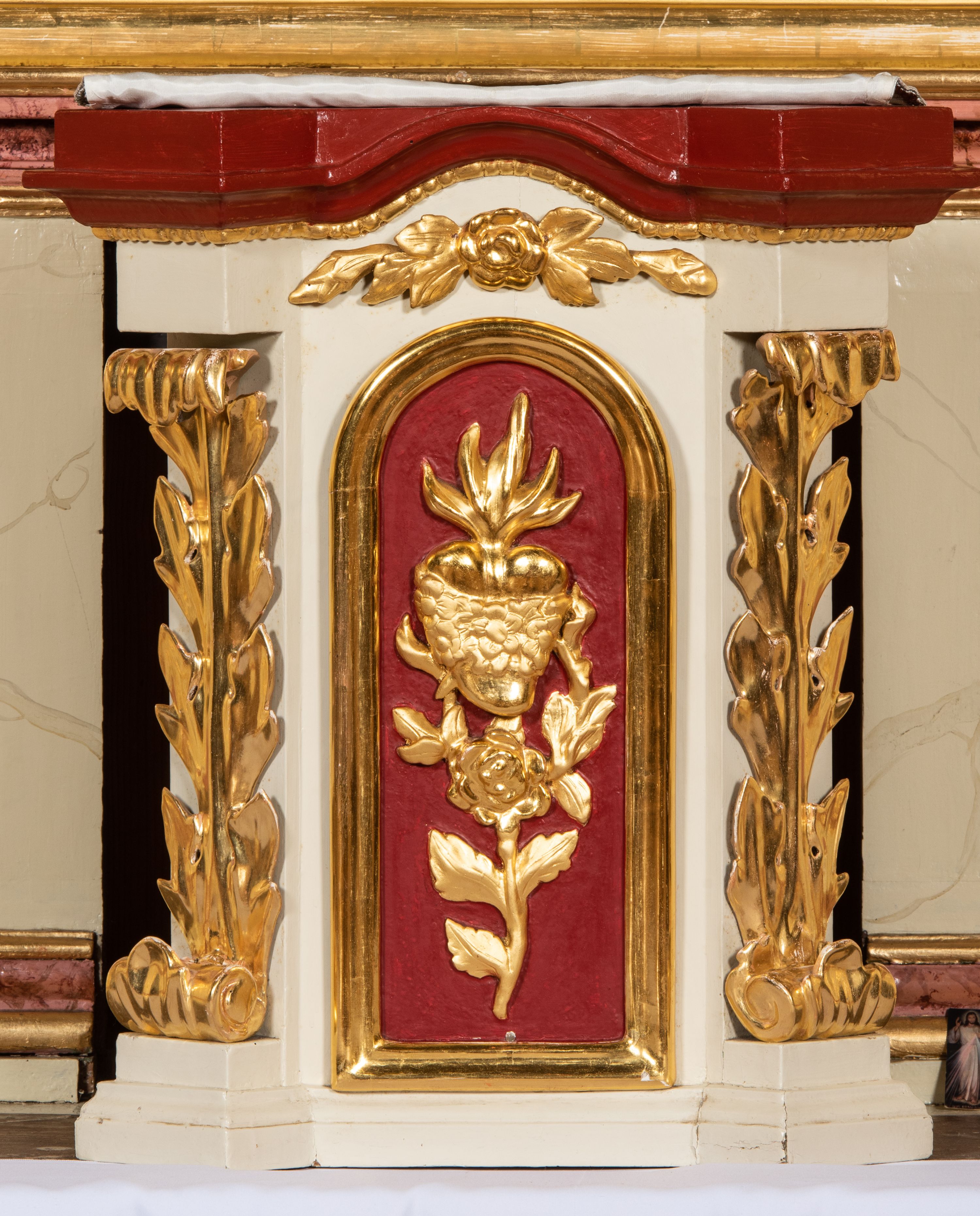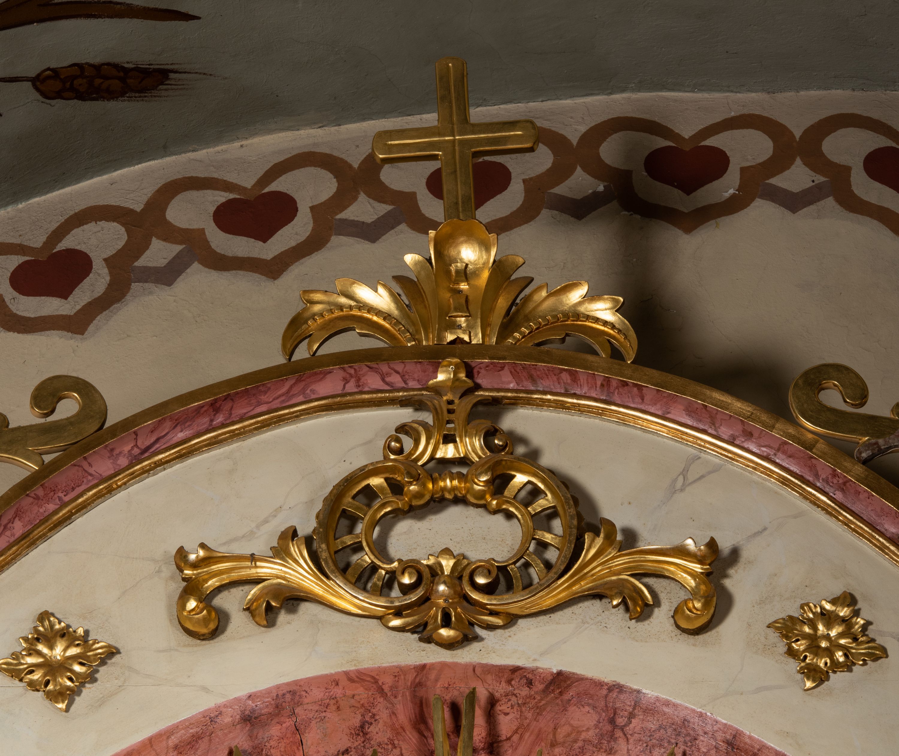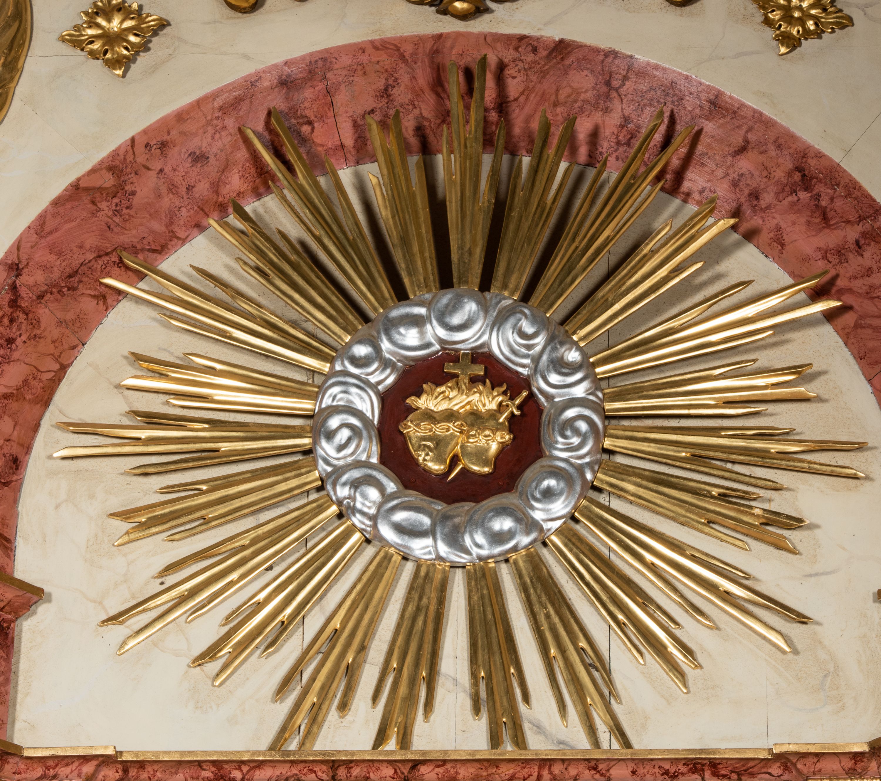 Zwieńczenie monumentalne, o fantazyjnym kształcie, po bokach ujęte wolutami zdobionymi liśćmi akantu, zamknięte od góry prostym gzymsem w formie nadwieszonego łuku z zatkniętym na szczycie łacińskim krzyżykiem. W polu, w półkolistej wnęce promienista gloria z dwoma gorejącymi sercami, z których jedno przebite jest mieczem, umieszczonym w otoku z obłoków.