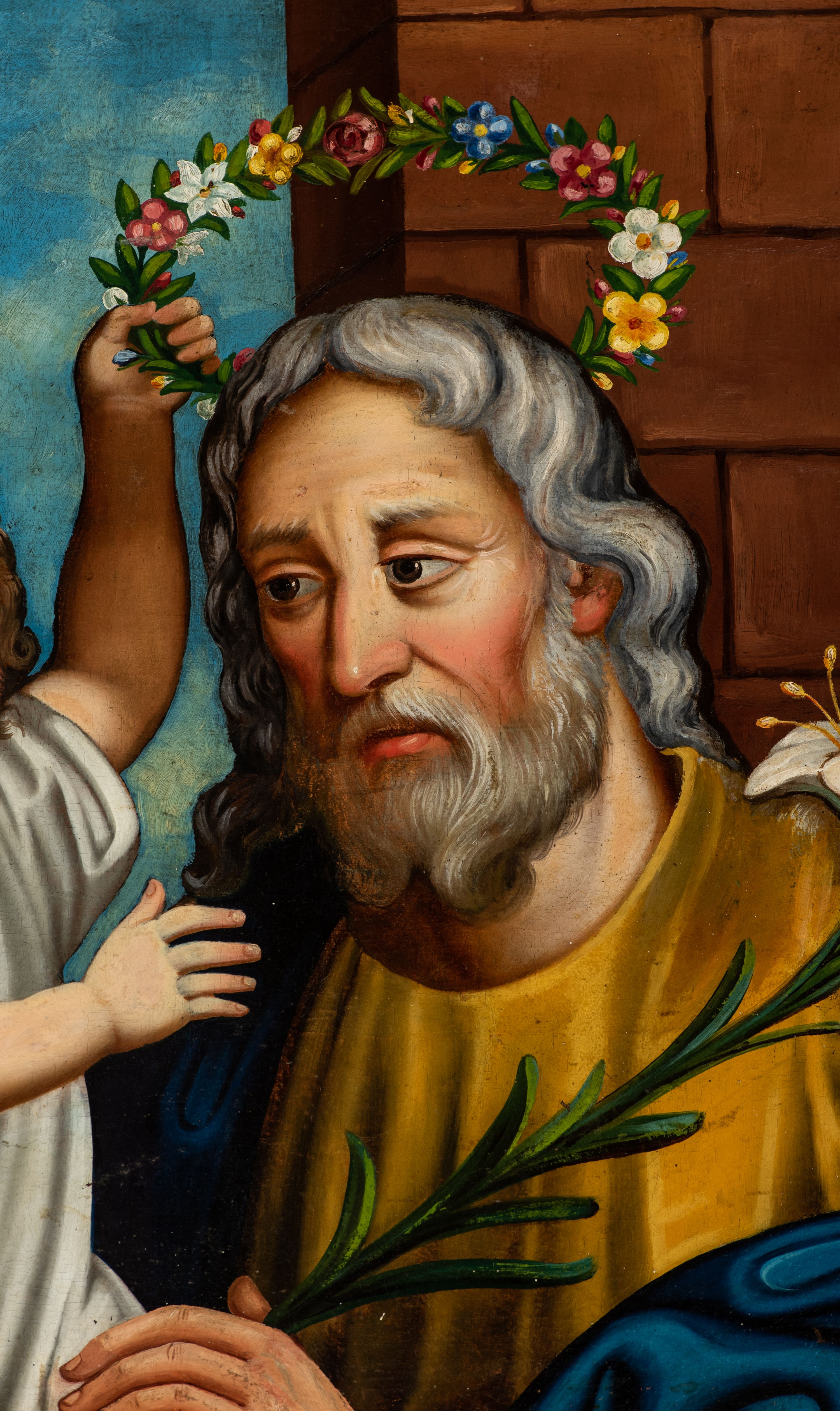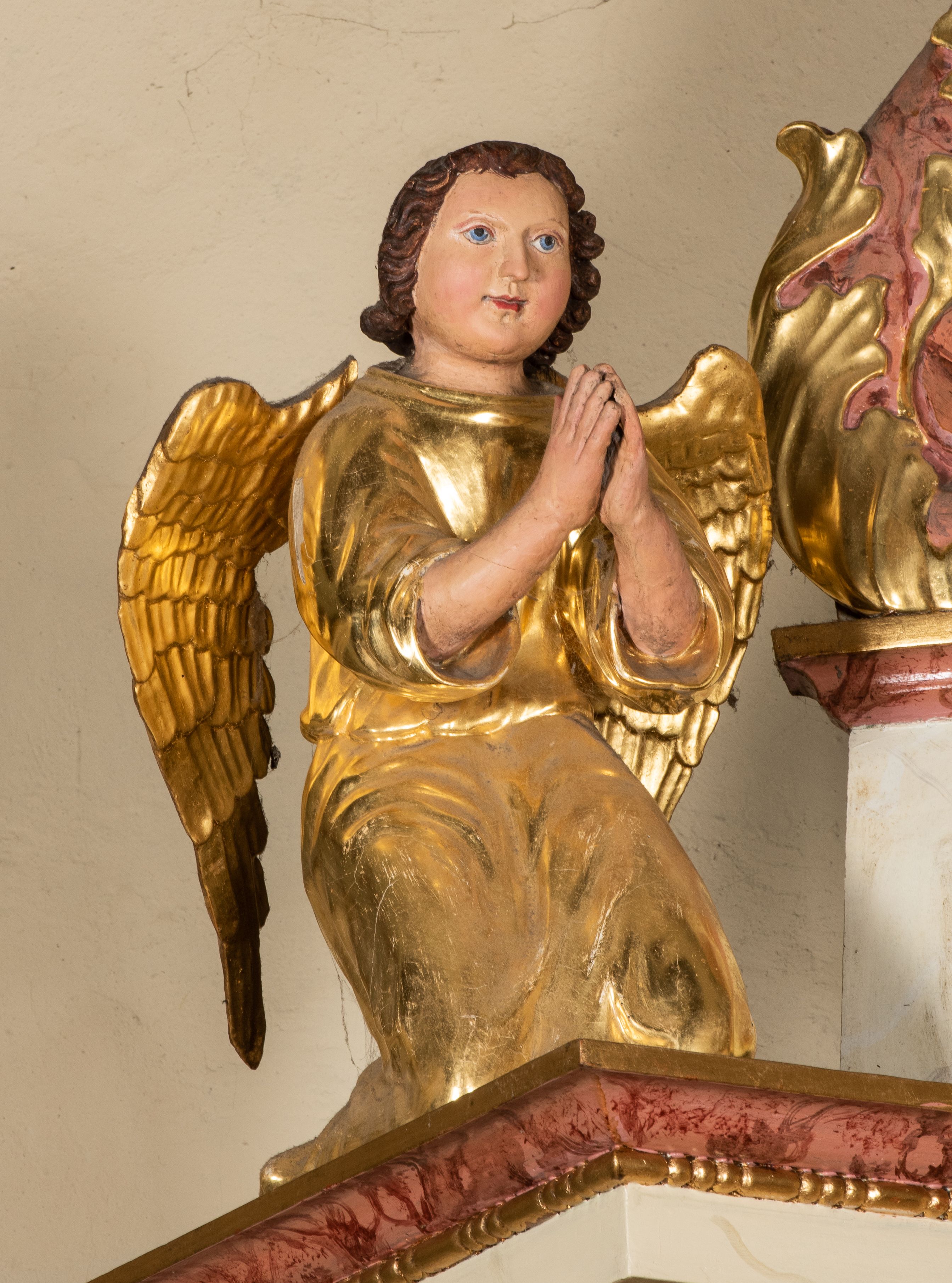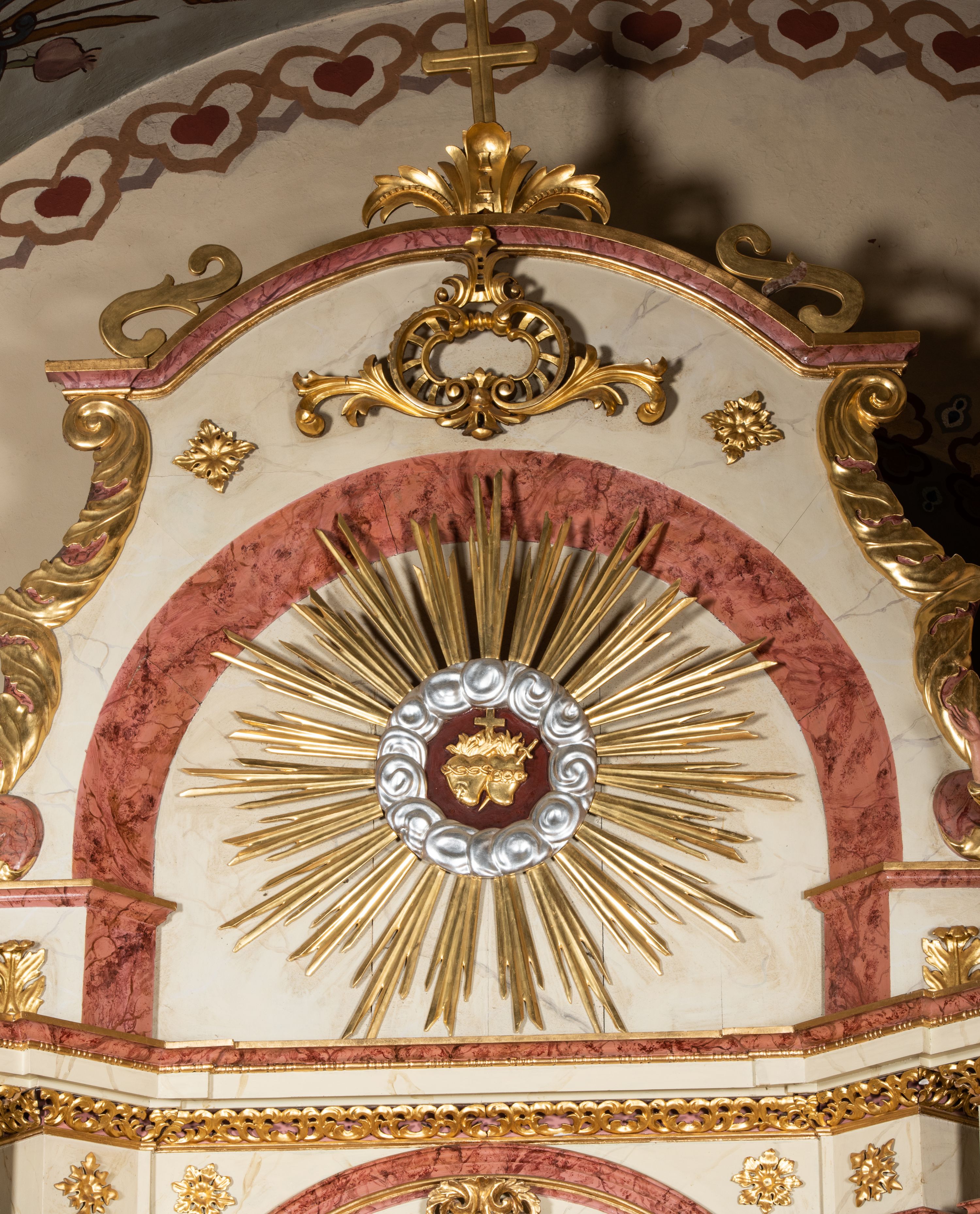 Zwieńczenie monumentalne, o fantazyjnym kształcie, po bokach ujęte wolutami zdobionymi liśćmi akantu, zamknięte od góry prostym gzymsem w formie nadwieszonego łuku z zatkniętym na szczycie łacińskim krzyżykiem. W polu, w półkolistej wnęce promienista gloria z dwoma gorejącymi sercami, z których jedno przebite jest mieczem, umieszczonym w otoku z obłoków.