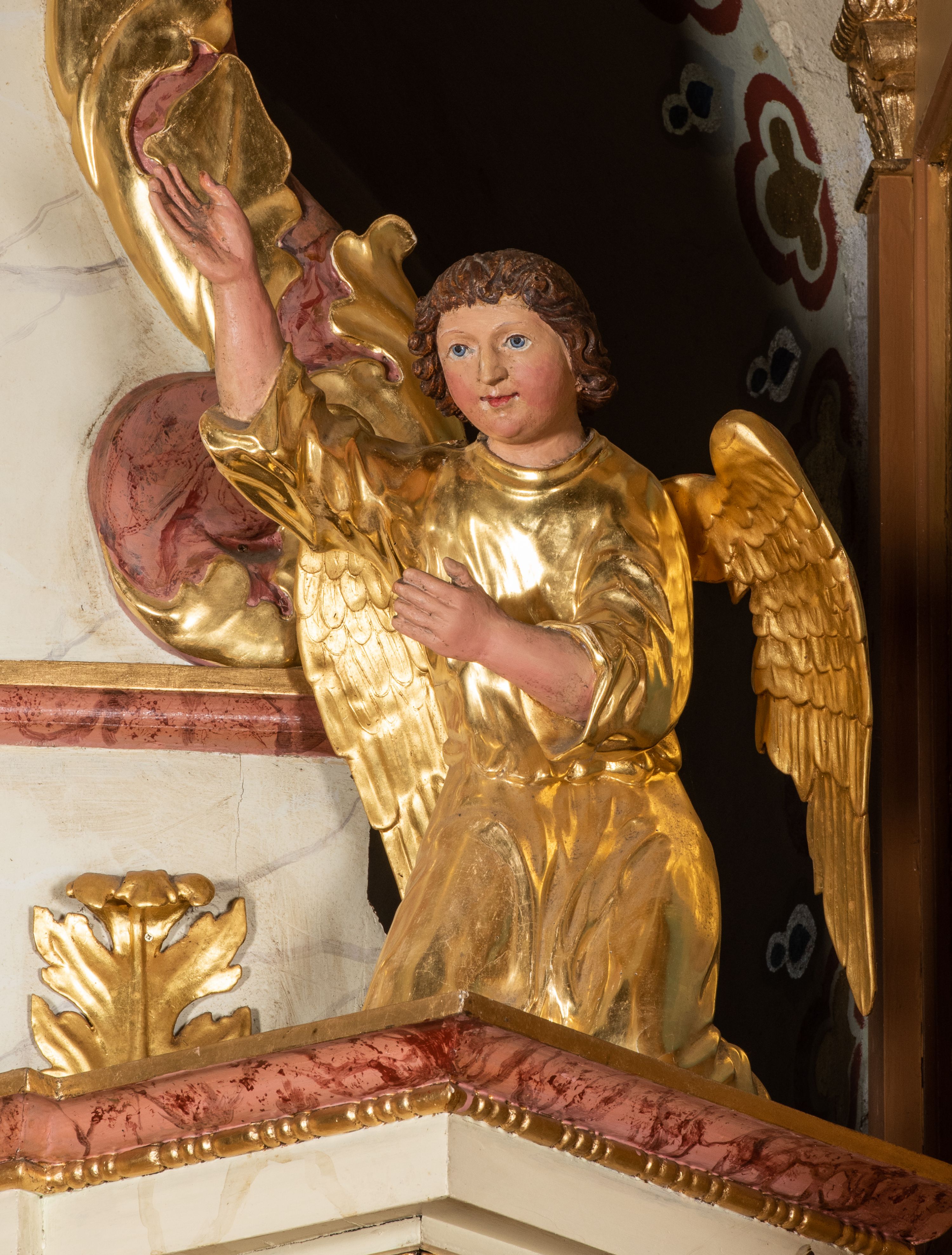 Struktura w kolorze jasnobeżowym, płyciny, filary i detale marmoryzowana w kolorze różowym; ornamentyka i profilowania złocone i srebrzone.
