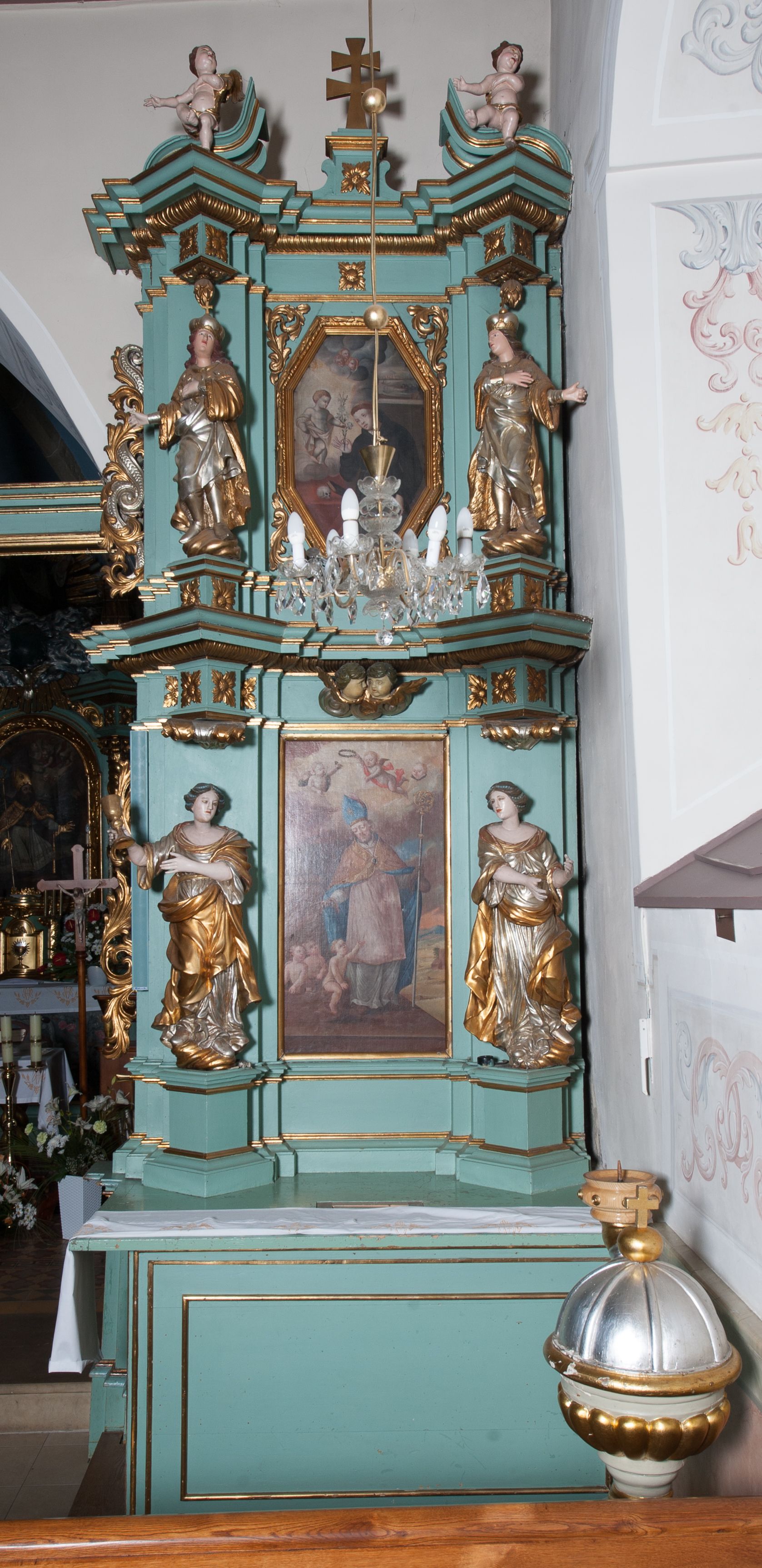 Ołtarz architektoniczny, dwukondygnacyjny, jednoosiowy. Ołtarz drewniany prostopadłościenny z drewnianą mensą i kamiennym portatylem. Dwukondygnacyjne retabulum ustawione na podwójnym i zdwojonym cokole, ujęte parą zdwojonych pilastrów wspierających wyłamujące się belkowanie. W polu głównym umieszczony jest obraz św. Mikołaja w płytkiej wnęce w kształcie stojącego prostokąta. Nad obrazem, w partii fryzu dwie uskrzydlone główki anielskie. Po bokach, na osi podpór, na wysokich cokołach ustawione są rzeźby: po lewej stronie św. Barbary, a po prawej według przekazów w literaturze św. Apolonii. Ponad nimi podwieszone ukośnie fragmenty fryzu ozdobione rozetami na ściankach bocznych, a od spodu szerokimi, zawiniętymi liśćmi akantu. Druga kondygnacja ustawiona na niskim cokole, ujęta parą zdwojonych pilastrów podtrzymujących przerwane belkowanie oraz wolutowy, odwrócony przyczółek, na którego szczycie usadzona jest para aniołków. W polu środkowym w ramie o kształcie stojącego prostokąta i ściętych narożach obraz św. Antoniego Padewskiego. Na osi podpór, na niskich cokołach ozdobionych rozetami ustawione są figury świętych królewiczów, zapewne. Ponad nimi podwieszone fragmenty fryzu, zdobione rozetami oraz z podwieszonymi szyszkami. Na szczycie retabulum niski cokolik, flankowany wolutami, zdobiony na przodzie rozetą z zatkniętym u góry krzyżem zakonu Bożogrobowców. Kondygnacje ujęte z lewej strony uszami: w dolnej suchym akantem, a w górnej akantem przeplecionym wstęgą, zdobioną cekinami. Kolorystyka struktury w kolorze jasnej zieleni, ornamentyka i detal architektoniczny złocone oraz srebrzone.