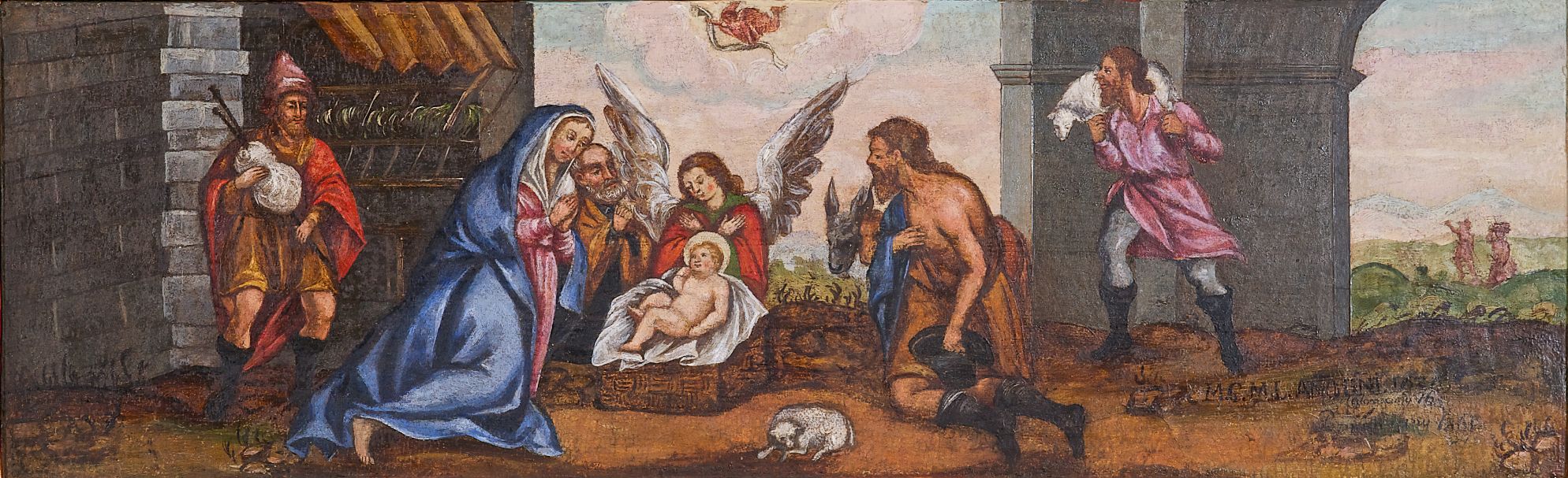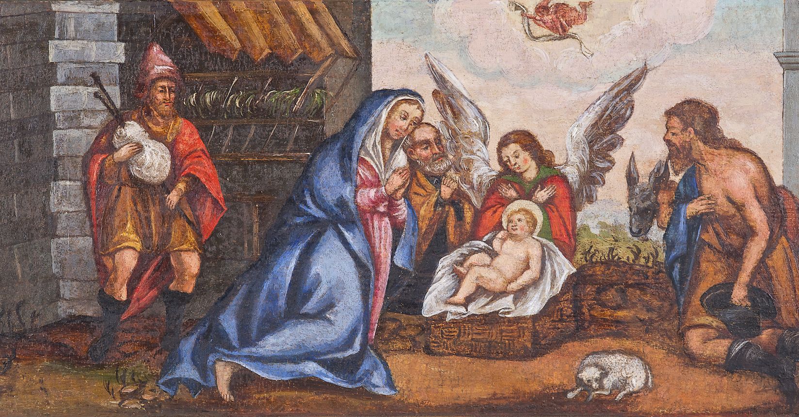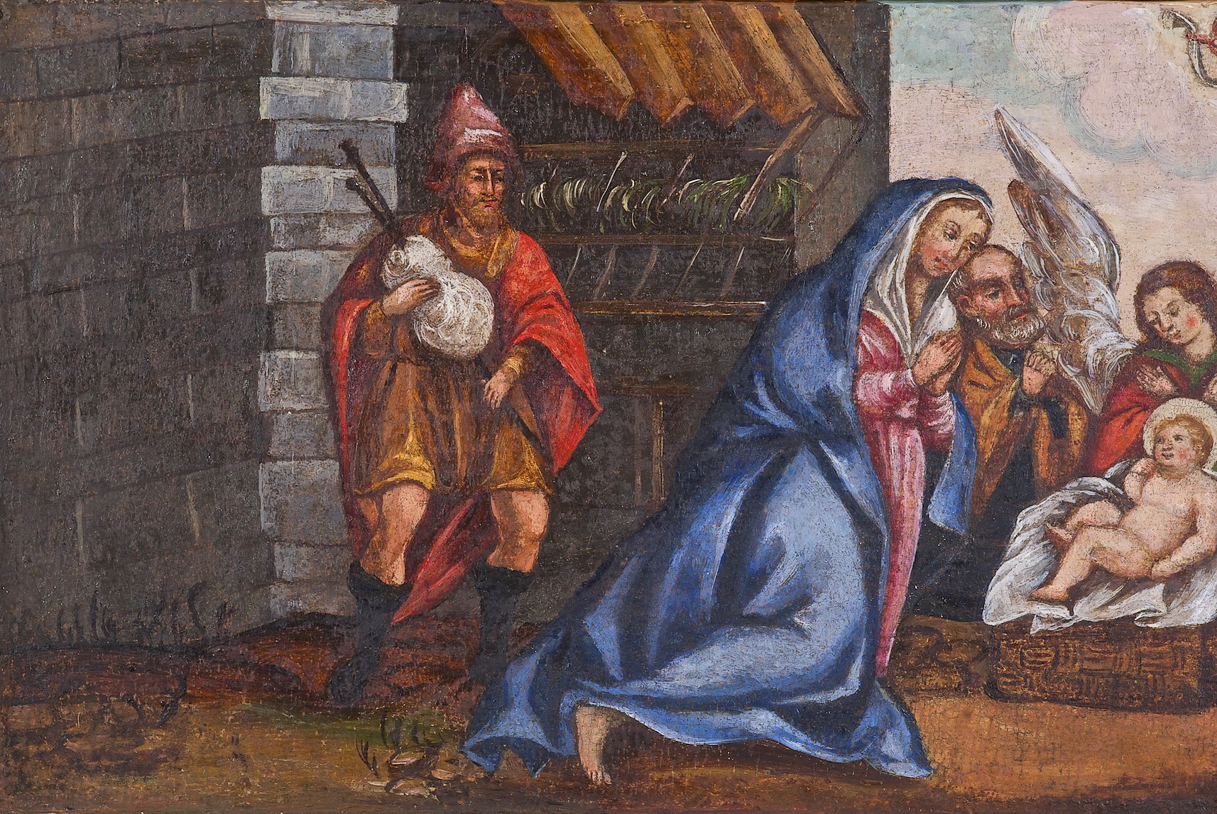 Omawiany ołtarz wraz z bliźniaczym retabulum mieszczącym obraz Ukrzyżowania powstał najpewniej w 1636 roku, o czym informuje inskrypcja na obrazie ukazującym Pokłon pasterzy w predelli omawianej nastawy. Oba ołtarze powstały w tym samym czasie i zostały wykonane przez ten sam, zapewne małopolski, warsztat snycerski. Dzieła reprezentują typ manierystycznego ołtarza, który prócz zastosowania ornamentyki północnej (ornamenty: małżowinowo-chrząstkowy i okuciowy) charakteryzował się formą przybierającą kształt aediculi, tj. kapliczki lub niszy ujętej parą kolumn flankujących przedstawienie tytułowe oraz podtrzymujących rozbudowane zwieńczenie mieszczące obraz ujęty figurami świętych. Całość struktury bywała niekiedy zwieńczona rzeźbioną figurą ustawioną na szczycie ołtarza.