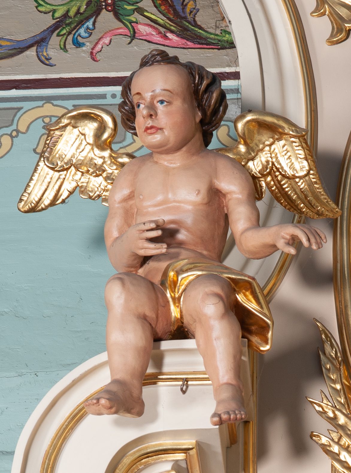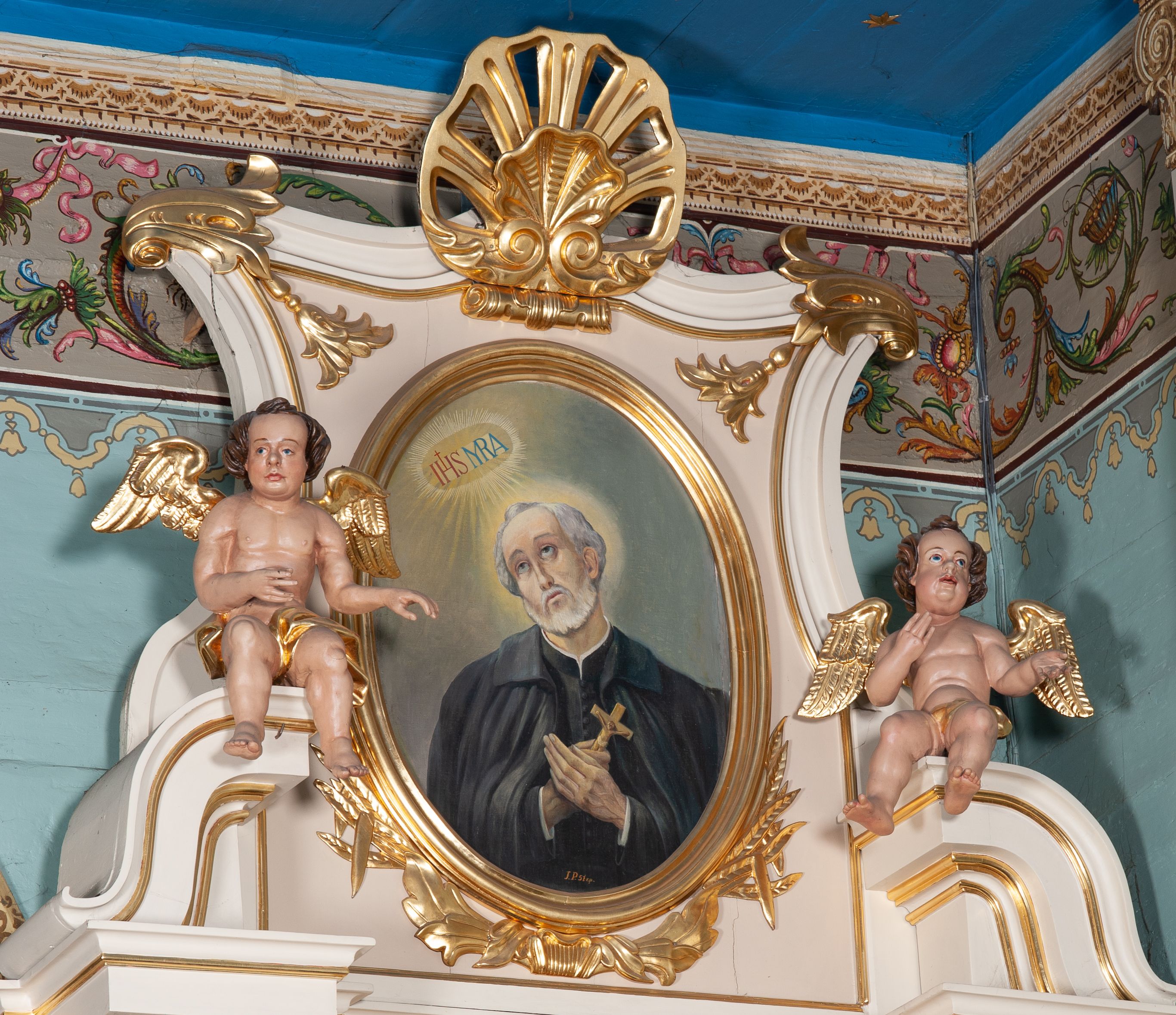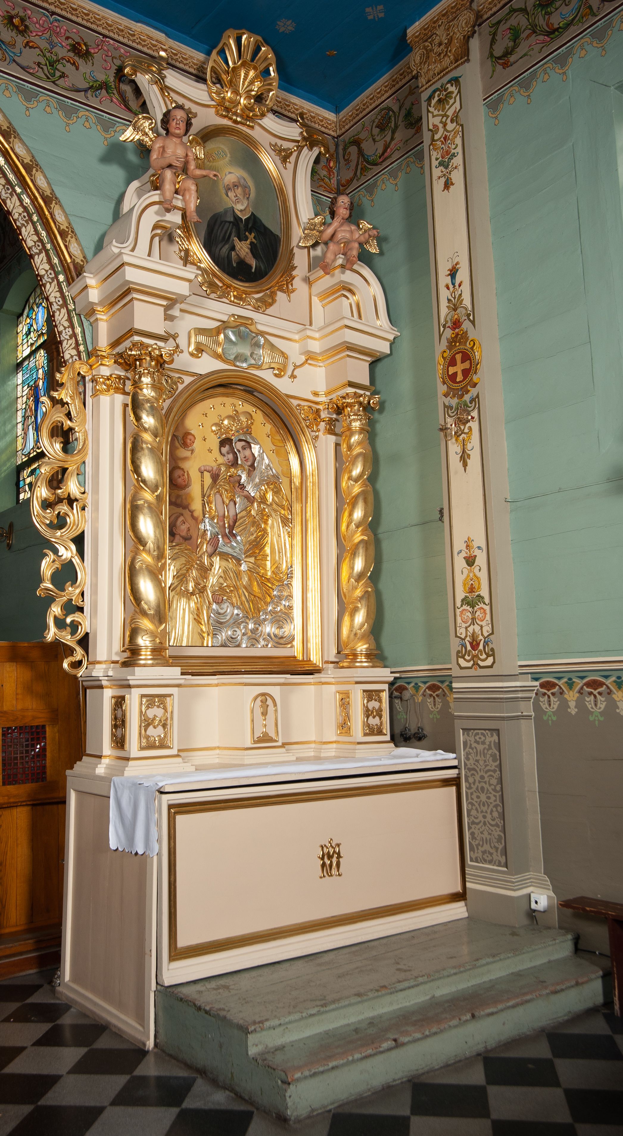 Struktura polichromowana na kremowo ze złoconą i srebrzoną ornamentyką oraz detalami architektonicznymi.
