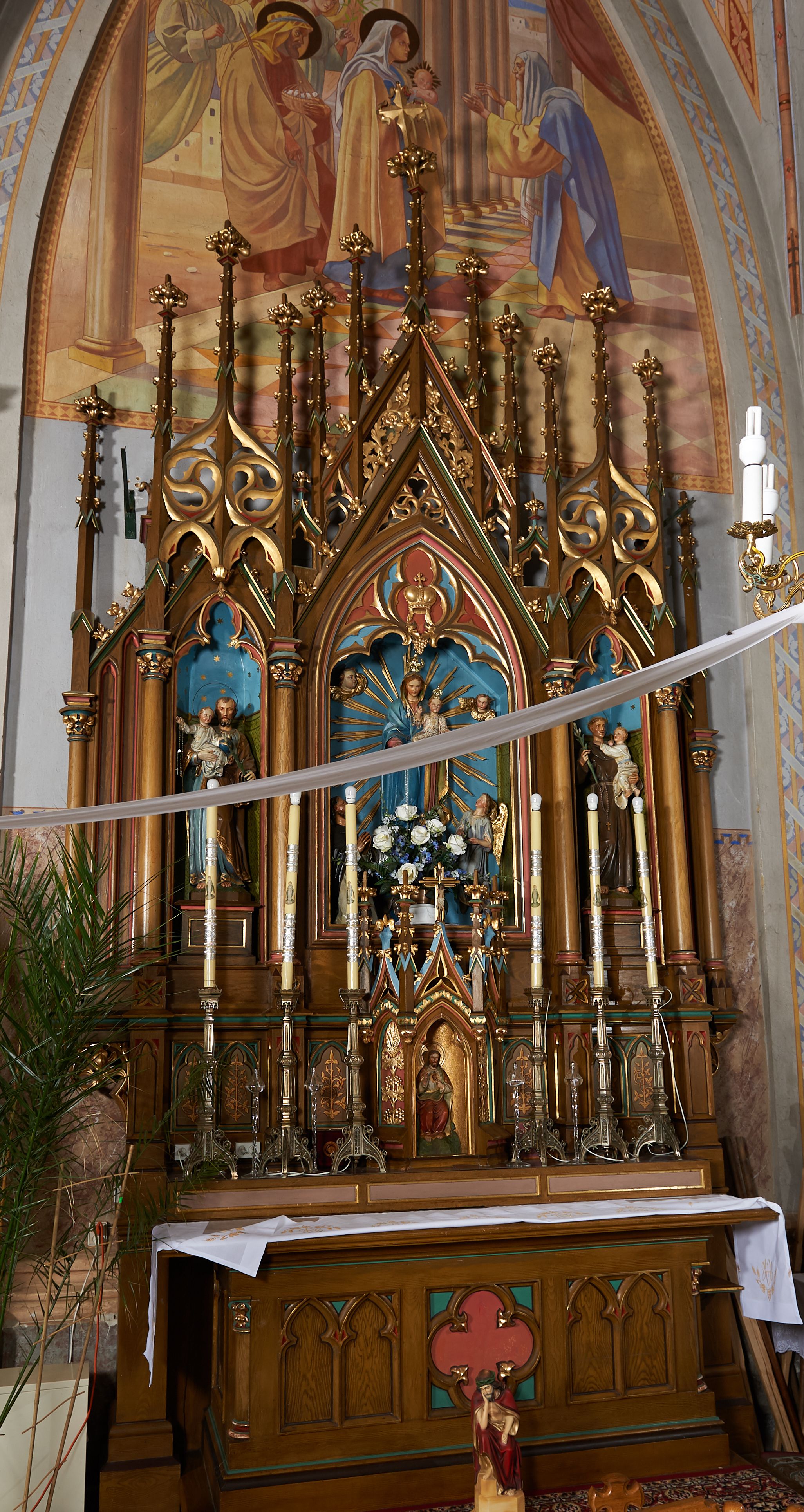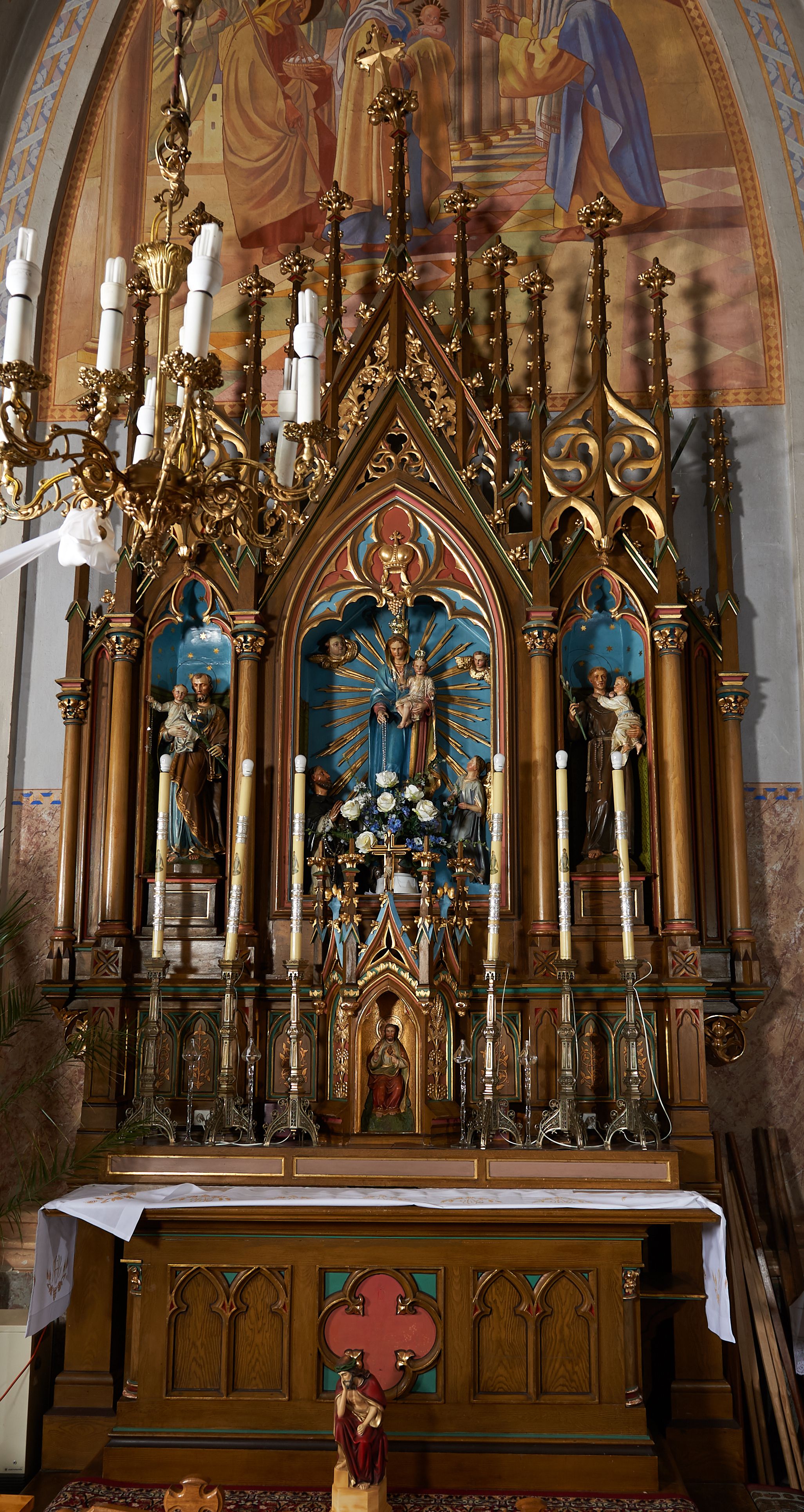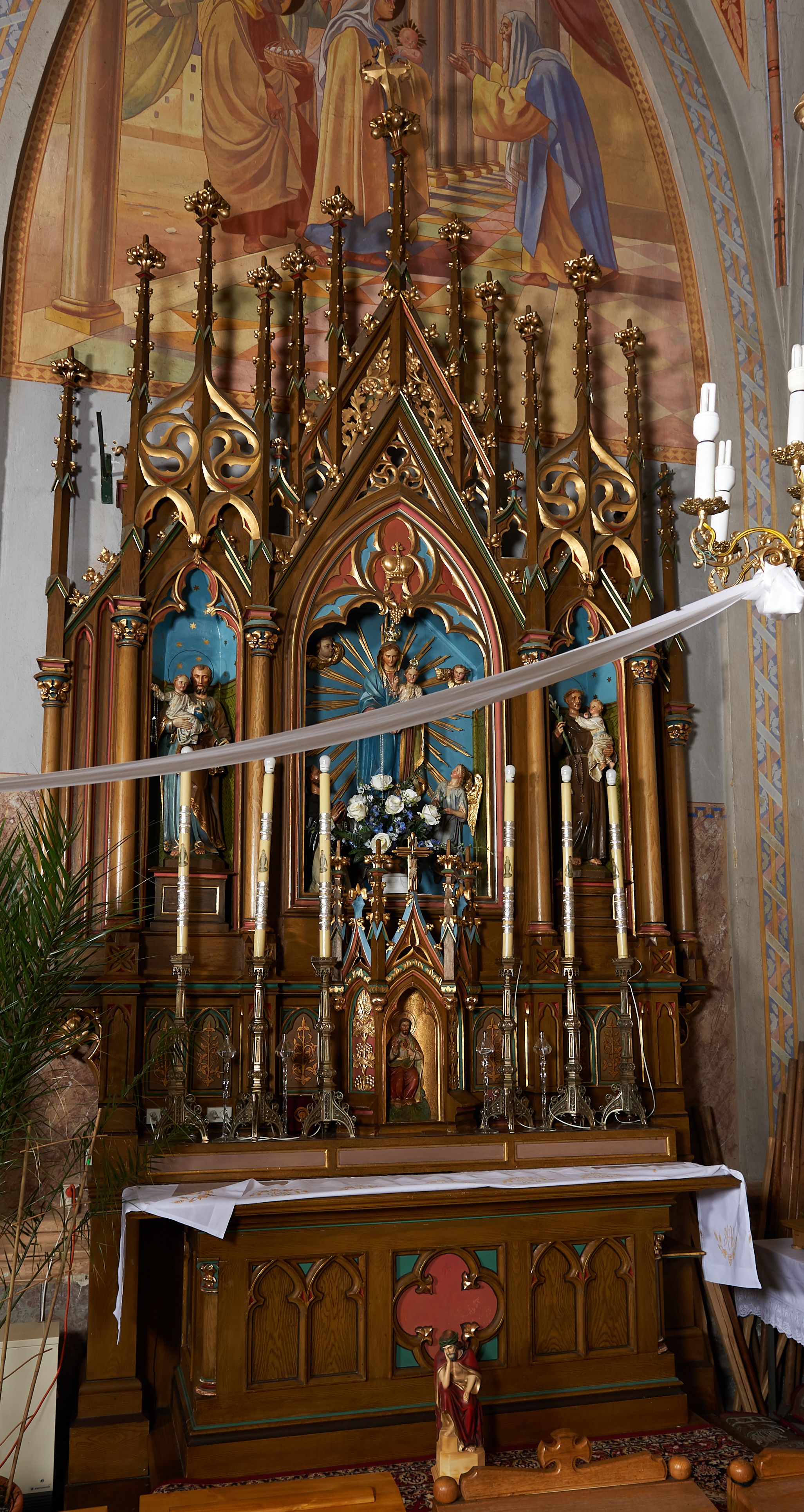 Nastawa przyścienna, architektoniczna, trójosiowa, z architektonicznymi uszakami zakończonymi pinaklem, ustawiona na dwustopniowej podstawie. Mensa prostopadłościenna, skrzyniowa, drewniana z kamiennym portatylem. Antepedium ujęte w narożach ćwierćkolumienkami; pole dekorowane trzema płycinami, z których środkowa z motywem czworoliścia, boczne z parami blend. Retabulum ustawione na wysokim cokole, z predellą ozdobioną blendami. W partii środkowej predelli quasi tabernakulum na planie trzech boków sześcioboku. Pośrodku nisza z figurą Najświętszego Serca Jezusa, ściany boczne w formie ostrołukowych płycin z płaskorzeźbioną dekoracją o motywie winnego grona i kłosów, wszystkie zwieńczone wimpergami flankowanymi pinaklami z kwiatonami. Nastawa w formie trzech ostrołukowych nisz dekorowanych maswerkiem, ujętych kolumienkami zakończonymi kapitelami utworzonymi ze stylizowanych rozet. Nisza środkowa szersza i wyższa, zakończona wimpergą wypełnioną koronę. Całość nastawy wieńczą strzeliste pinakle, połączone ze sobą motywem ażurowego maswerku, zwieńczone kwiatonami, dekorowane żabkami. W środkowej niszy figura Matki Boskiej z Dzieciątkiem. W kwaterach bocznych ustawione na cokołach figury św. Józefa po lewej i św. Antoniego Padewskiego po prawej stronie. Ołtarz utrzymany w kolorystyce ciemnego drewna z malowanymi niszami w kolorach niebieskim i czerwonym. Profile, detale i ornamenty zielone, czerwone lub złocone.