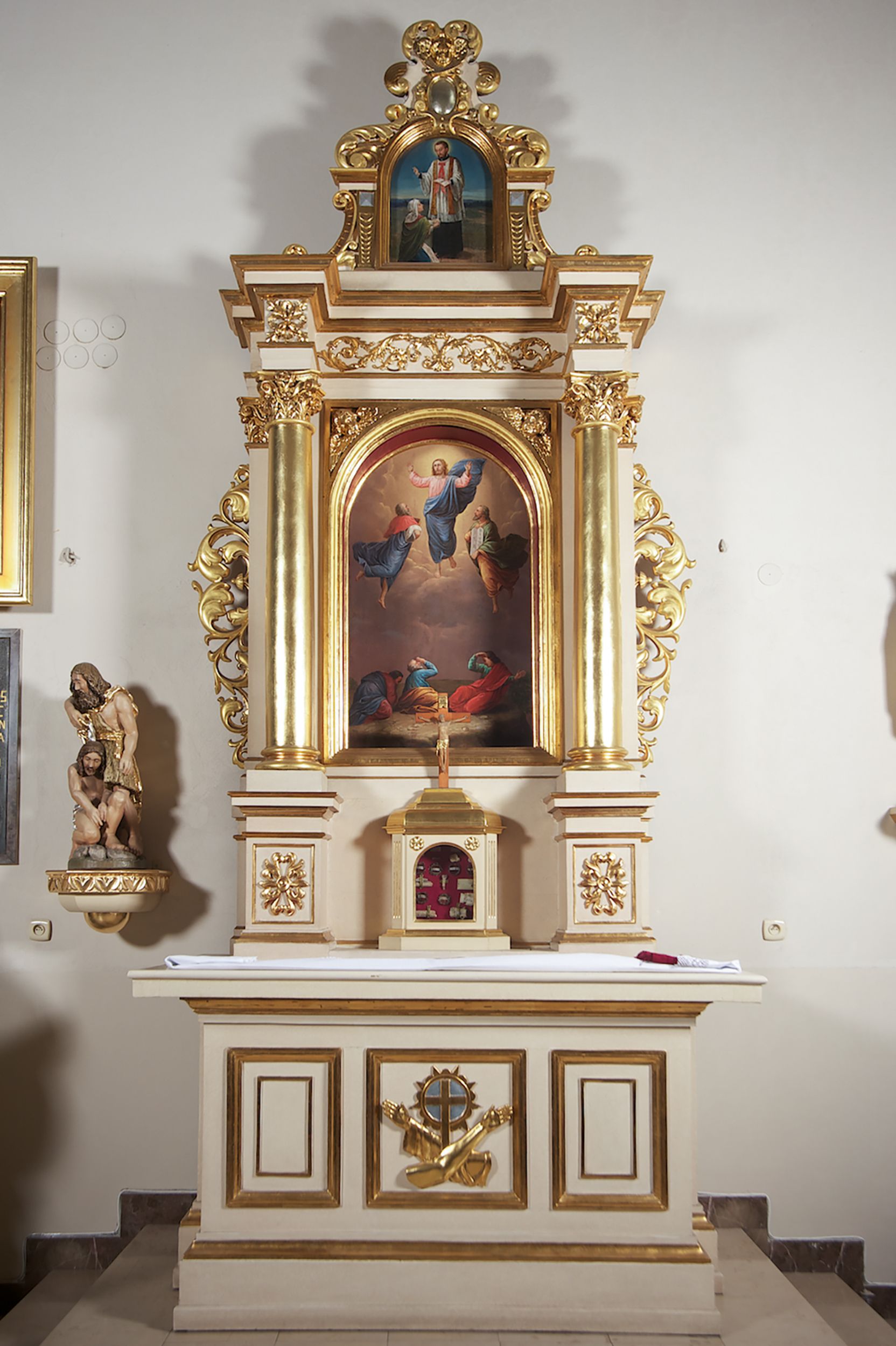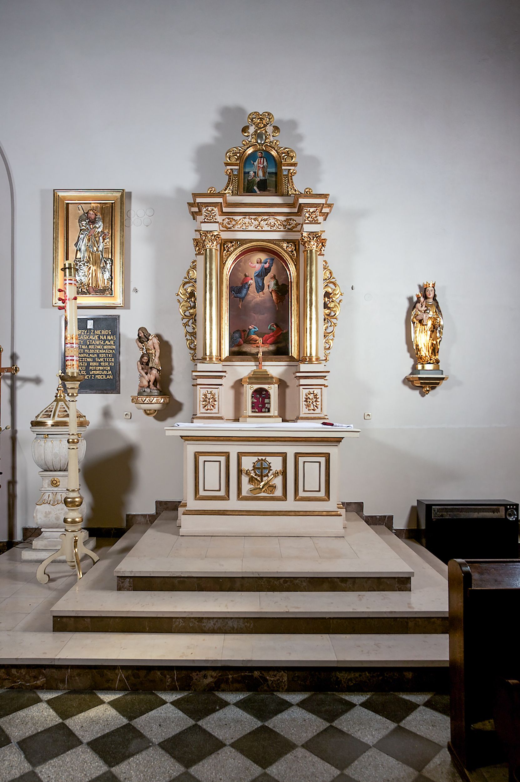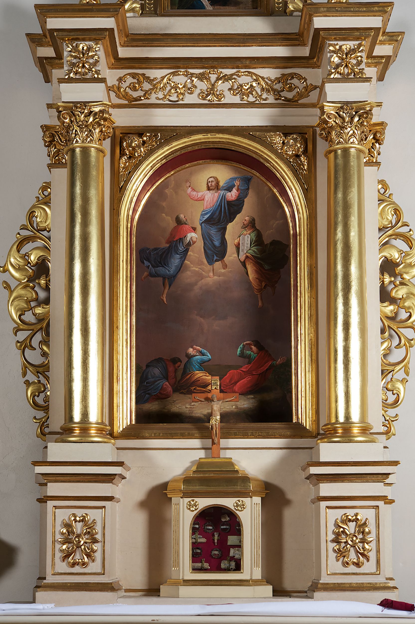 Struktura ołtarza w kolorze białym; profile, detale, ornamenty i kolumny złocone.