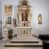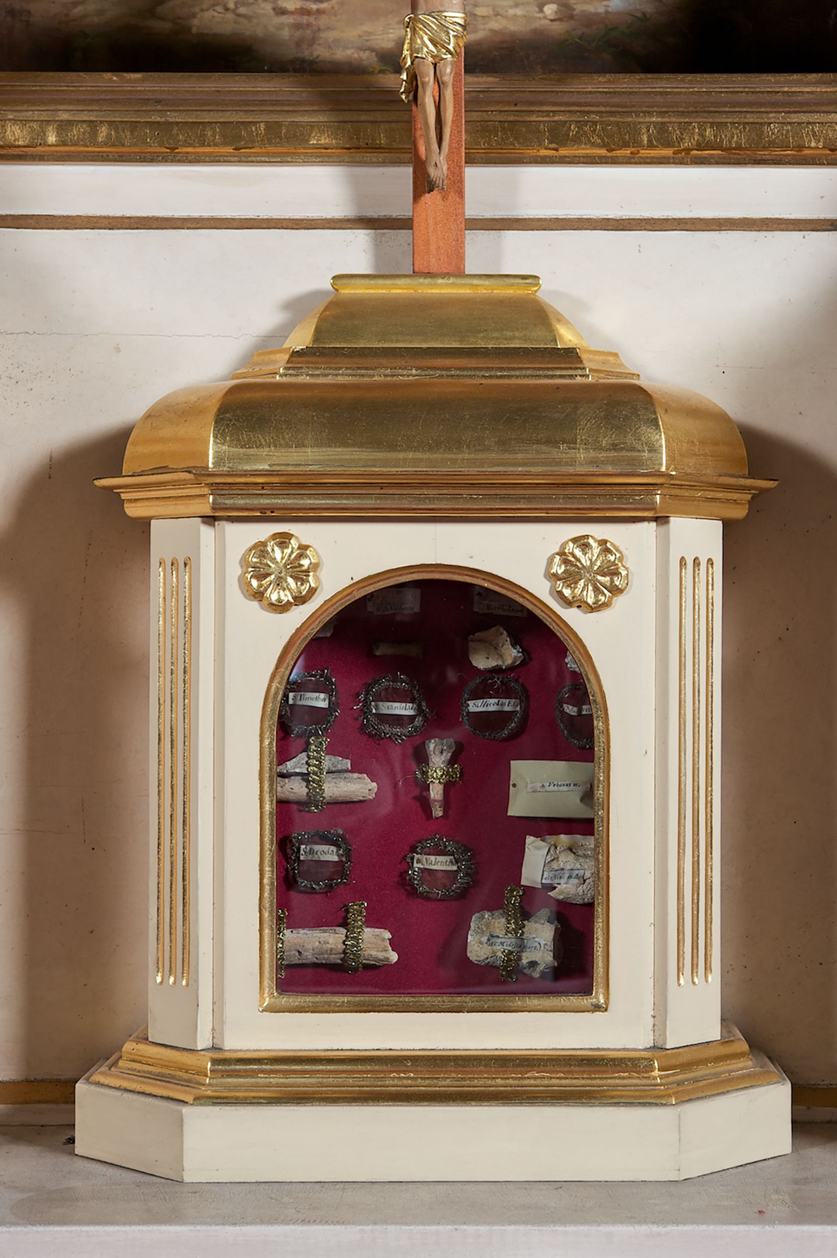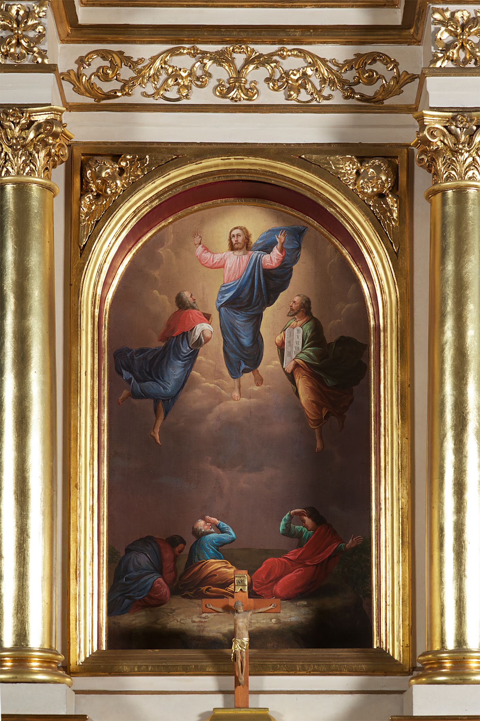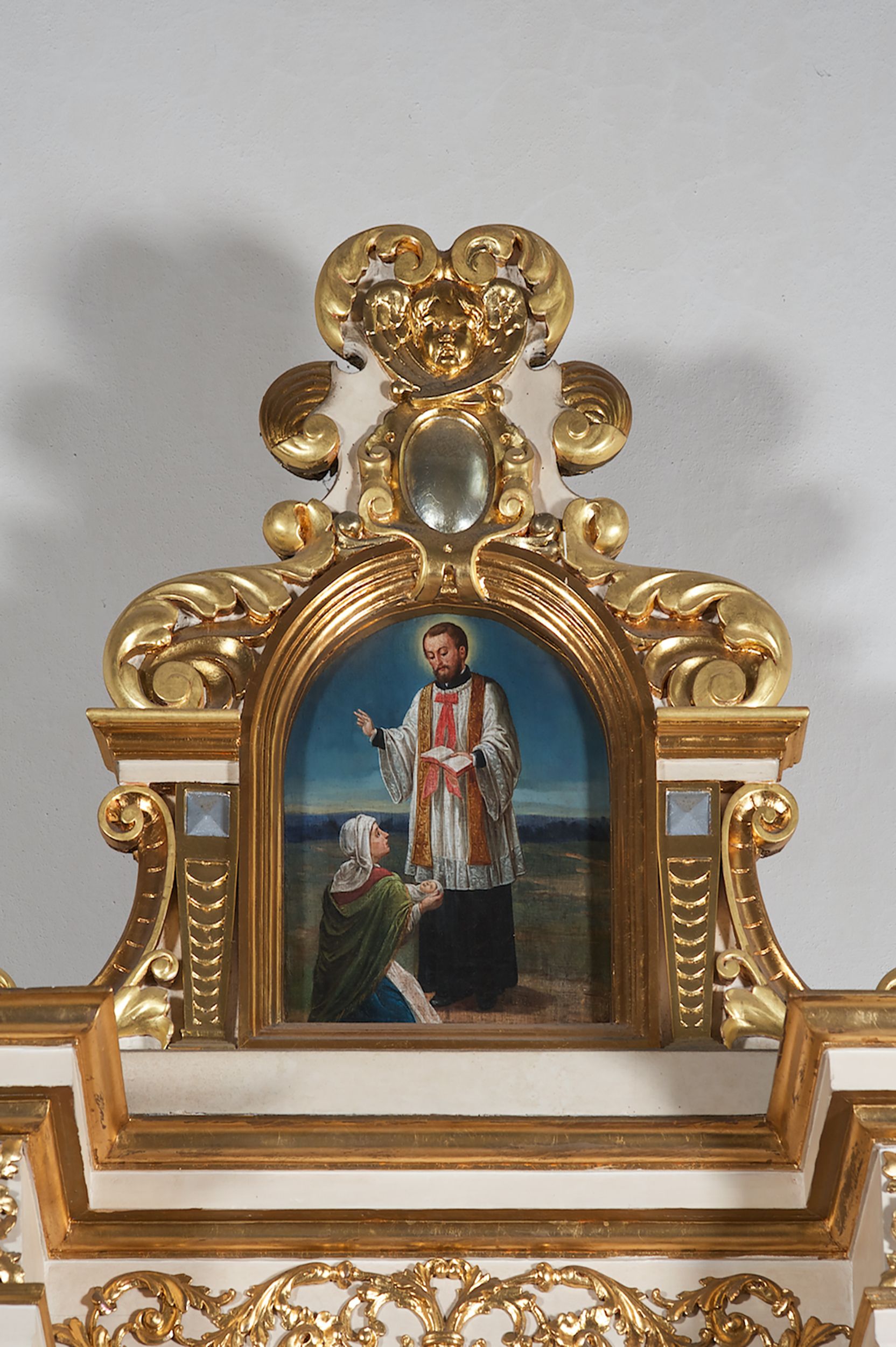 Struktura ołtarza w kolorze białym; profile, detale, ornamenty i kolumny złocone.