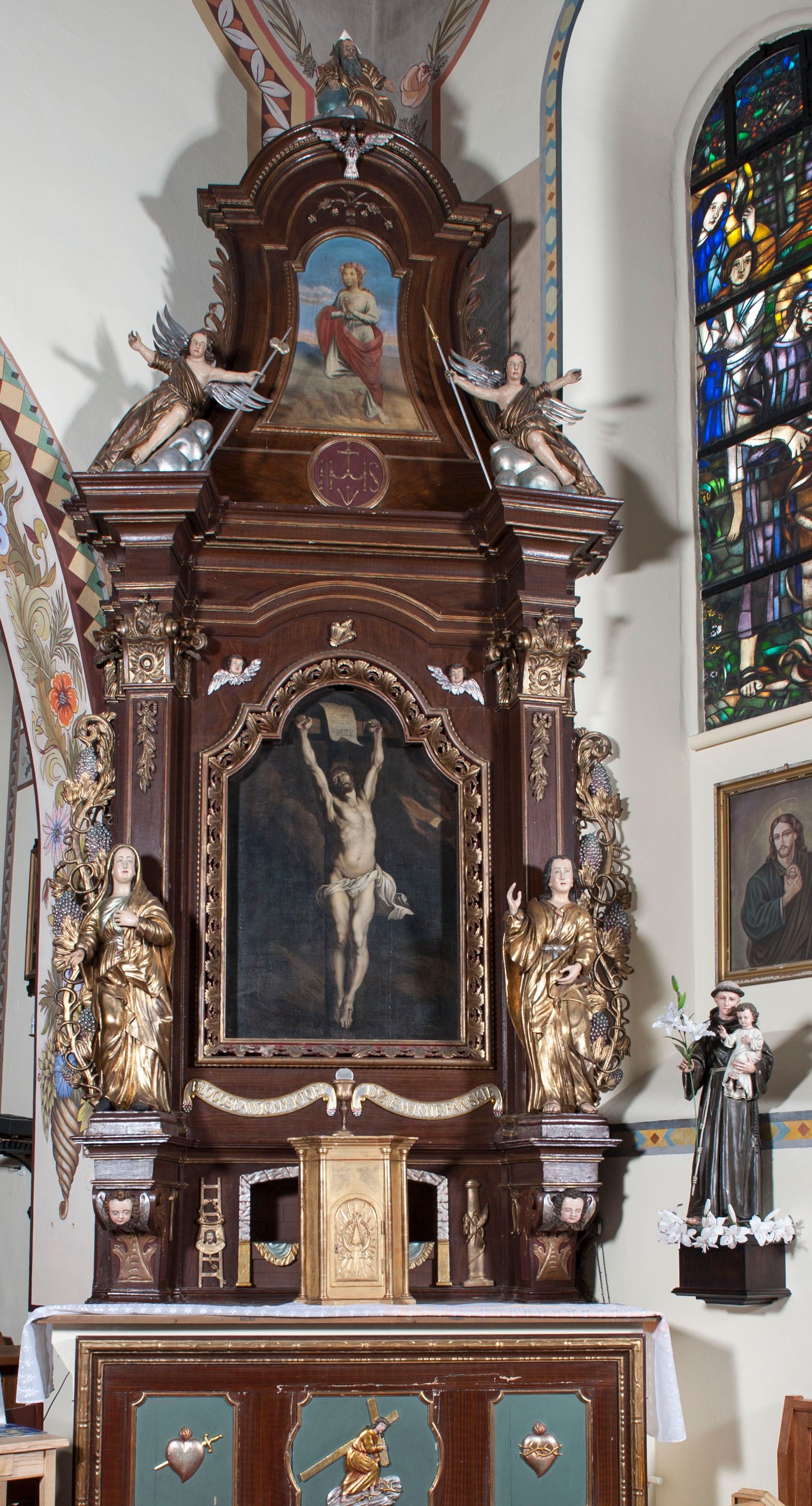 Ołtarz architektoniczny, jednoosiowy, z wydzieloną predellą, jednokondygnacyjny, ze zwieńczeniem. Mensa drewniana na skrzyniowej prostopadłościennej tumbie. Antependium w prostokątnej profilowanej ramie zdobione trzema płycinami, w których pośrodku płaskorzeźbione przedstawienie Chrystusa upadającego pod krzyżem, po bokach motywy serca. Nastawa ujęta kwadratowymi w rzucie filarami przyściennymi o kanelowanych trzonach, z kompozytowymi kapitelami, dźwigającymi występującymi nad nimi uproszczone belkowanie i profilowany gzyms, przerwany nad polem środkowym. Na tle filarów ustawione na konsolach rzeźby: Matka Boska Bolesna po lewej i św. Jan Ewangelista po prawej stronie. W polu środkowym barokowy obraz z przedstawieniem Ukrzyżowania w ozdobnej ramie. W przyłuczach ramy uskrzydlone główki aniołków. Poniżej obrazu nałożony motyw kielicha, po bokach dwie banderole z inskrypcją: BŁOGOSŁAWIONY KTÓRY / IDZIE W IMIĘ PAŃSKIE. Zwieńczenie w kształcie aedikuli o wklęsłych bokach, zamkniętej łukiem półkolistym nadwieszonym. W polu zwieńczenia obraz ukazujący św. Rozalię. Na gzymsie koronującym rzeźbione przedstawienie Boga Ojca oraz Gołębica Ducha Świętego. Poniżej obrazu medalion ze złoconymi literami: IHS. W osiach podpór dwa uskrzydlone anioły trzymające Arma Christi (trzcinę z gąbką i włócznię). Nastawa flankowana ażurowymi, płasko rzeźbionymi uszami w formie wici winnej latorośli z kiściami gron i liśćmi. Struktura malowana na kolor brązowy, rzeźby, detale architektoniczne i ornamenty złocone lub srebrzone, część laserowana.
