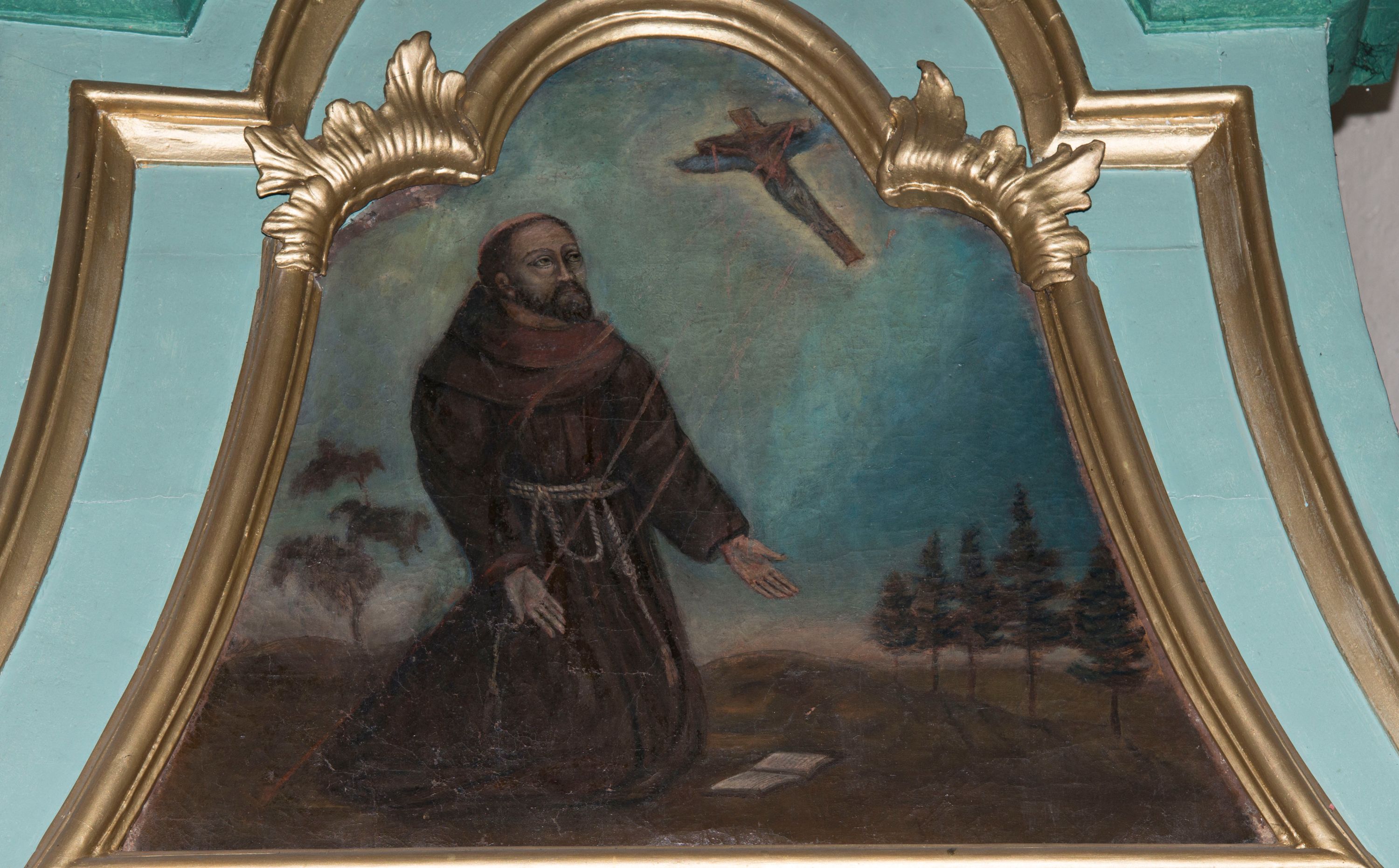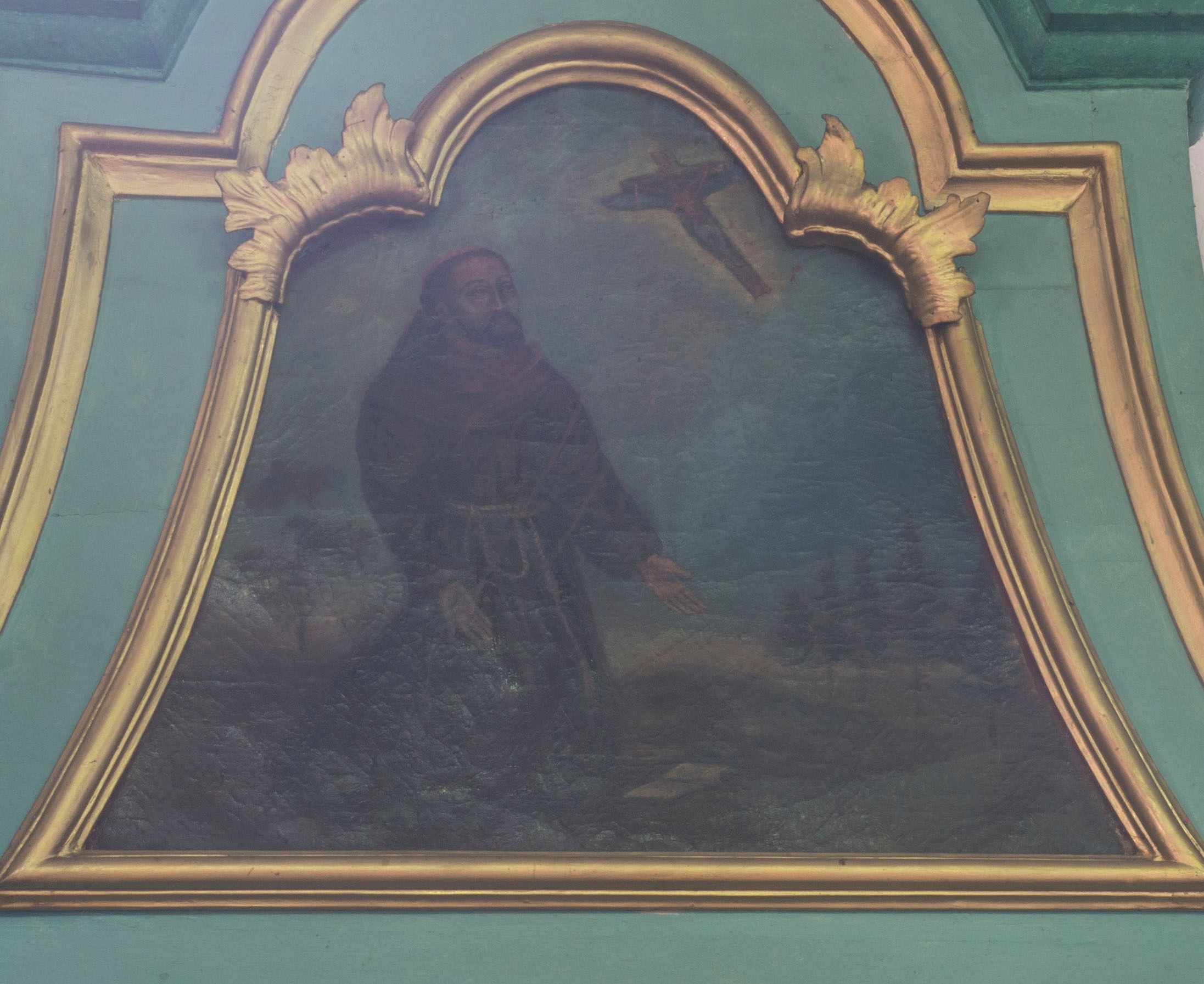 Struktura polichromowana w odcieniach zieleni. Detal architektoniczny i ornamentyka złocone i srebrzone.