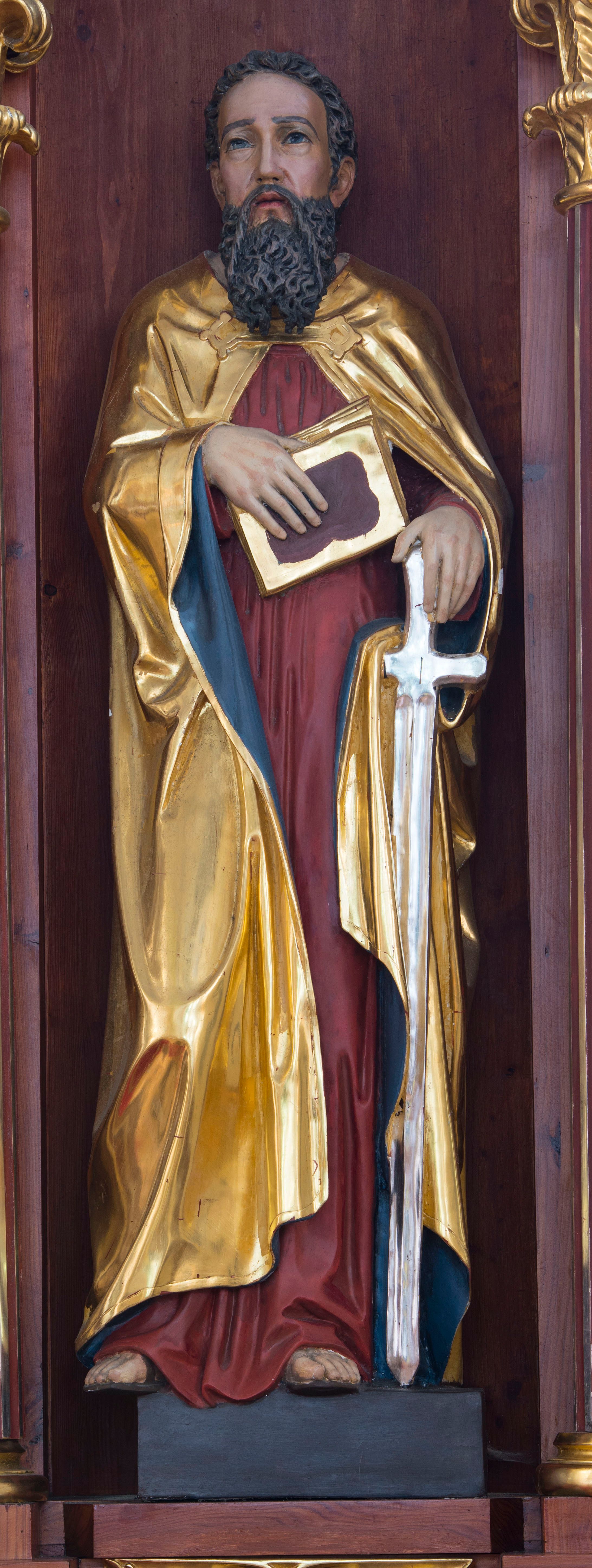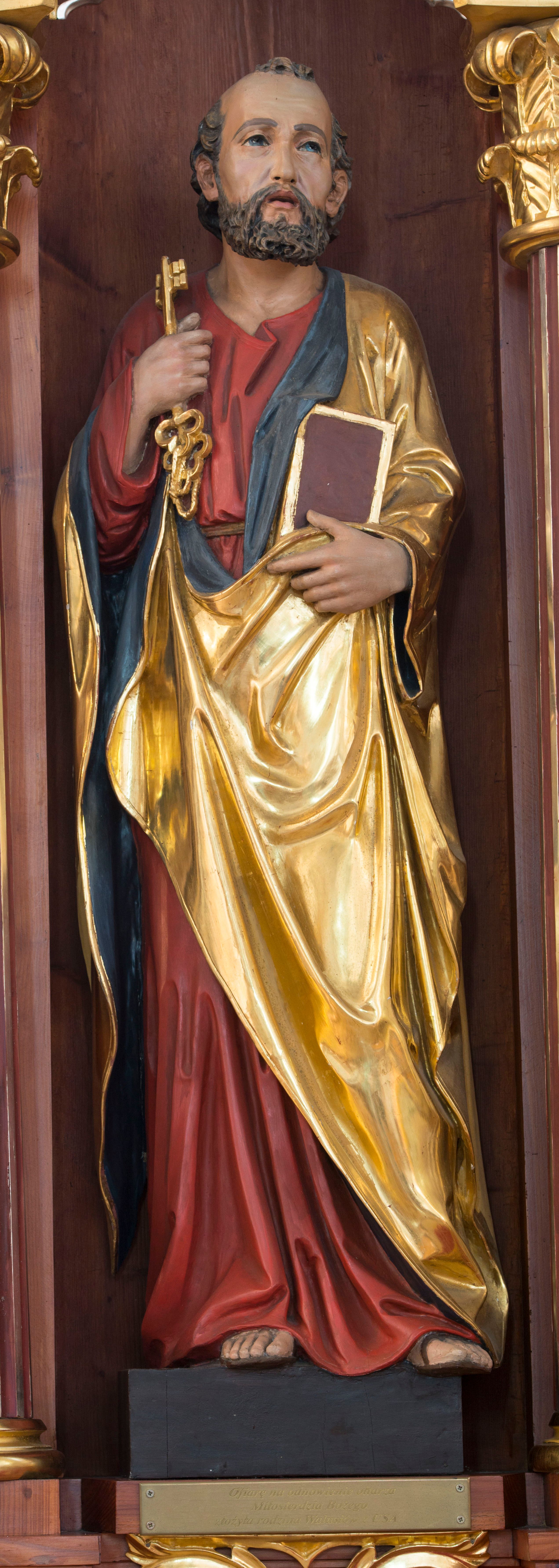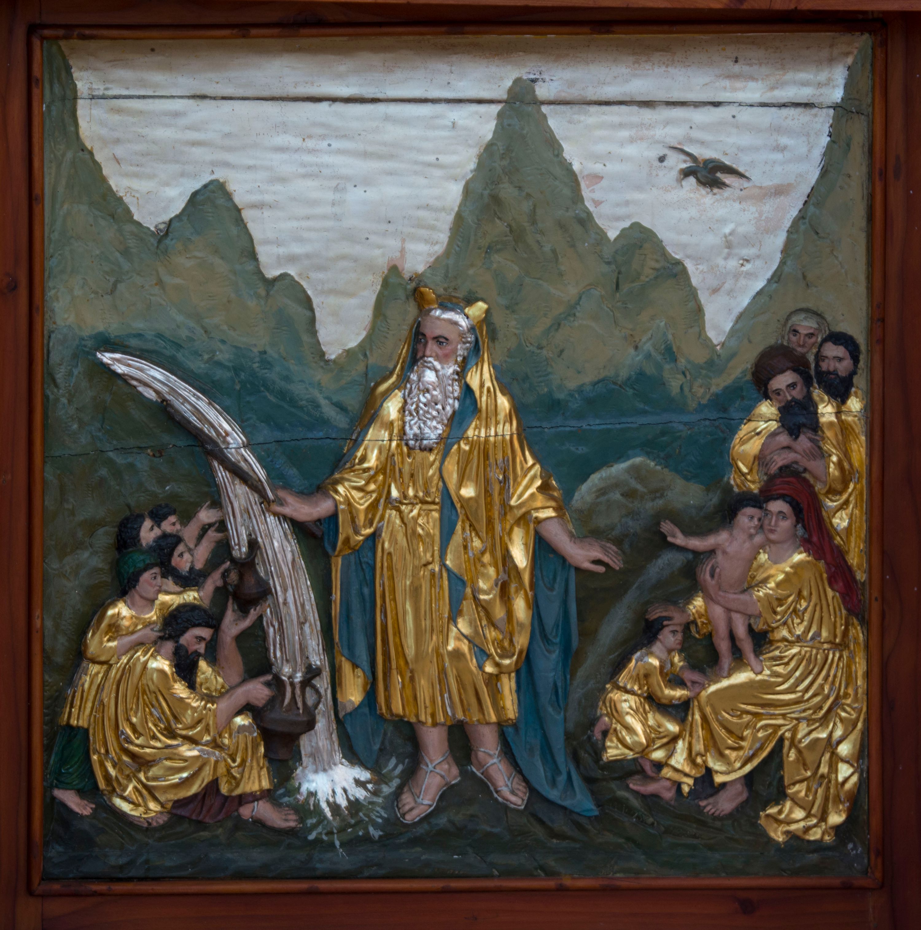 Przyścienną nastawę architektoniczną, trójosiową wykonano z drewna modrzewiowego. Jest to konstrukcja jednokondygnacyjna w formie łuku triumfalnego ze zwieńczeniem, ustawiona na dwustrefowym cokole. Stipes ołtarzowy uzyskał formę leżącego prostopadłościanu flankowanego po bokach spływami wolutowymi. W stipesie od przodu we wnęce pomiędzy dwoma pilastrami podtrzymującymi mensę umieszczono płaskorzeźbę z przedstawieniem Mojżesza wyprowadzającego wodę ze skały. Trzony pilastrów ozdobiono płaskorzeźbionym i złoconym ornamentem roślinnym. Na mensie na osi ustawiono