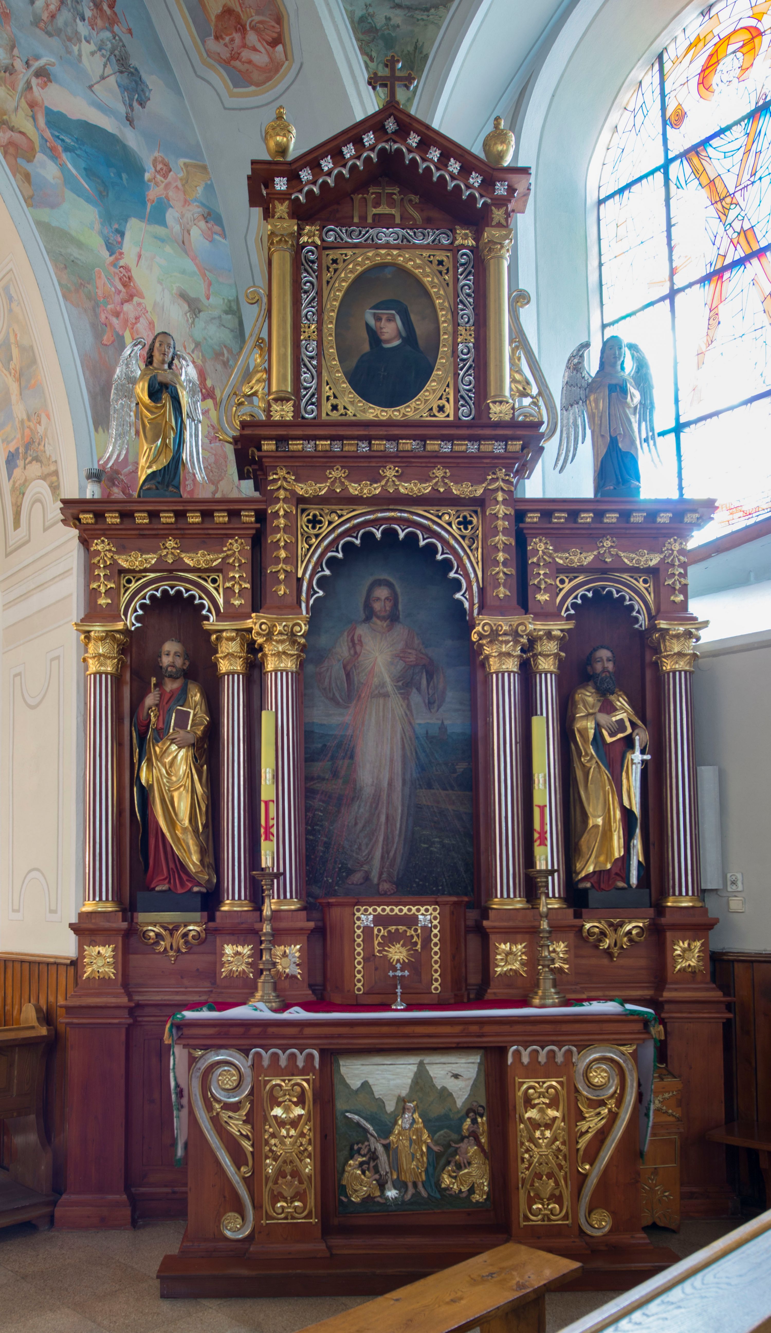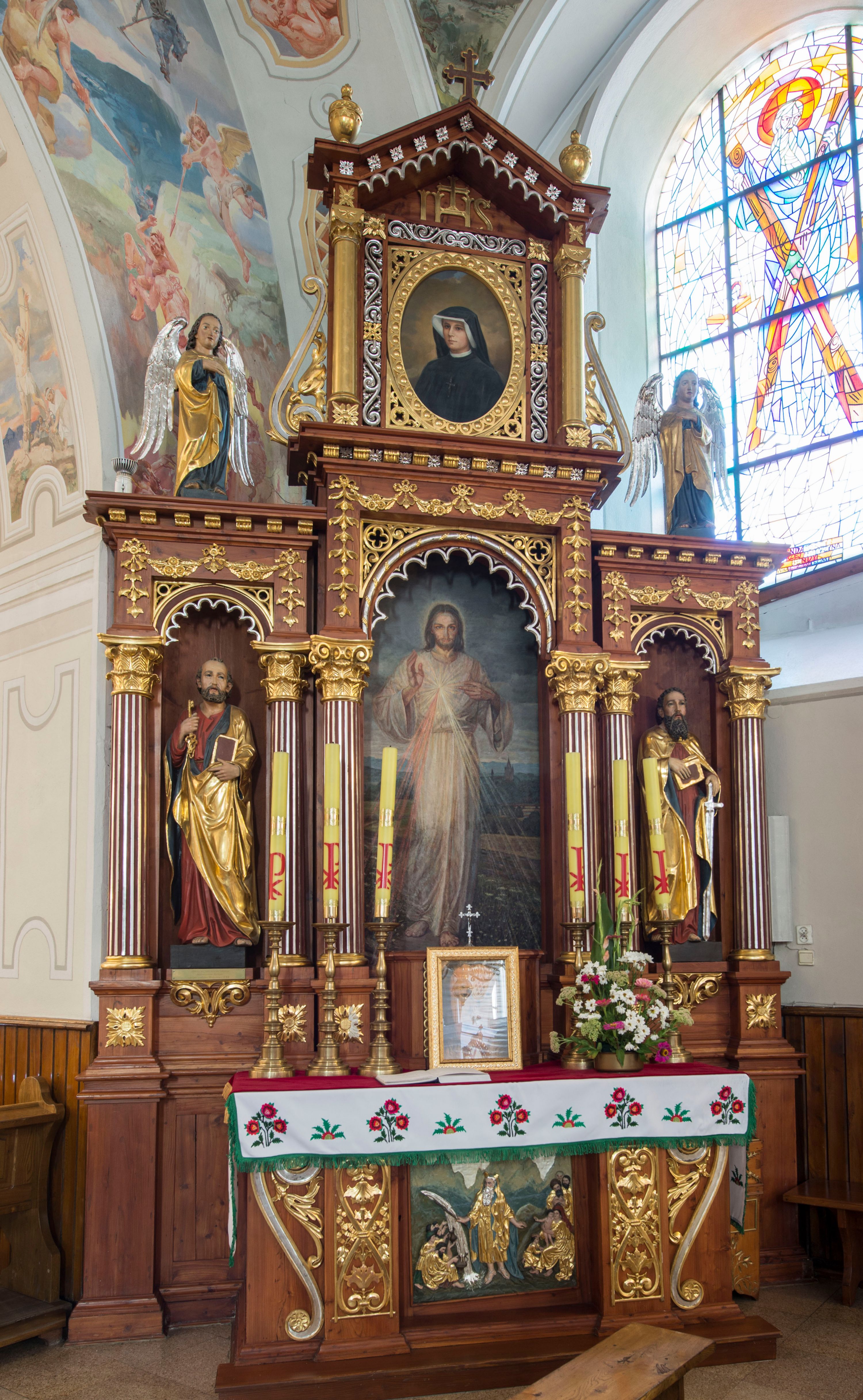 tabernakulum w formie leżącego prostopadłościanu o ściętych narożach, na niskim cokole, z profilowanym, niewielkim gzymsem, flankowanym na narożach pilastrami. Ścianka frontowa obwiedziona została rzędem złoconych okręgów. Na drzwiczkach umieszczono symbol Opatrzności Bożej od góry ujęte półkolistym łukiem. Oś środkową nastawy wydzielają dwie kolumny o kapitelach kompozytowych i kanelowanych trzonach dźwigających wydłużone imposty. Kolumny zostały połączone nad polem środkowym fryzem i gzymsem. Pole środkowe wypełnia nisza w formie stojącego prostokąta zamkniętego łukiem półkolistym z arkaturą z figurą św. Antoniego Padwy oraz dwoma obrazami na zasuwach - "Niewiasty idące z Golgoty" oraz "Miłosierdzie Boże". W osiach zewnętrznych usytuowano niższe flankowane kanelowanymi kolumnami z kapitelami kompozytowymi, podtrzymującymi imposty połączone nad polem fryzem i gzymsem. Nisze uzyskały kształt stojącego prostokąta zamkniętego łukiem półkolistym z arkaturą z figurami apostołów św. Piotra i św. Pawła. Ponad niszami na belkowaniu usytuowano cokoły z figurami stojących aniołów ze złożonymi do modlitwy rękami. Zwieńczenie uzyskało kształt stojącego prostokąta flankowanego dwiema parami złoconych kolumienek, dźwigających imposty i gzyms nad polem środkowym wyłamanym w trójkąt. Po bokach widoczne są spływy wolutowe. Gzyms wieńczy krzyż i dwie złocone wazy. W polu zwieńczenia znajduje się rama w formie prostokąta z wpisanym owalem z obrazem św. Siostry Faustyny Kowalskiej. Ponad ramą widoczny jest chrystogram "IHS". Cokoły i imposty dekorowane zostały stylizowaną ornamentyką roślinną w postaci zwisów, kampanuli i girland. Struktura nastawy utrzymana jest w kolorze naturalnego drewna, natomiast ornamentyka, detale i profile zostały wyzłocone i wysrebrzone. Z kolei figury uzyskały naturalistyczną polichromię.