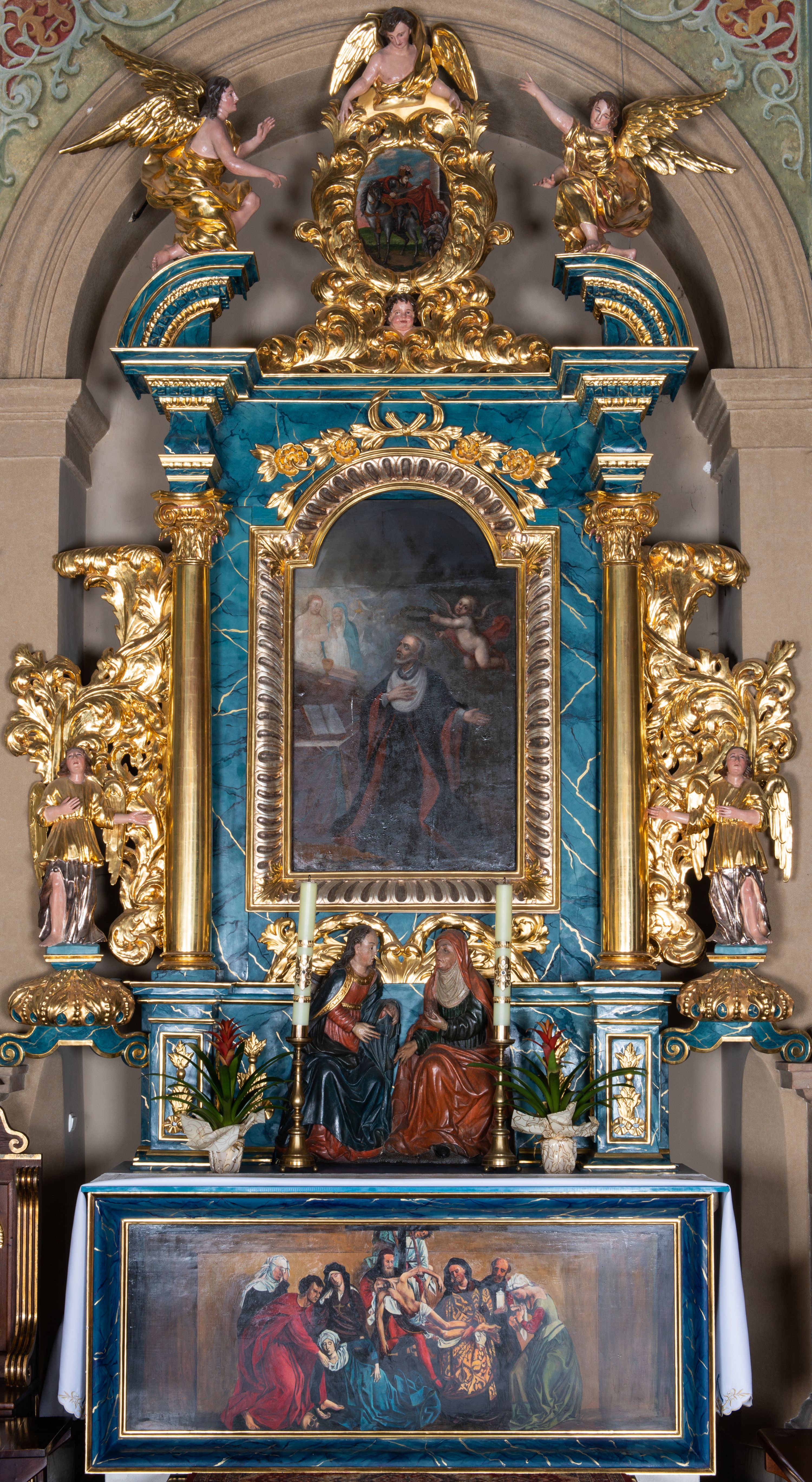 Ołtarz boczny św. Jana Kantego i św. Walentego w kościele parafialnym w Myślenicach powstał w XVII wieku. Struktura, o bujnej, akantowej ornamentyce nosi cechy dojrzałego baroku.