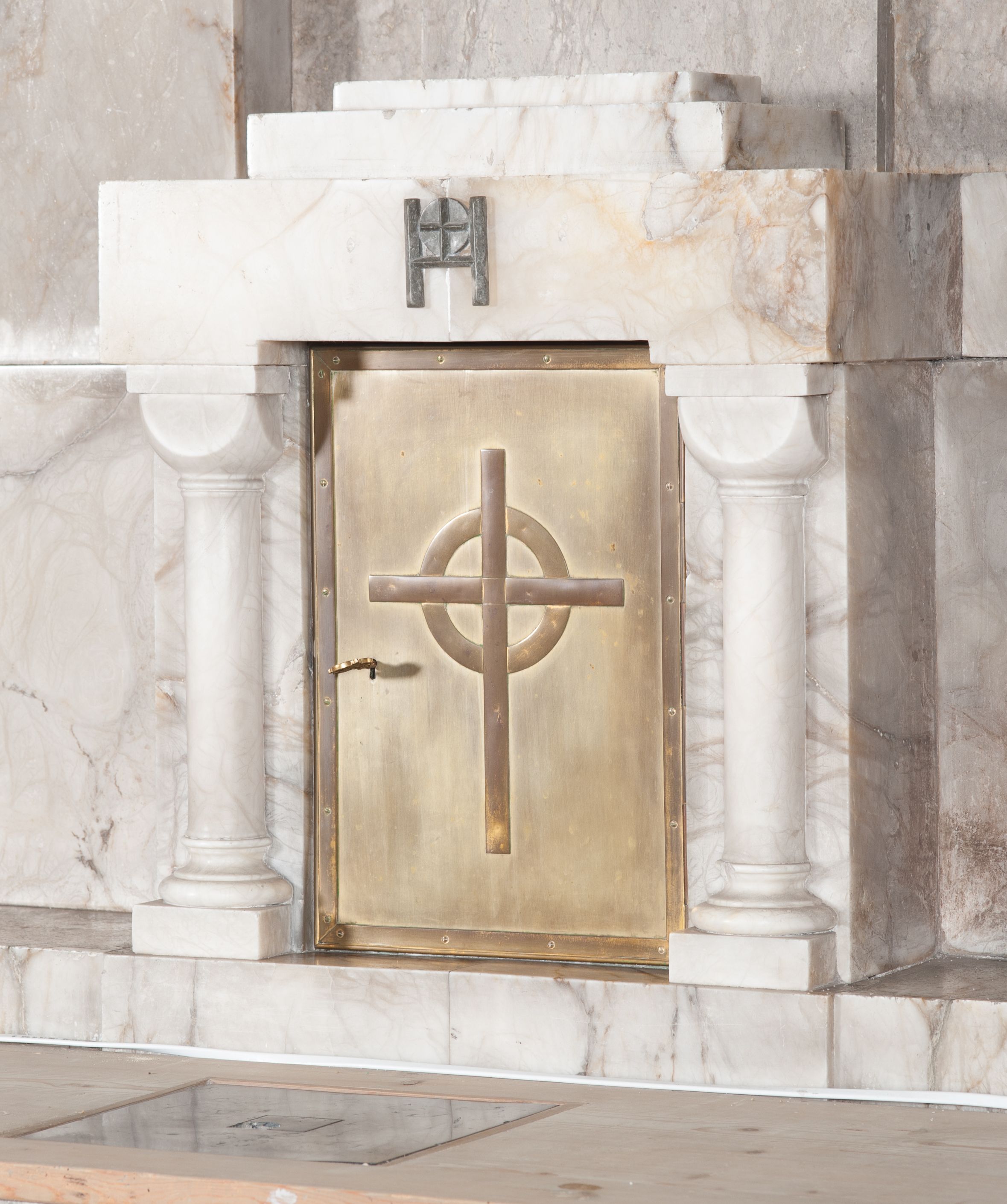 Ołtarz przyścienny, trójosiowy, jednokondygnacyjny, o formach architektonicznych, ustawiony na jednostopniowym podwyższeniu. Mensa kamienna, wsparta na dwóch półkolumnach o gładkich trzonach i kostkowych kapitelach z motywem krzyża greckiego. Antepedium gładkie, w formie alabastrowej płyty z umieszczonym centralnie metalowym krzyżem. Retabulum umieszczone na wysokim cokole. Oś środkowa nieco wyższa od osi skrajnych i wysunięta do przodu mieści zamkniętą półkoliście niszę z ustawioną na postumencie figurą przedstawiającą św. Józefa z Dzieciątkiem Jezus. Powyżej niszy litery „Α” (álfa) i „Ω” (oméga). W zwieńczeniu płaskorzeźbione przedstawienie kielicha z hostią ujętego wieńcem, w okrągłym polu zakończonym krzyżem. Osie skrajne nastawy nieco niższe, zwieńczone fryzem arkadowym. W osi ołtarza alabastrowe tabernakulum ujęte parą półkolumn o gładkich trzonach i kostkowych kapitelach. Drzwiczki metalowe z motywem krzyża.